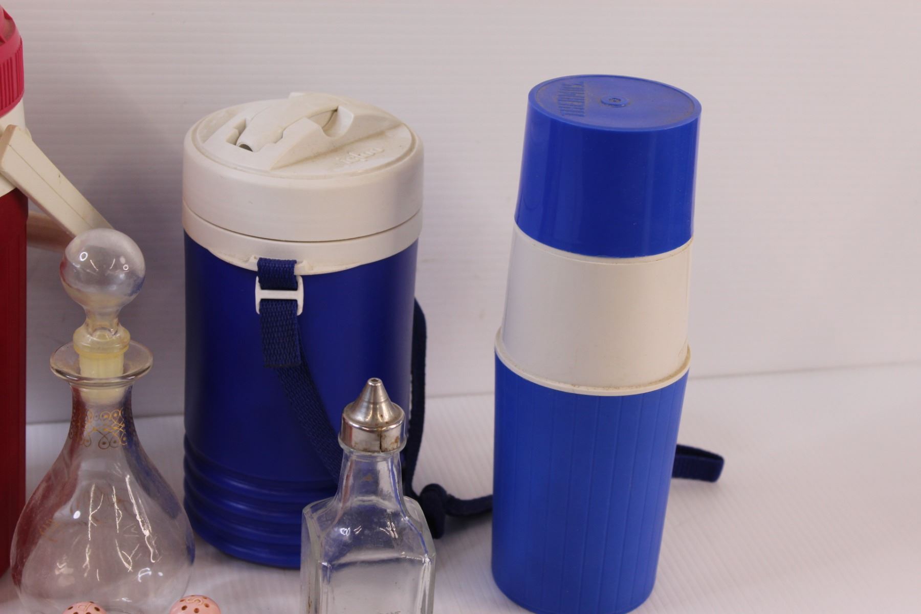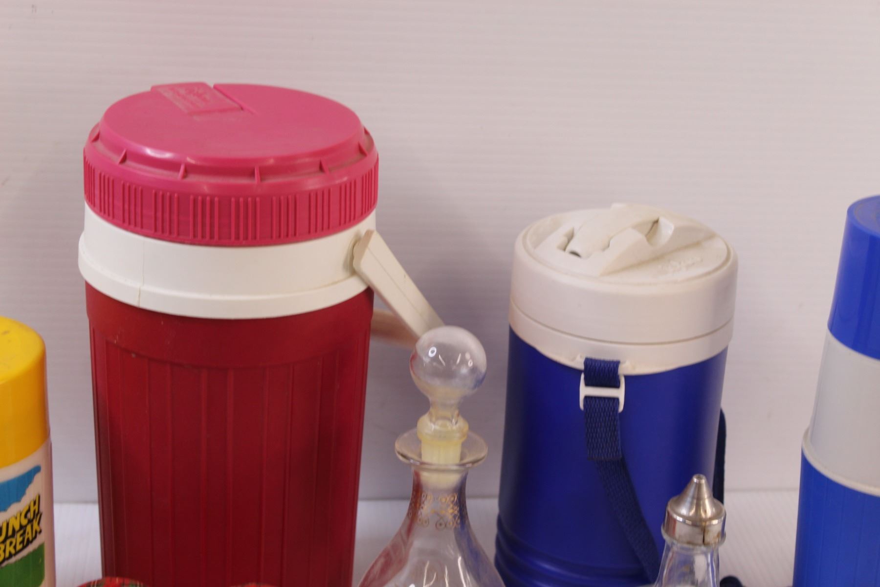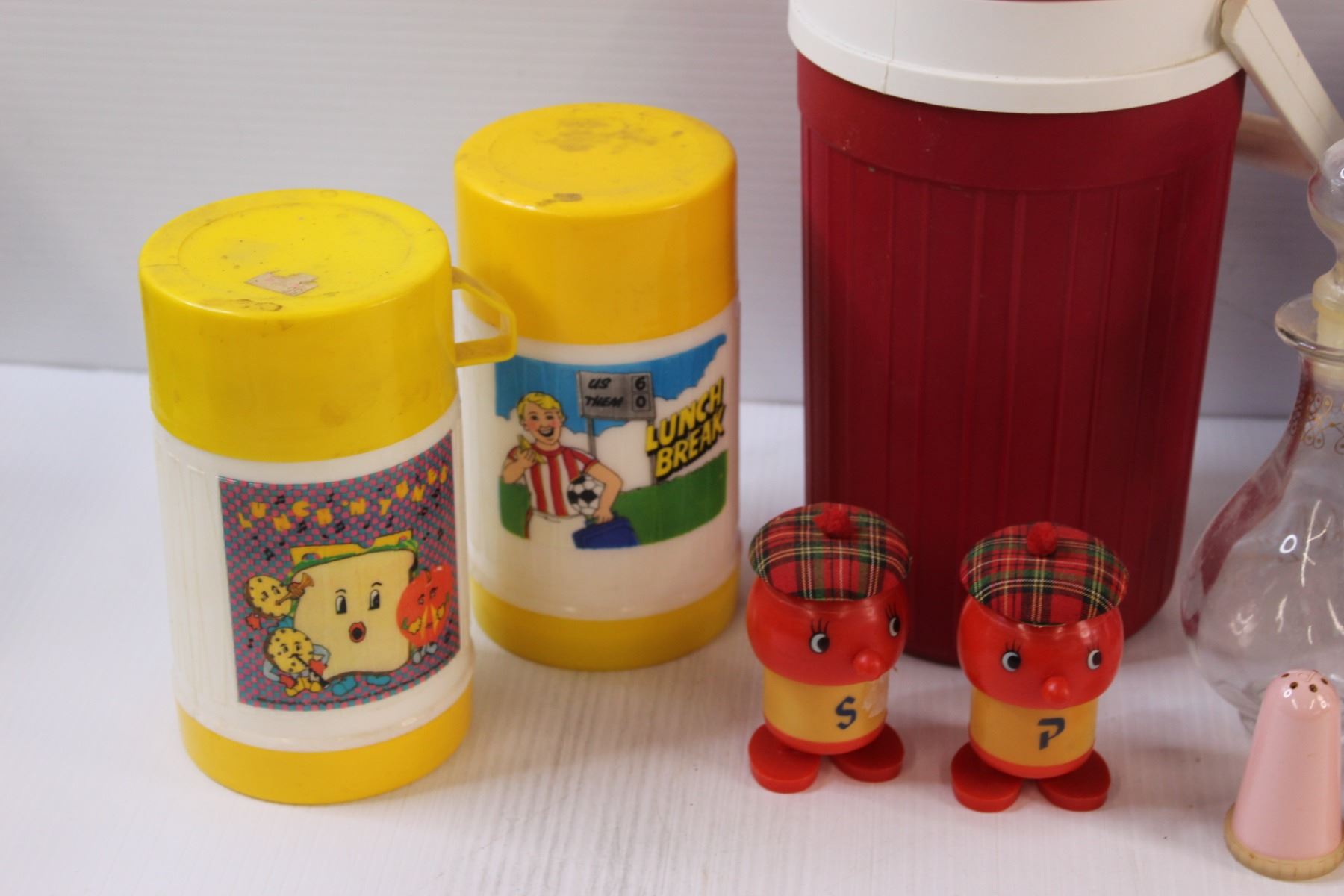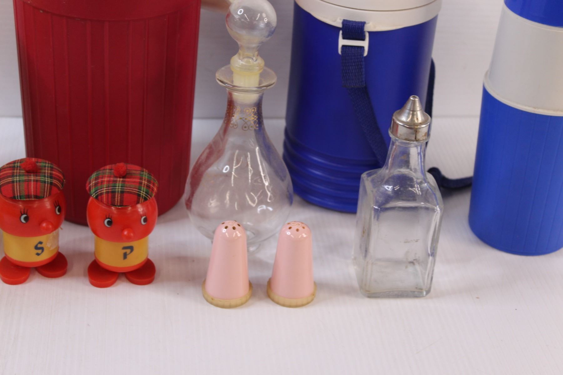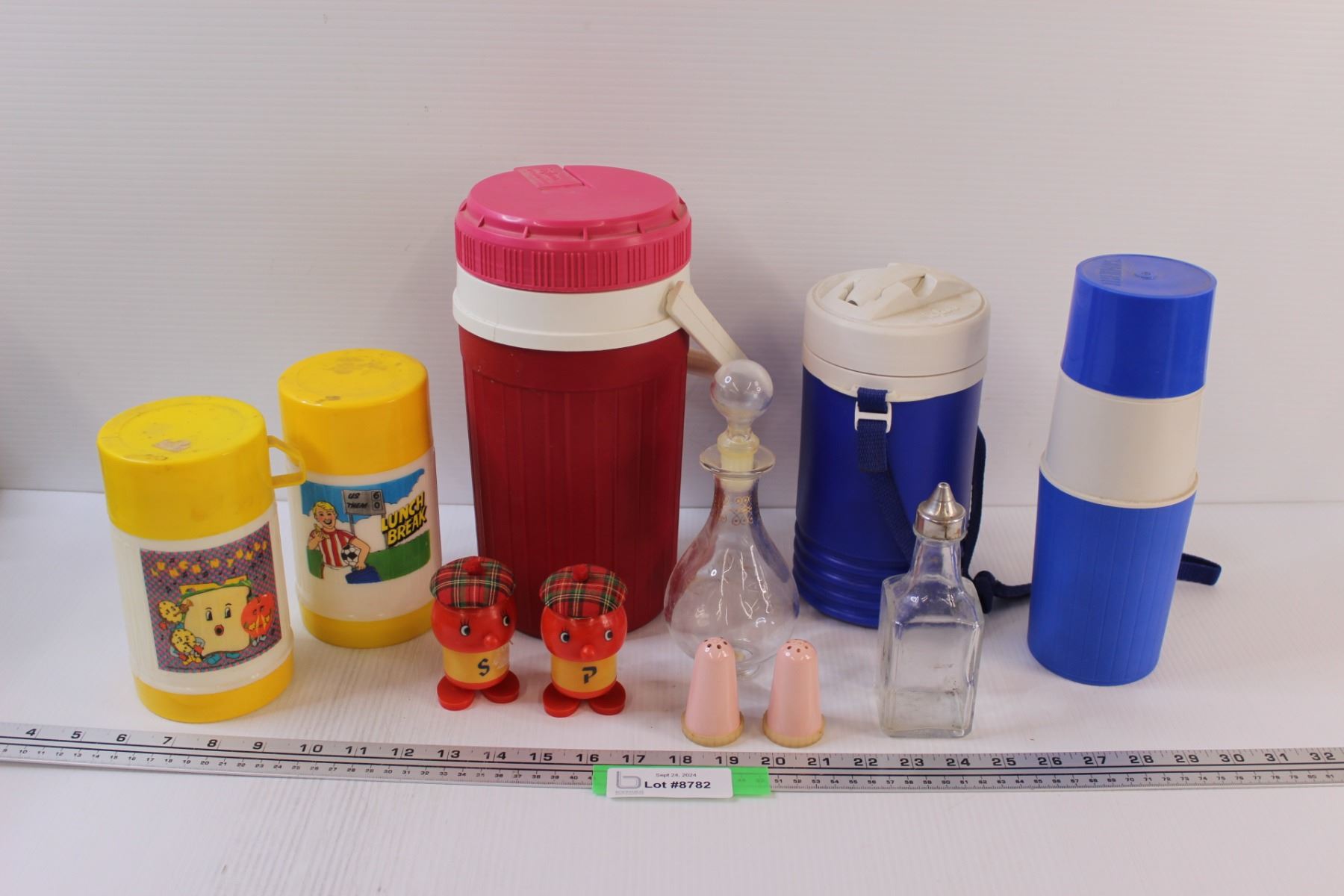 (4) Assorted Thermos, (2) Salt & Pepper Shakers, (2) Vinegar Jars