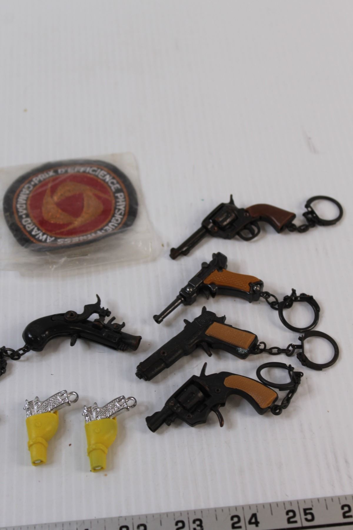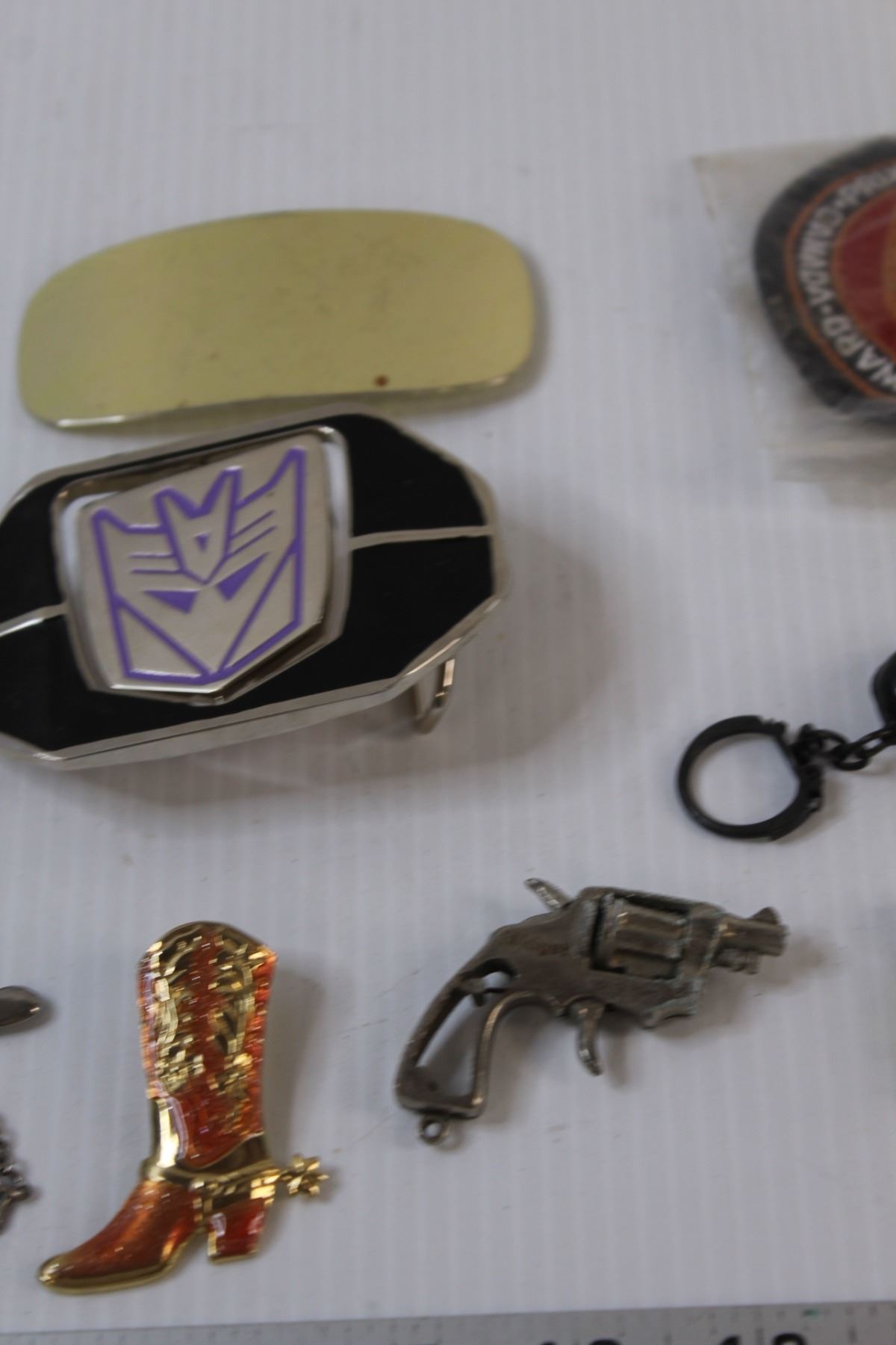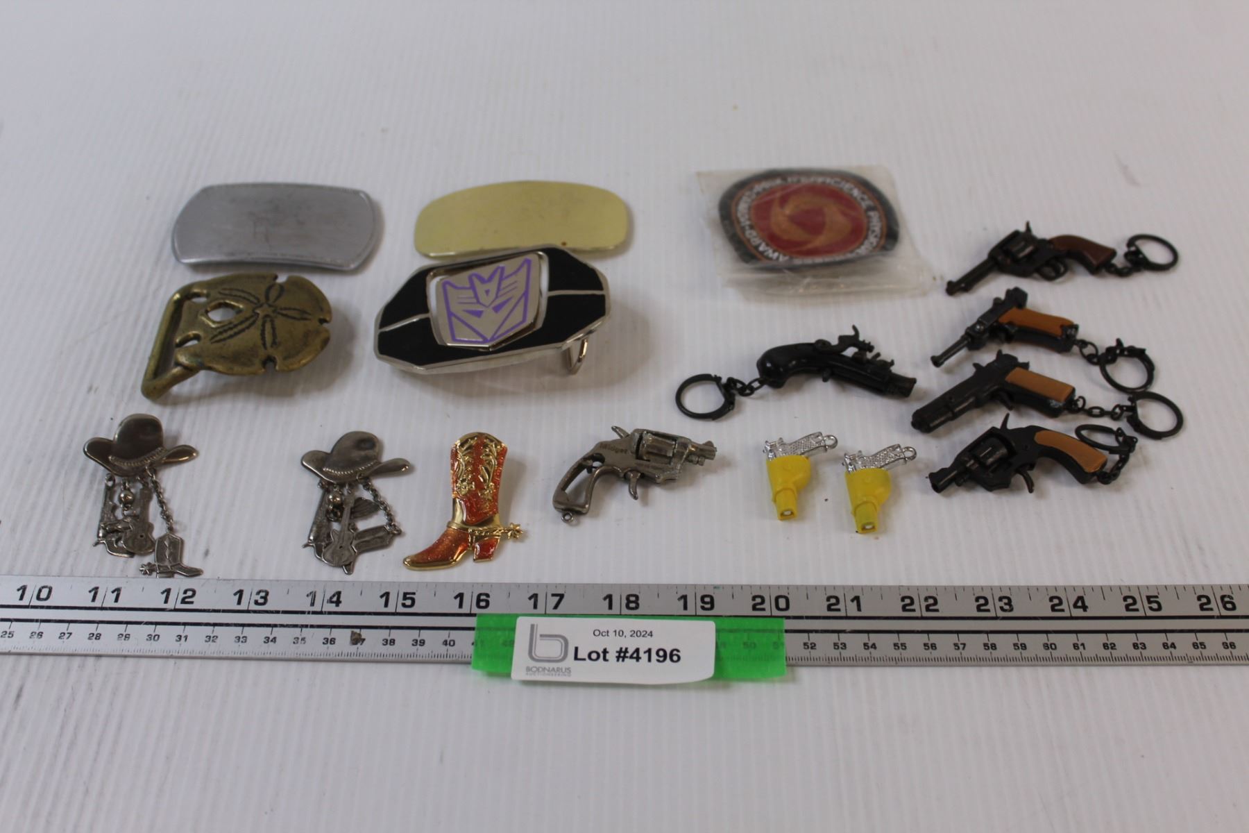 (4) Belt Buckles, Cowgirl Earrings, Keychain Replica Guns, Badge, Misc.