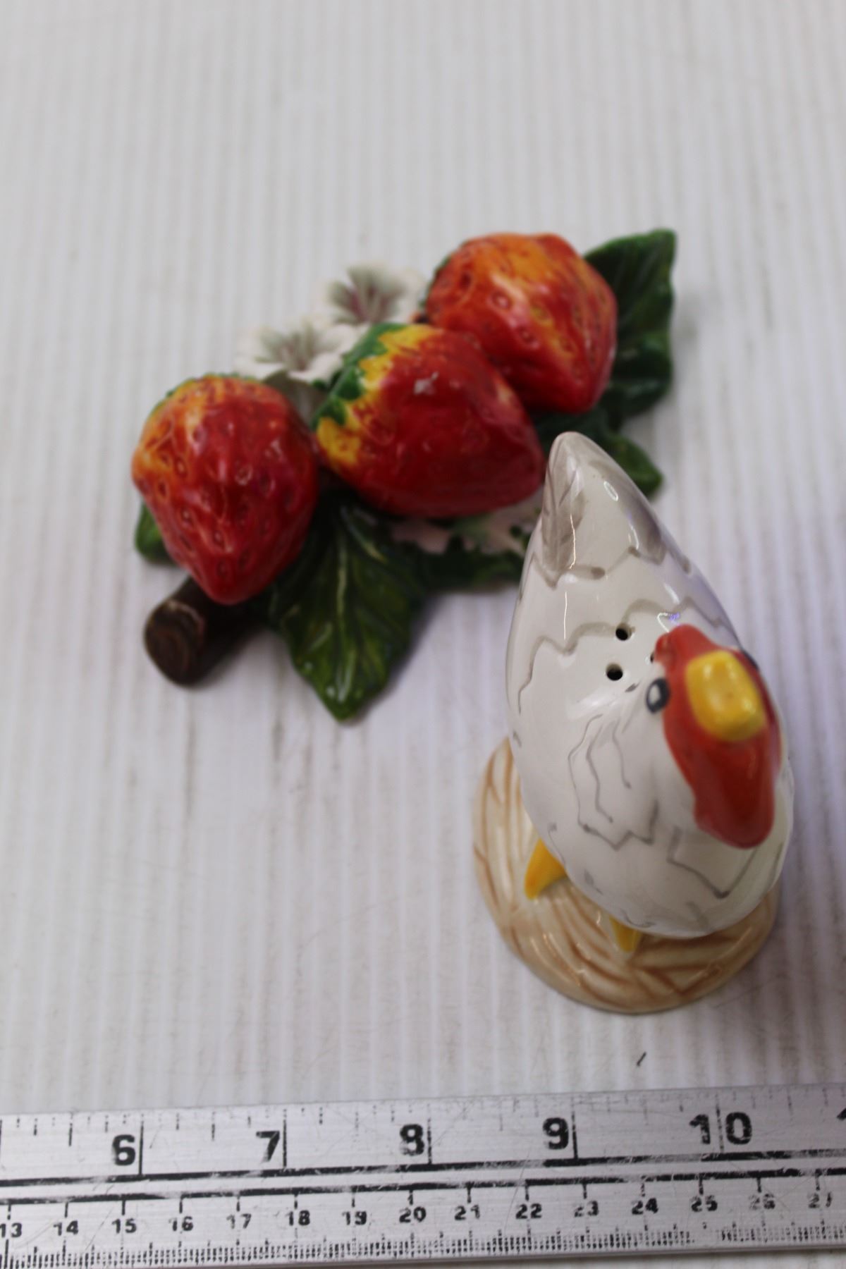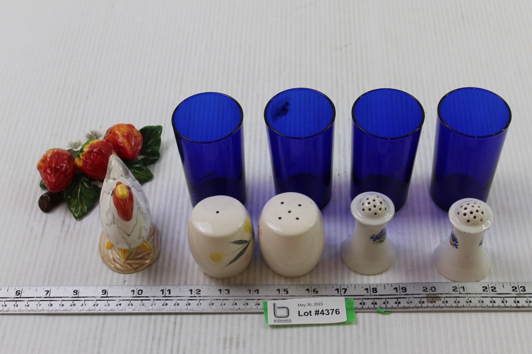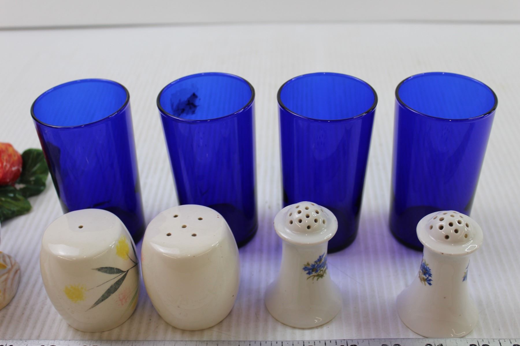 (4) Blue Cups+(5) Salt and Pepper Shakers+ Strawberry Decoration