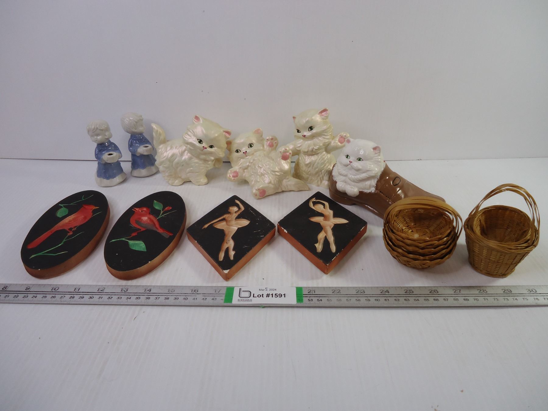 (4) Ceramic Kitten Ornaments,(4) Ceramic Wall Hangers,(2) Boy/Girl Mini Tapper Candleholders and (8) Very Small Wicker Baskets