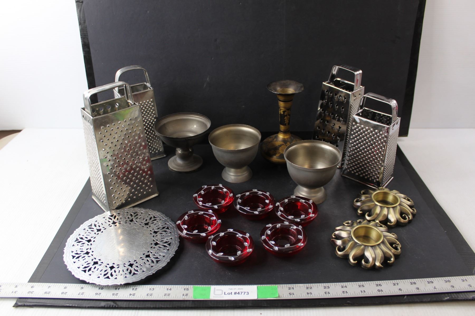 (4) Cheese Graters, (9) Candleholders- Indian Brass, Glass, Other, Misc.