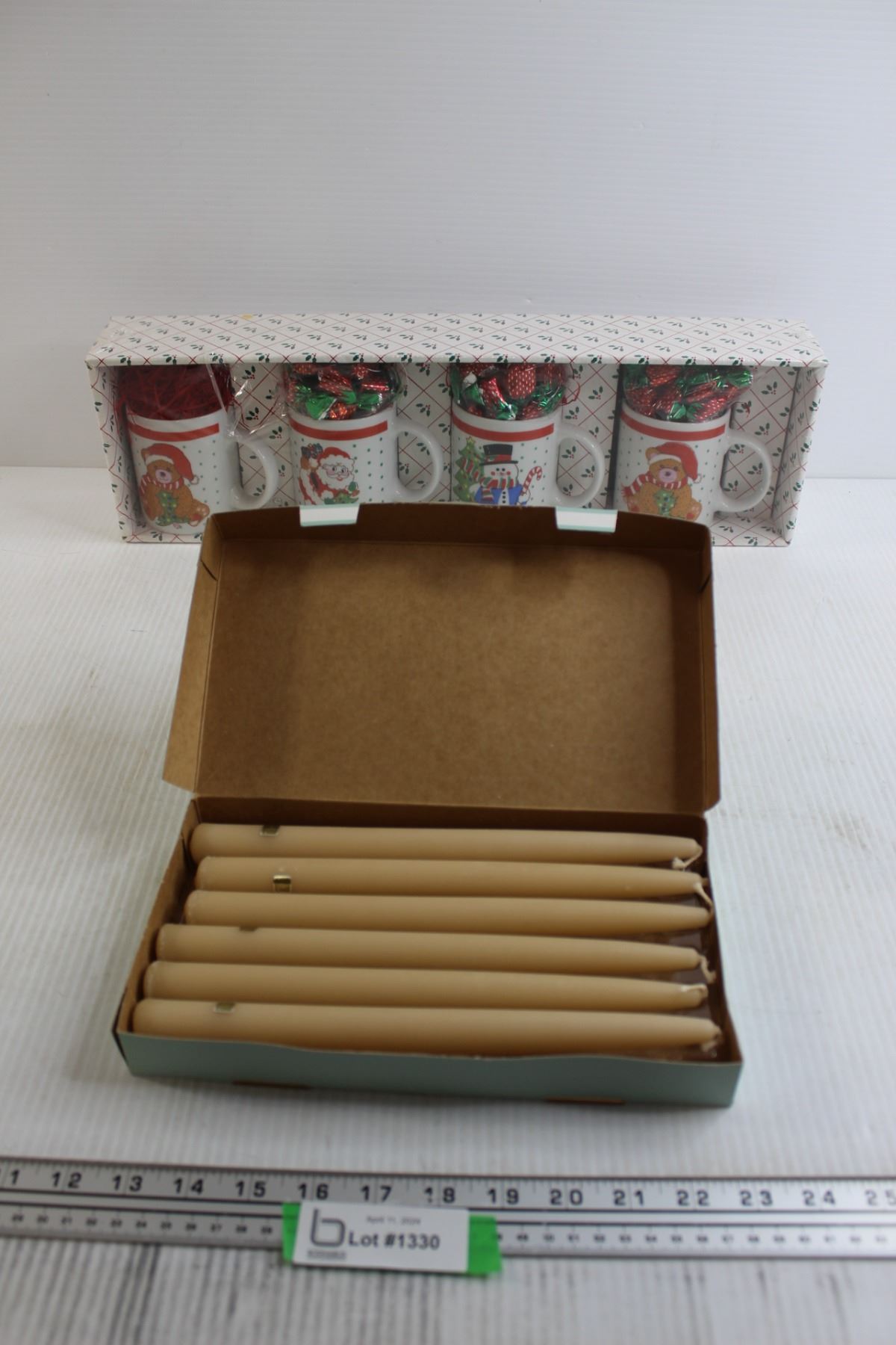 (4) Christmas Mugs - Sealed, (6) Party Lite Candles