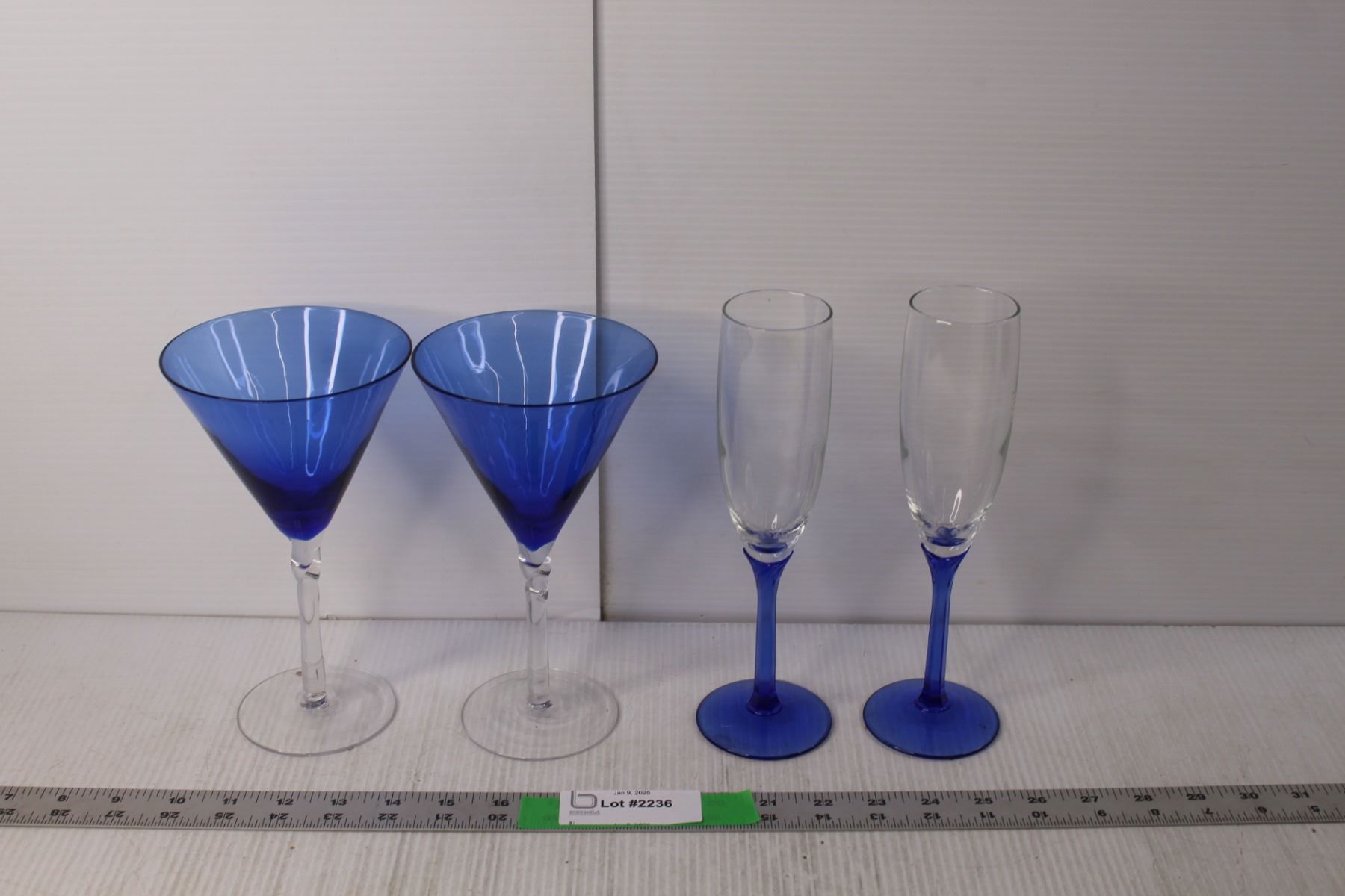 (4) Cobalt Blue Stemware Glasses - Champagne Flutes and Martini Glasses