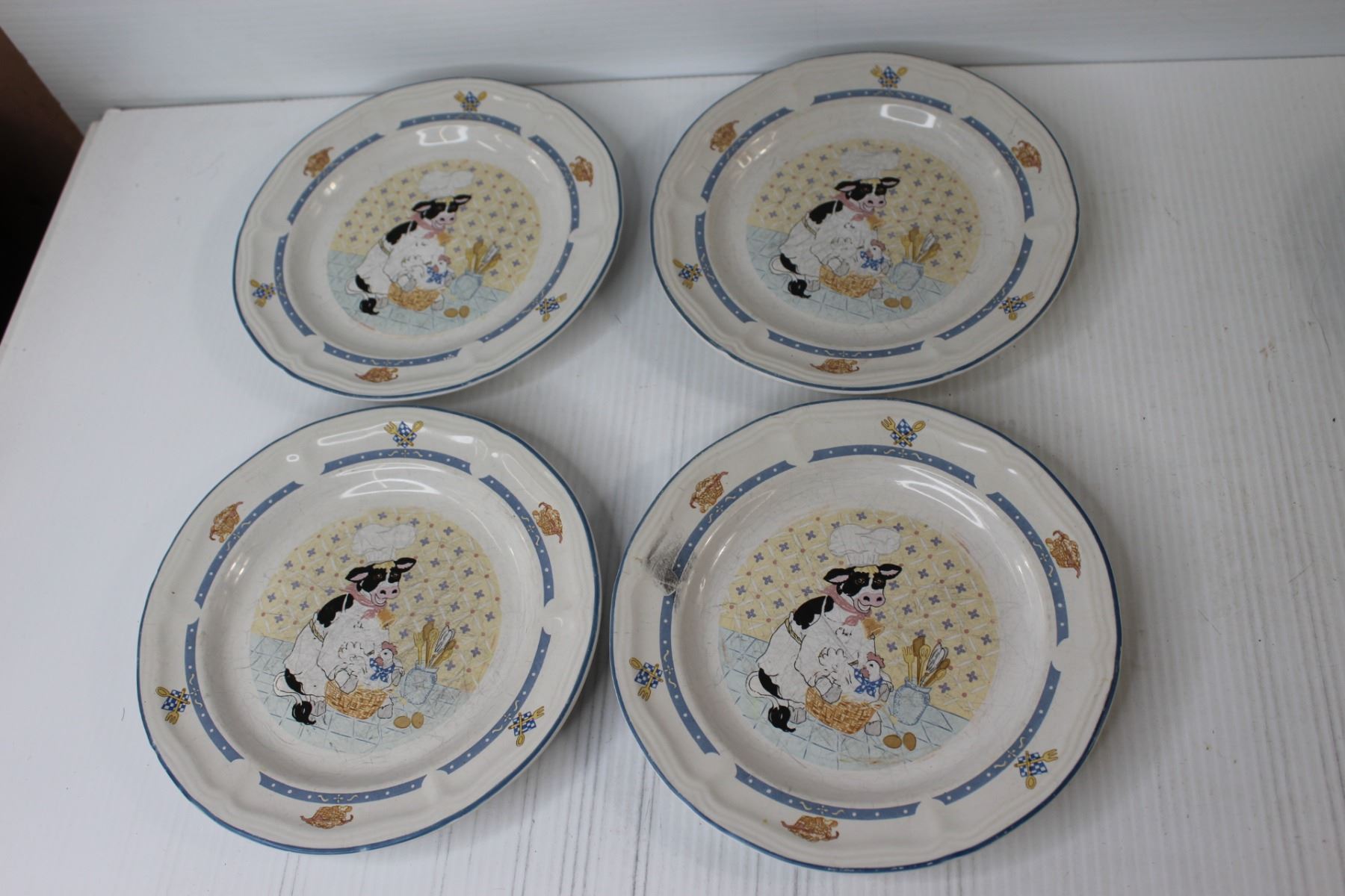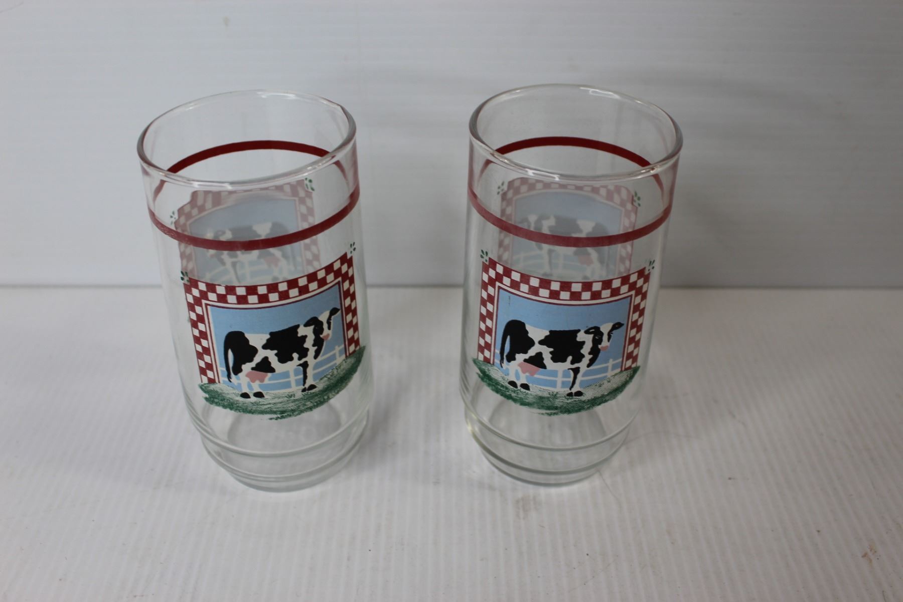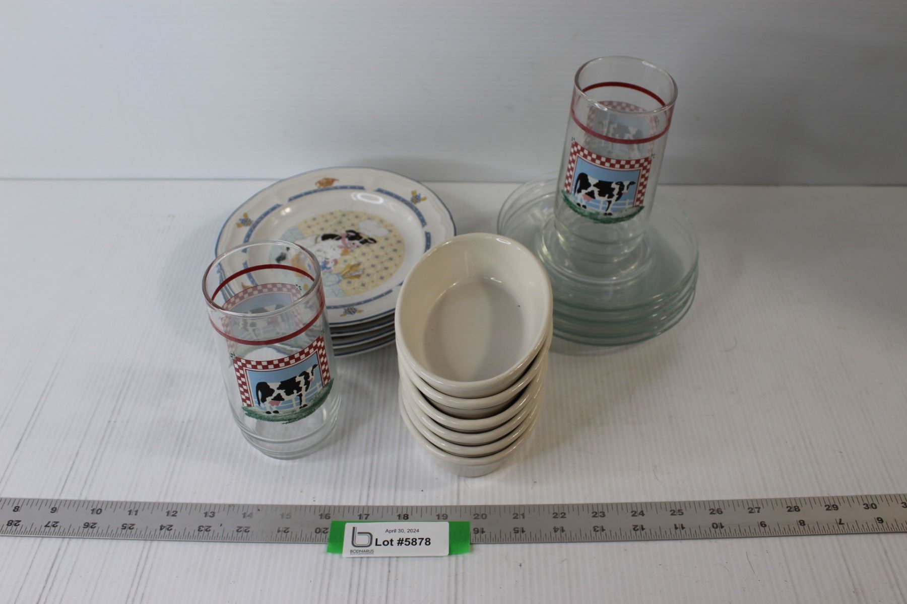 (4) Cow Themed Plates, (7) Clear Glass Plates, (2) Cow Themed Glasses, (6) Oval Earthenware Bowls