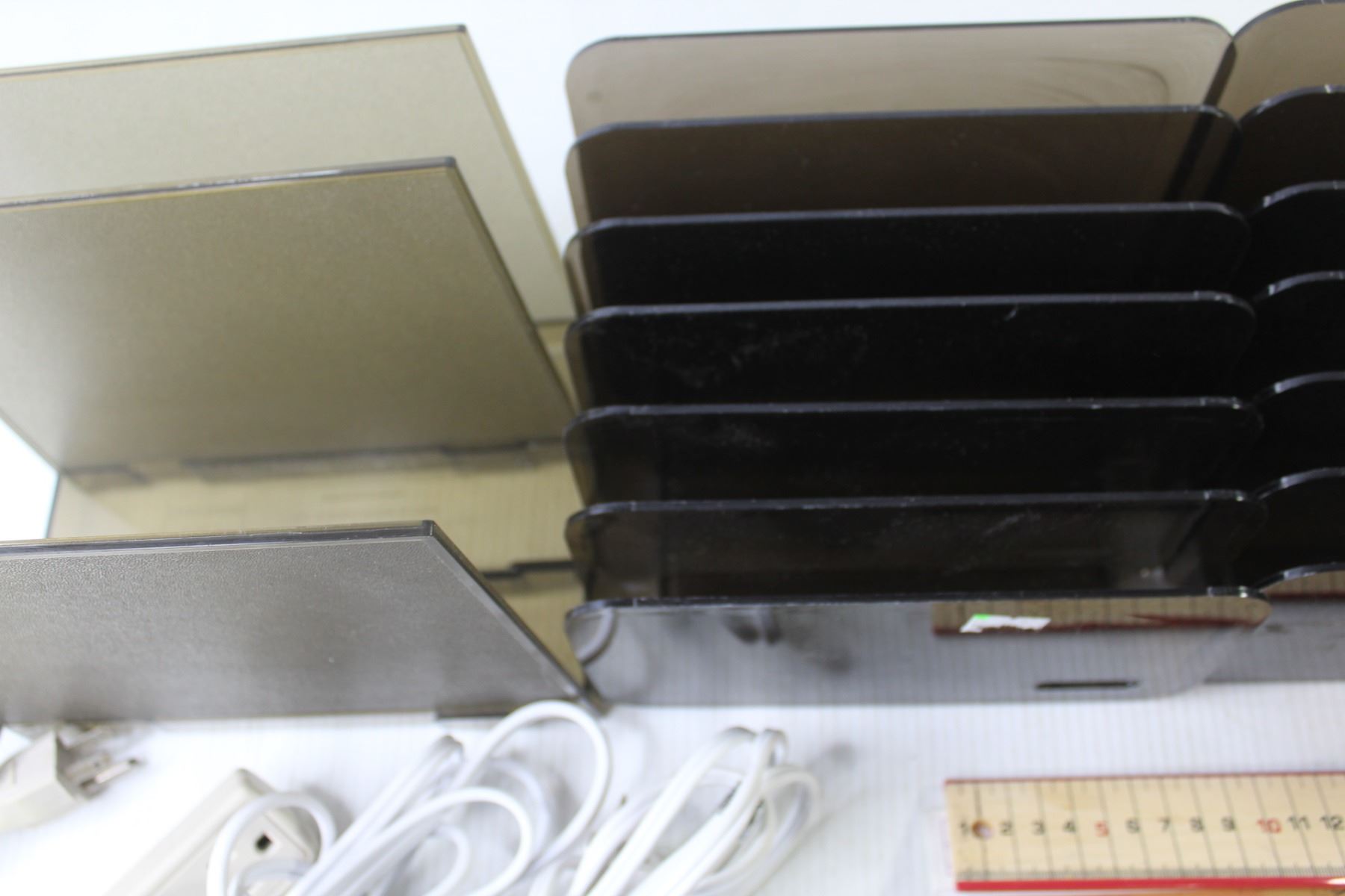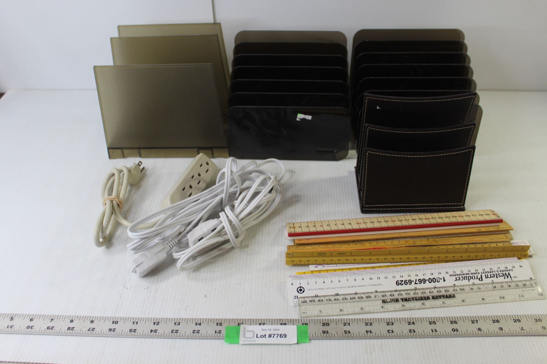 (4) Desk File Organizers, Assorted Rulers, (3) Multi-Outlet Extension Cords
