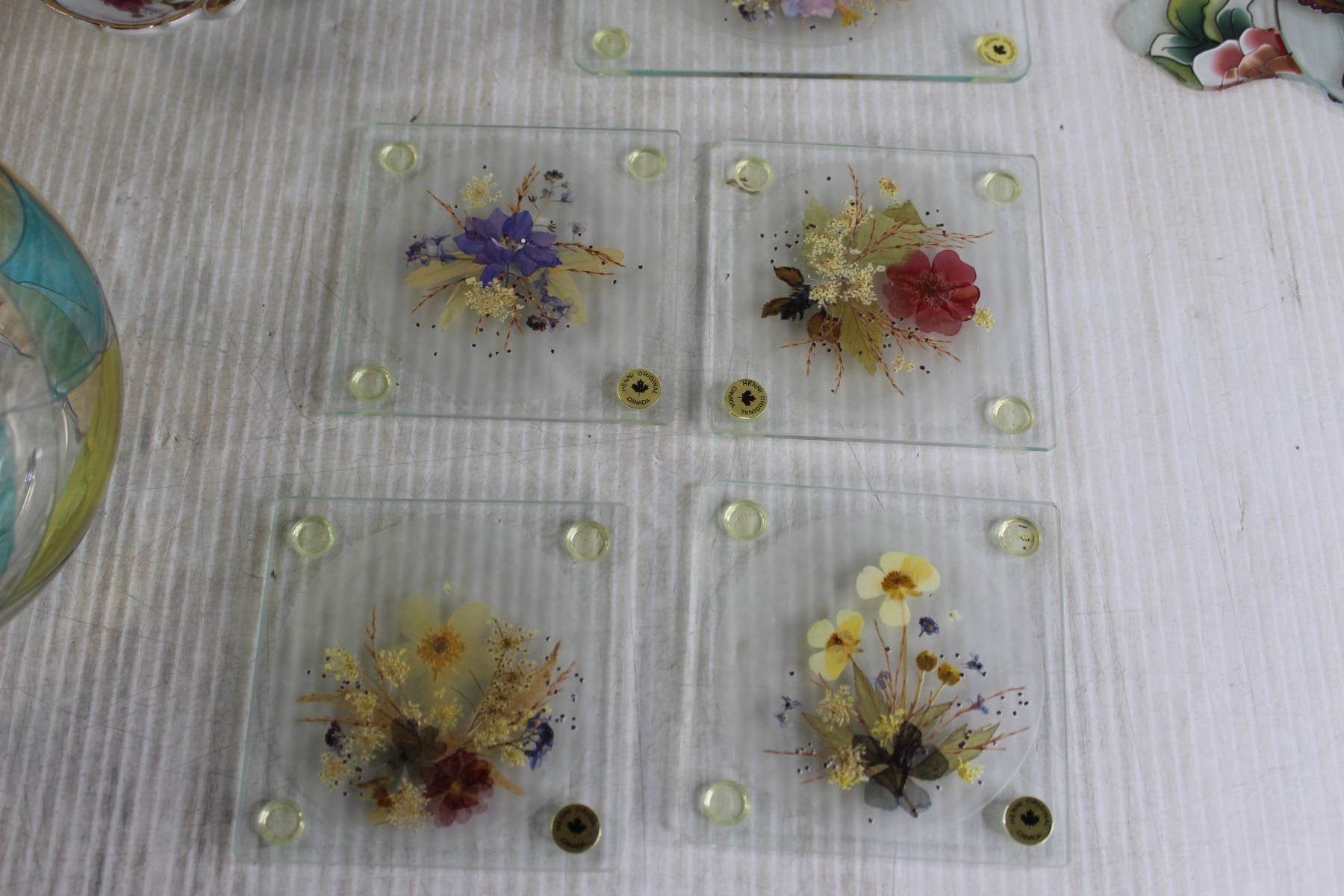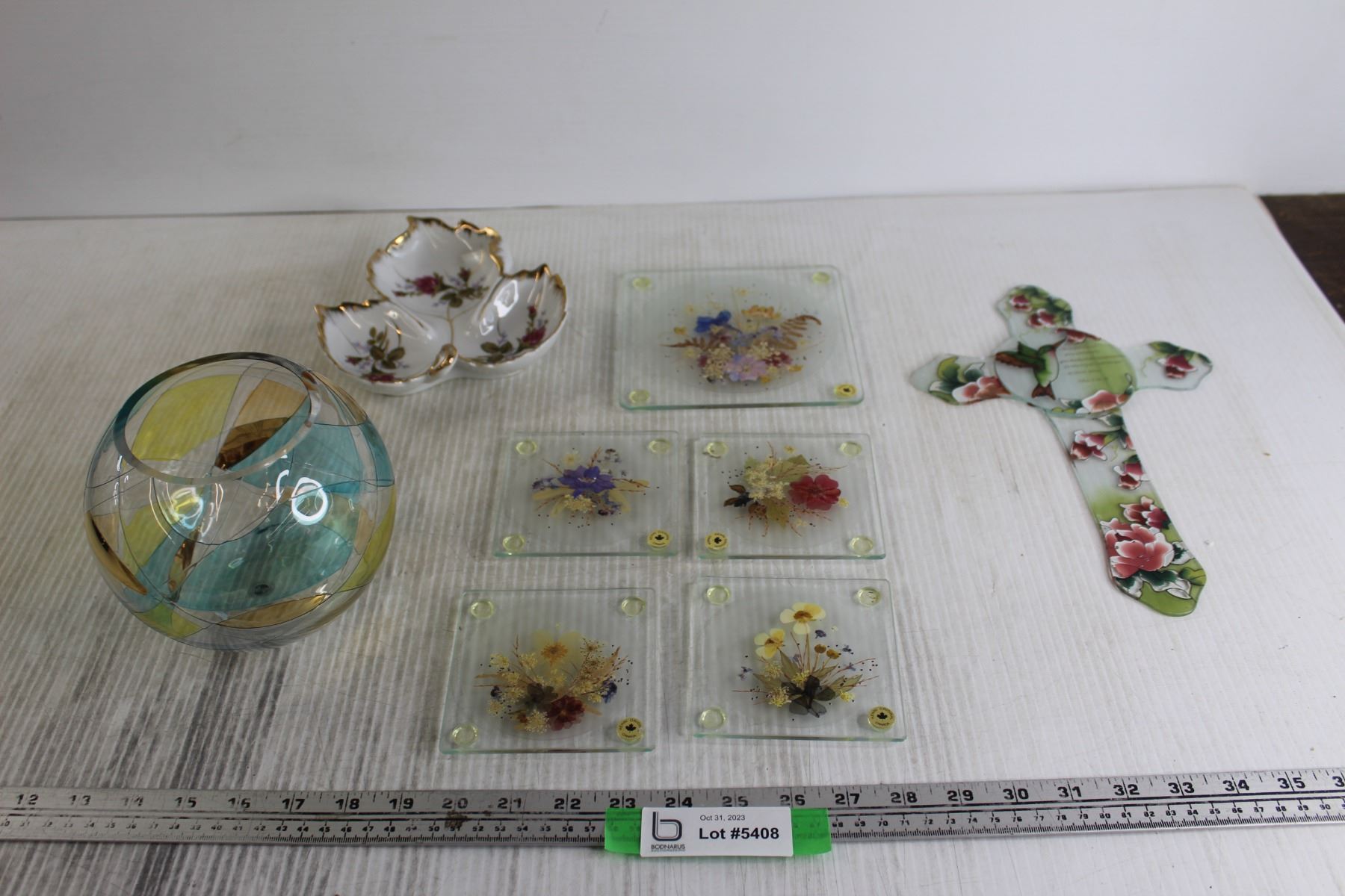 (4) Floral Coasters, Floral Hot Plate (?), Floral Glass Cross, Misc