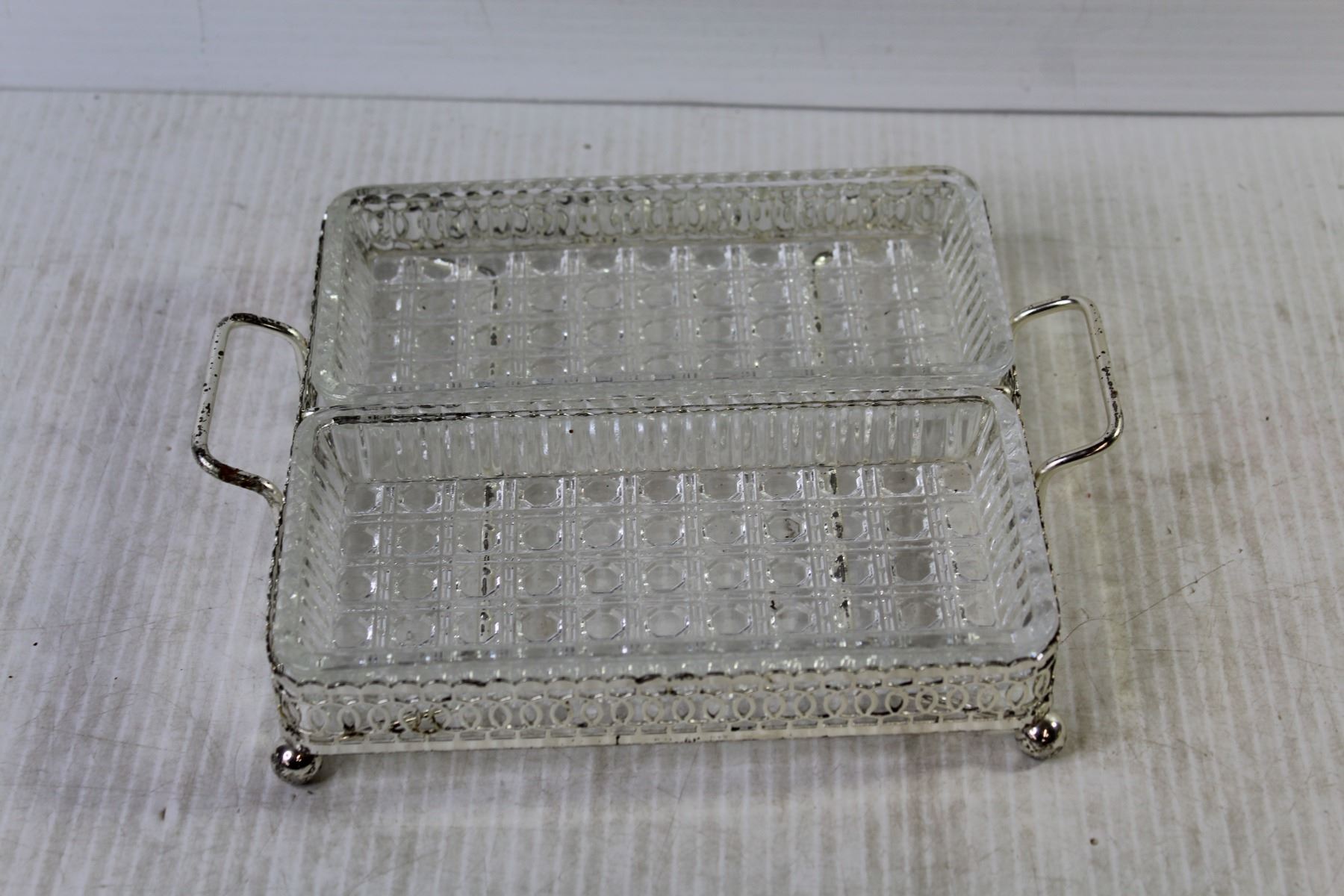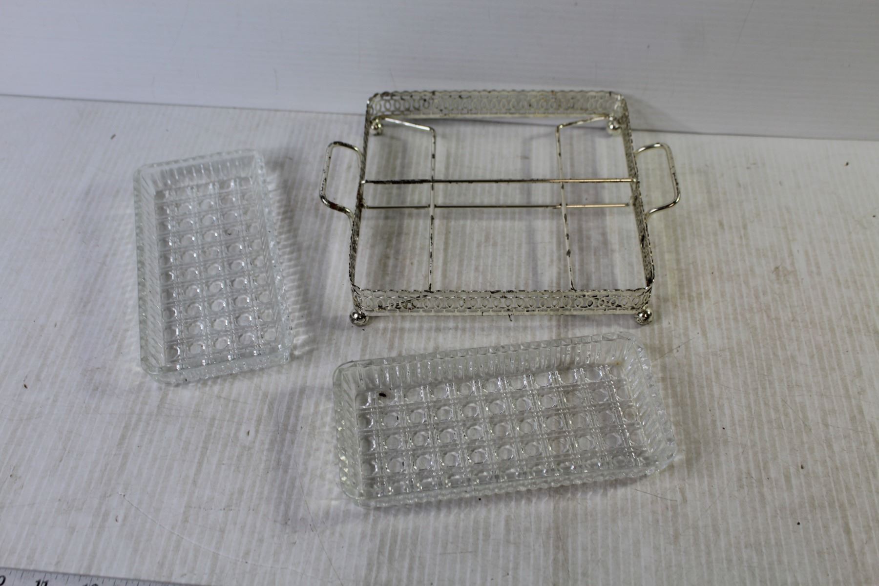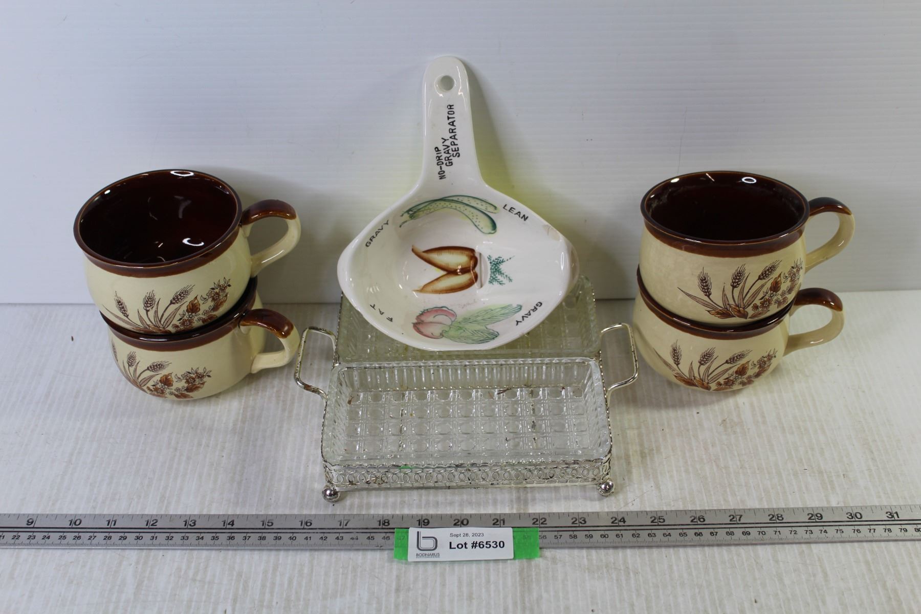 (4) French Onion Soup Bowls - Gravy Dish (chipped) - Divided Glass Dishes on Metal Stand