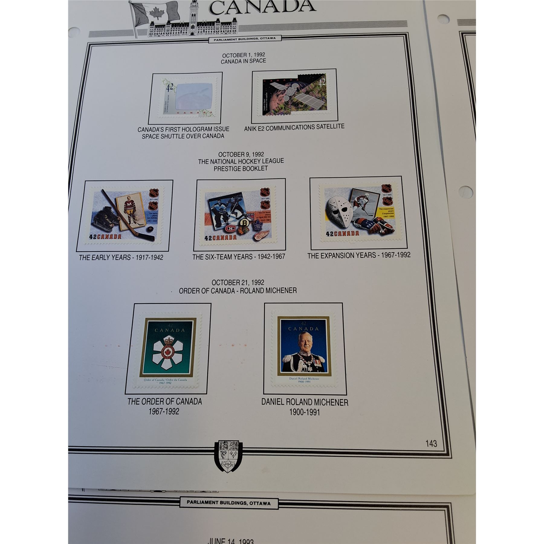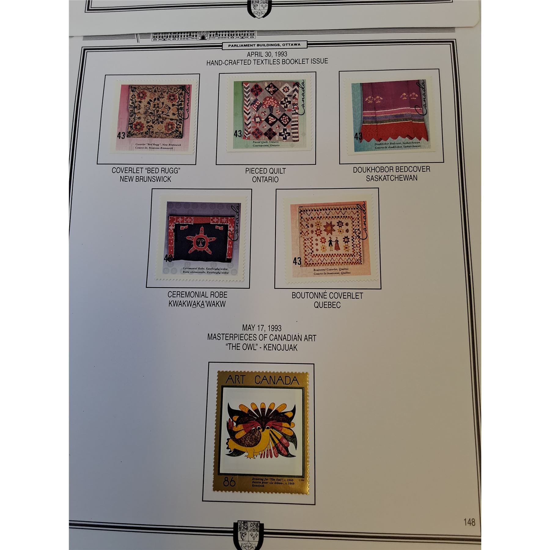 (4) Full Sheets of Vintage Uncirculated Canadian Parliament Stamp Sheets - Pages 143, 147, 149,148