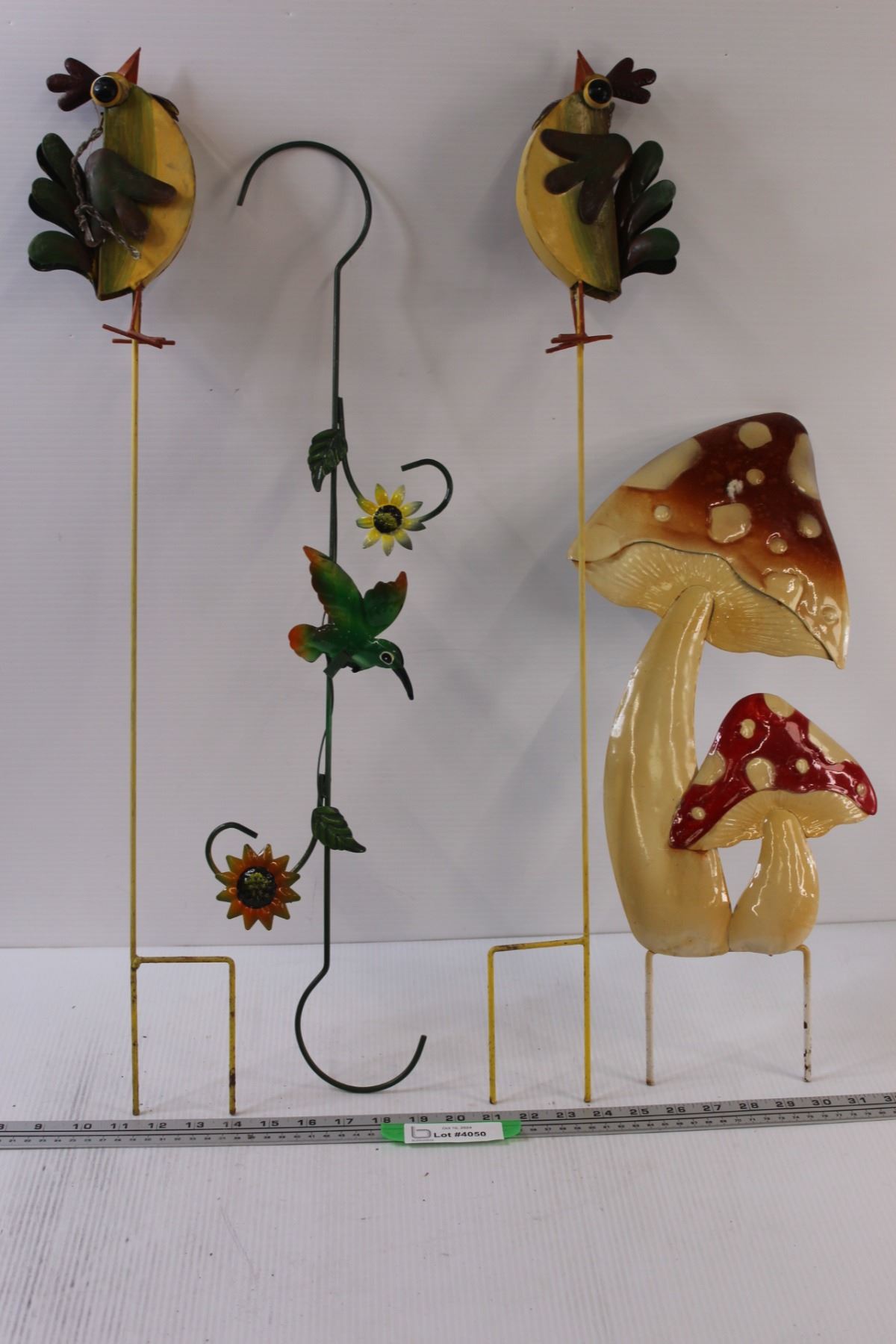 (4) Garden Stake Ornaments: Mushrooms, Birds, Hummingbird