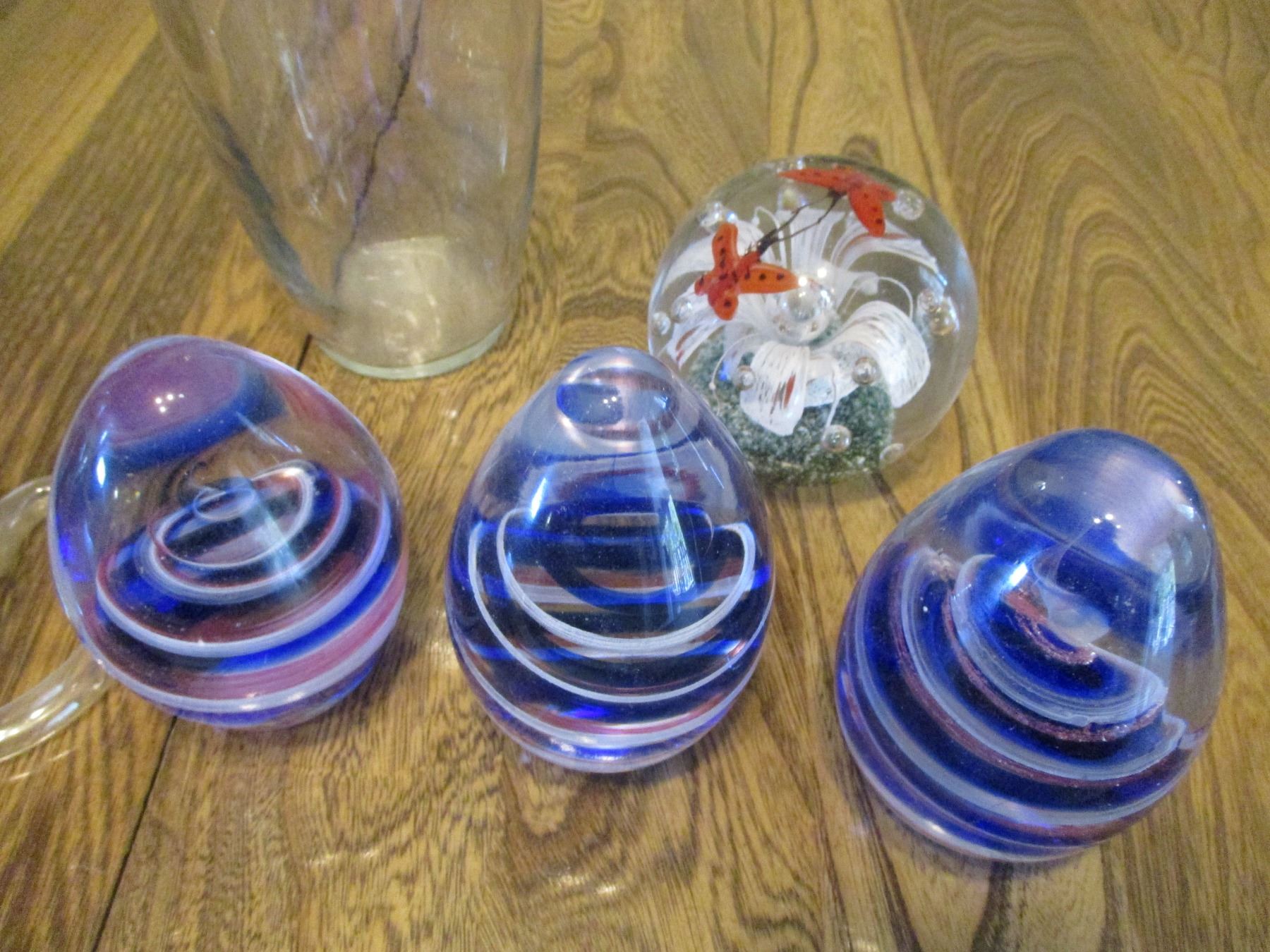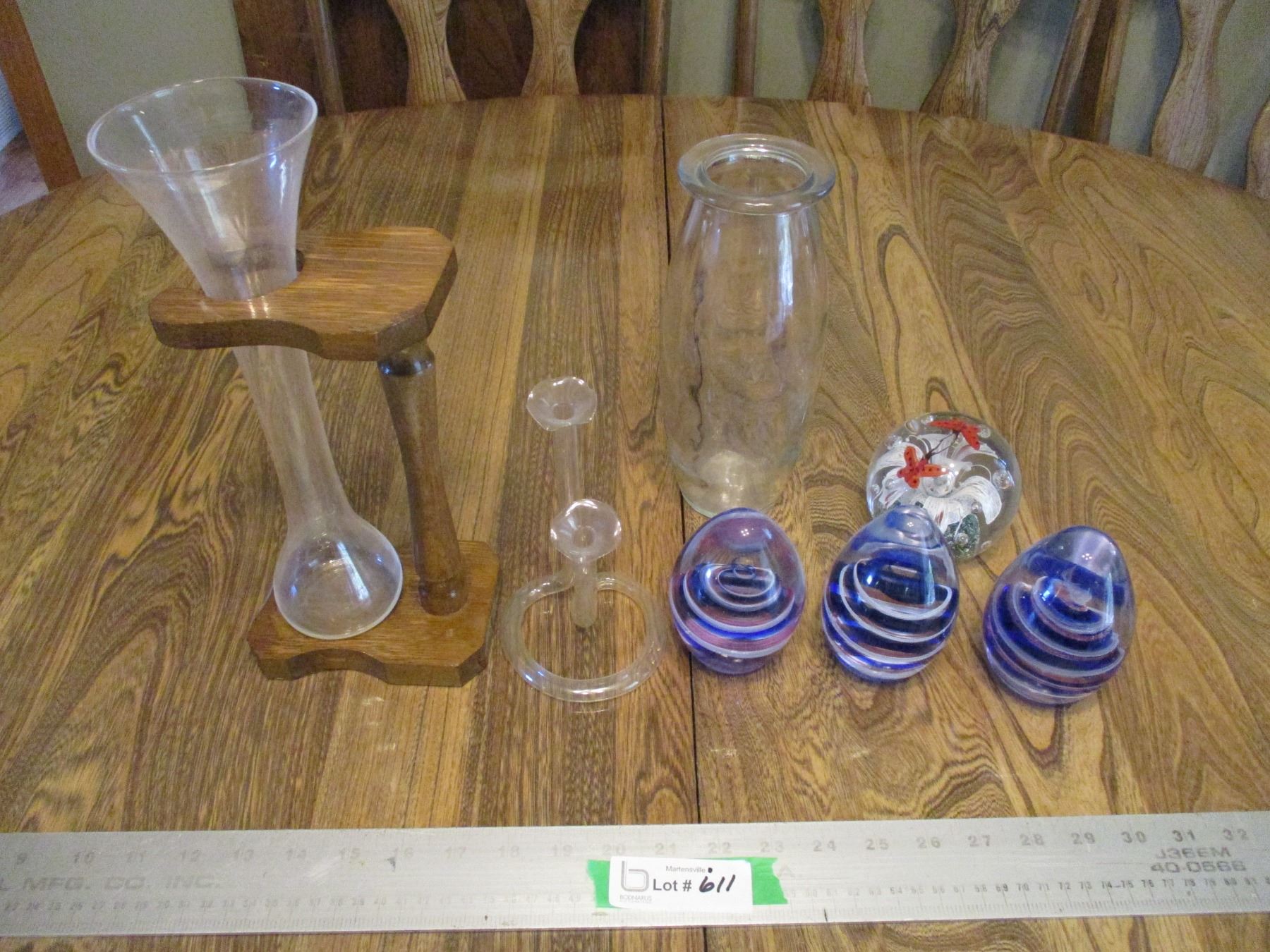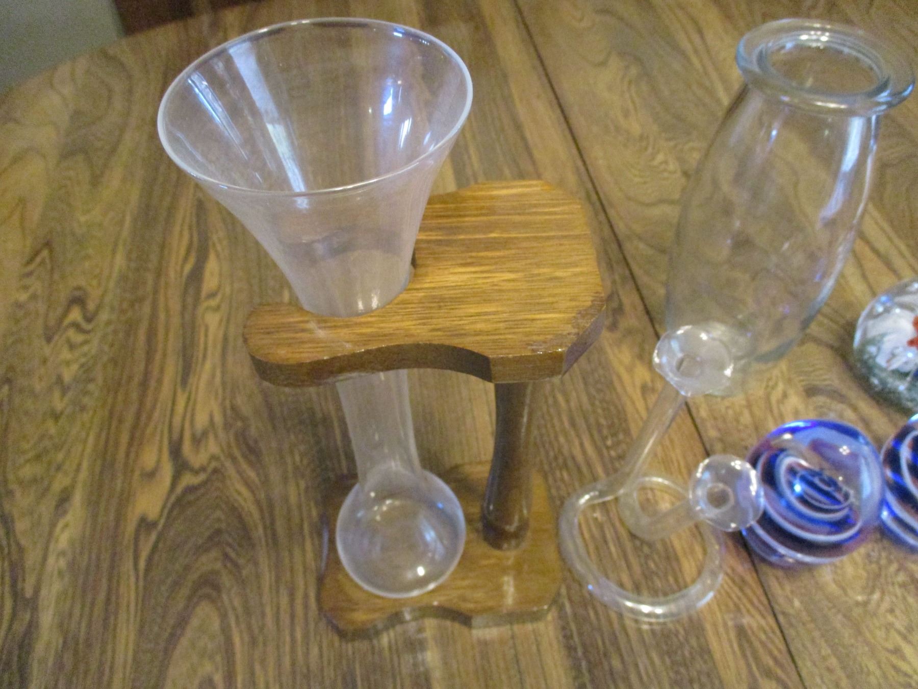 (4) Glass Paper Weights & Ale Glass or Vase w/Stand etc.