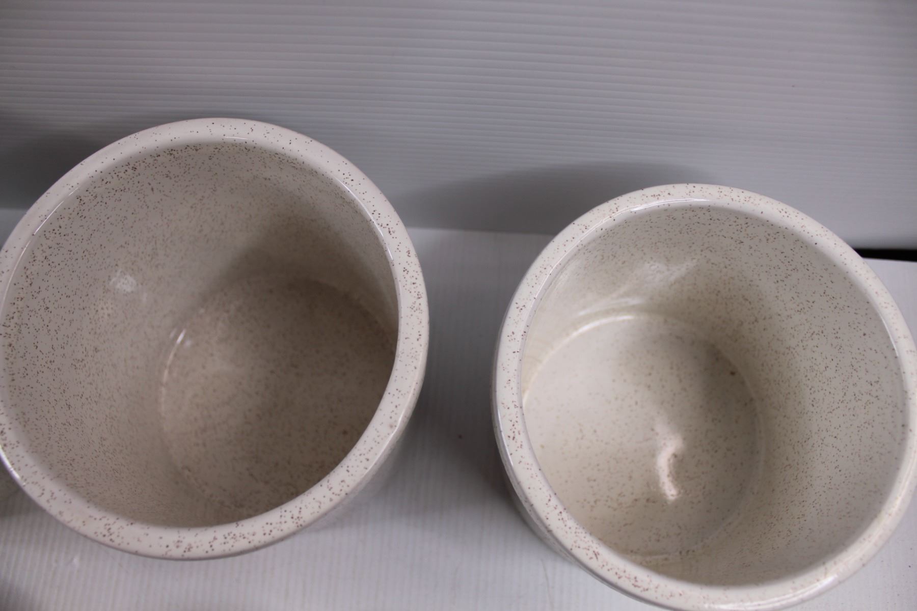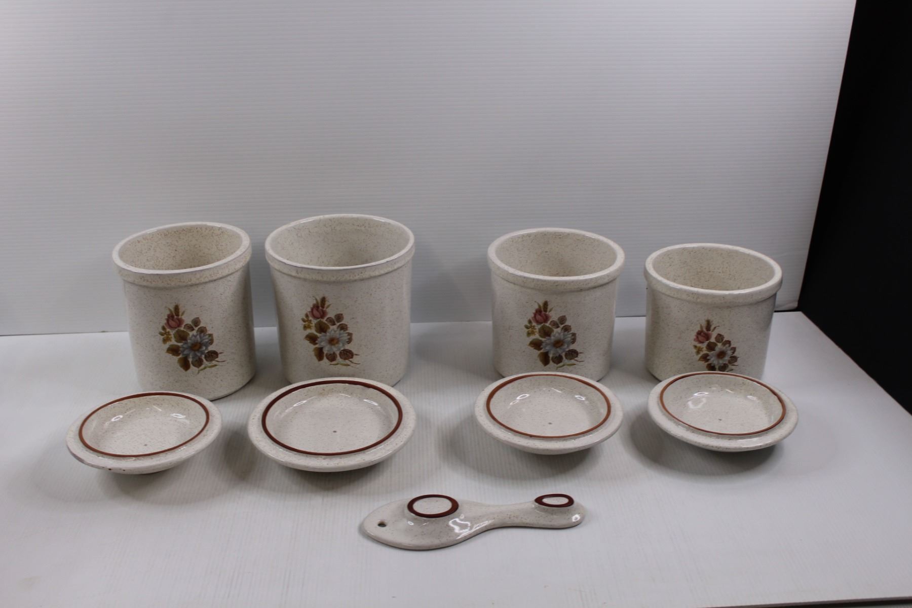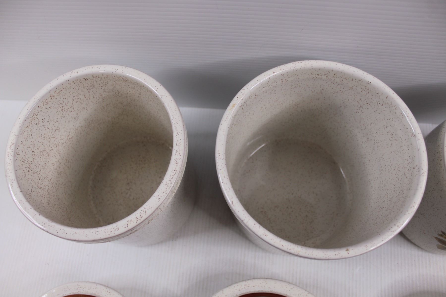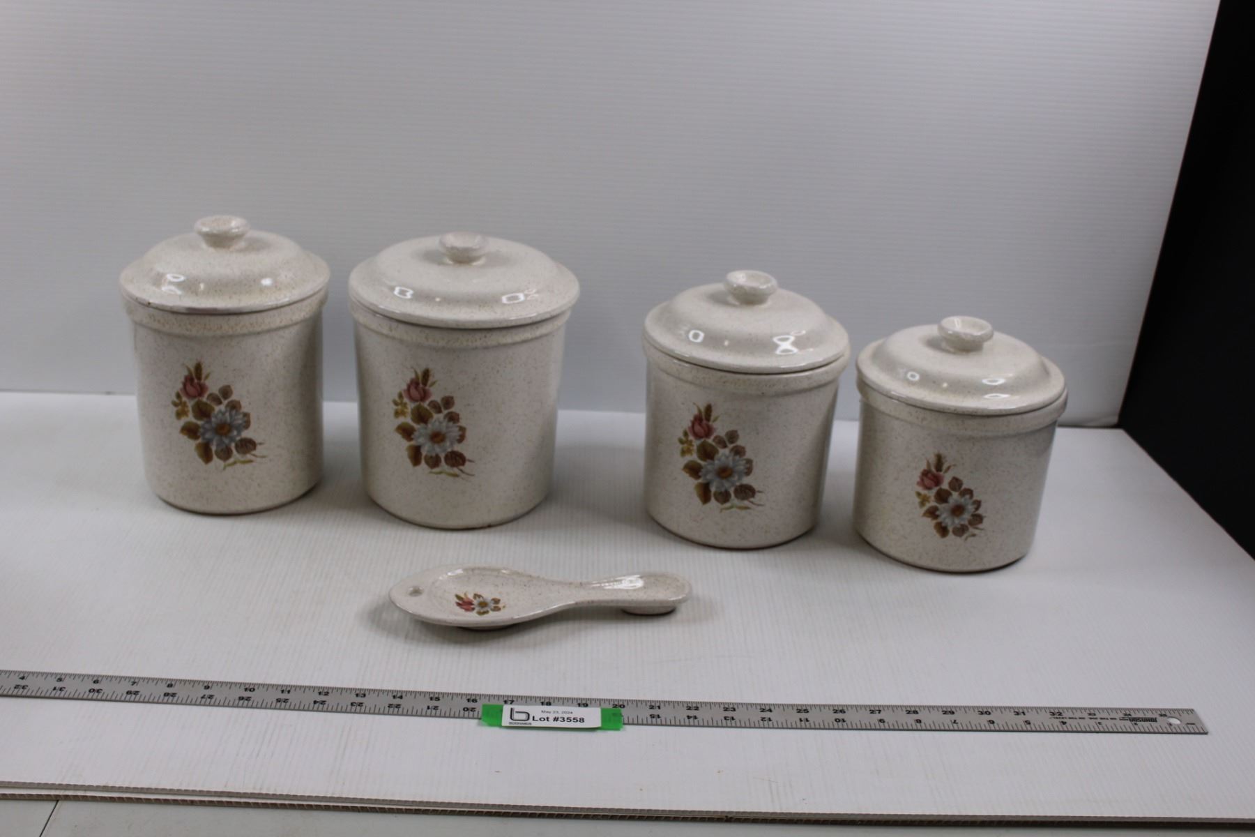 (4) Glazed Terracotta Kitchen Canisters w/Lids & Matching Spoon Rest