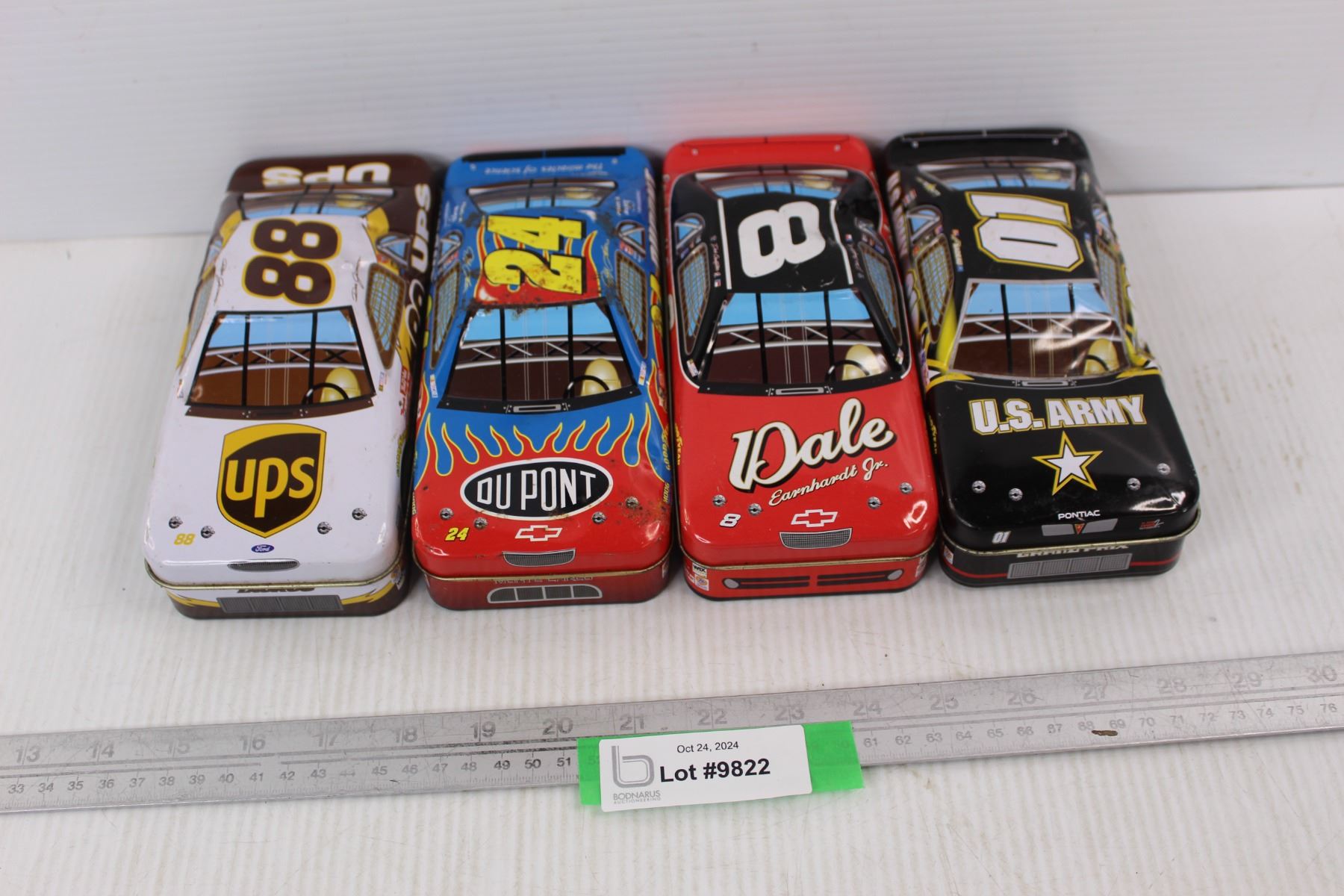 (4) Nascar Collectible Tins, Dale Earnhardt Jr, Jeff Gordan, Dale Jarret, Jerry Nadeau, -Some Damage