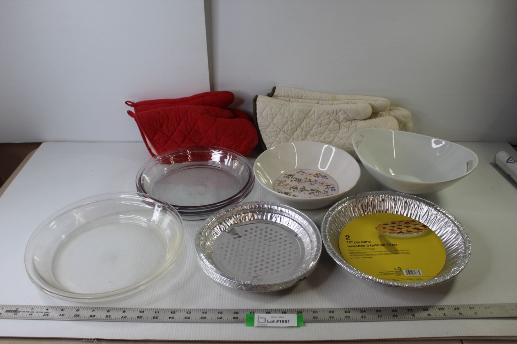 (4) Oven Safe Glass Dishes (Two Larger Are Pyrex), (2) Serving Bowls (Mikasa, Hometrends), Pie Pans, (2) Pairs Serving Mitts
