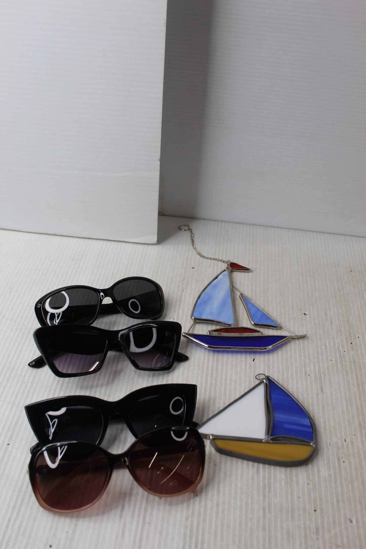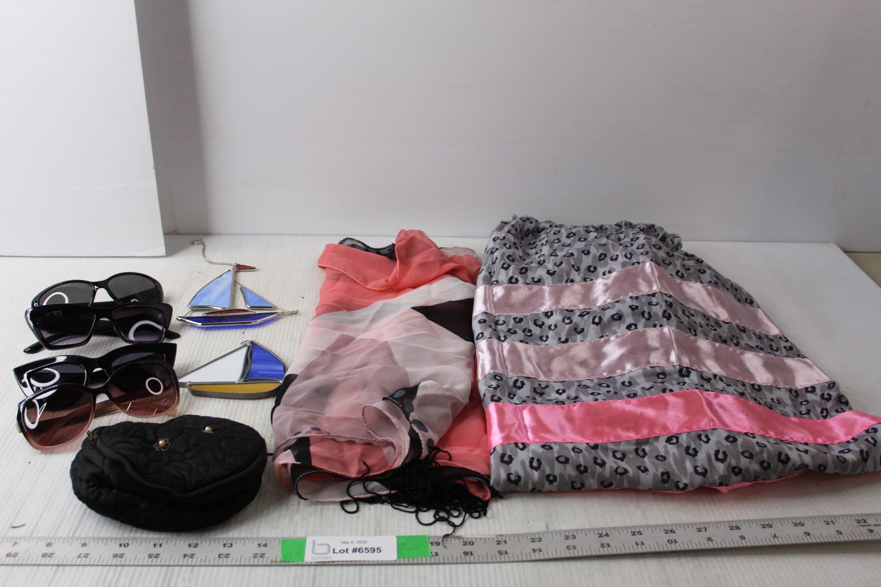 (4) Pairs of Sunglasses, Ribbon Skirt- Approx. XL, Mary Kay Scarf, Misc.