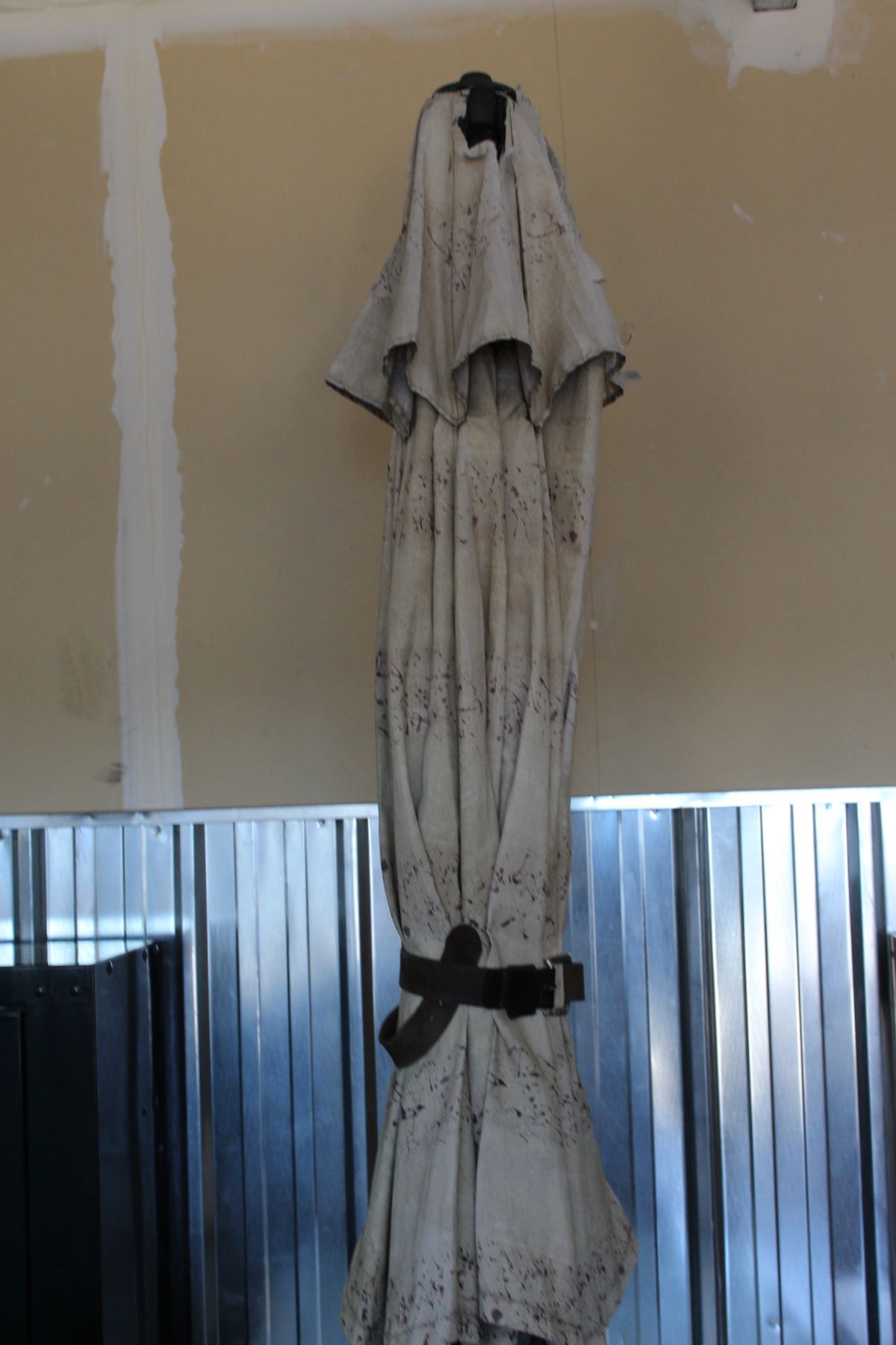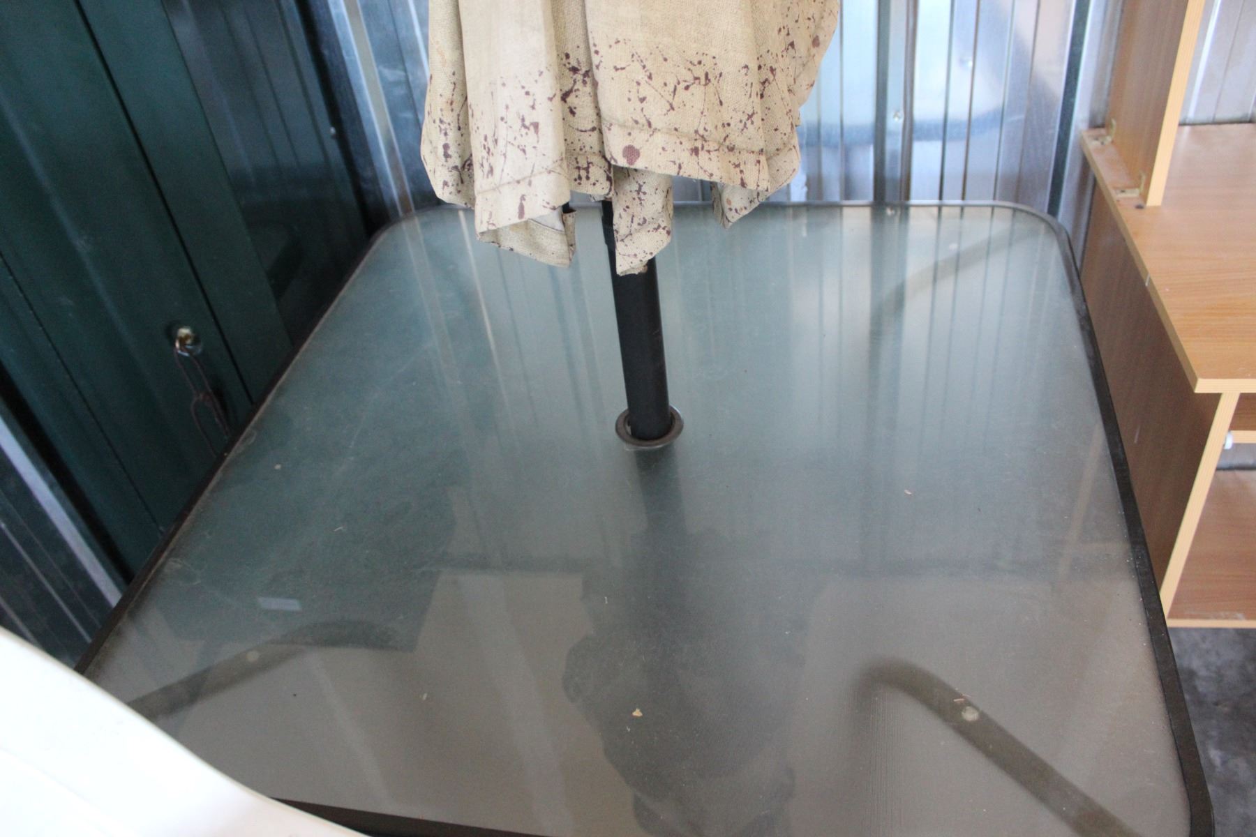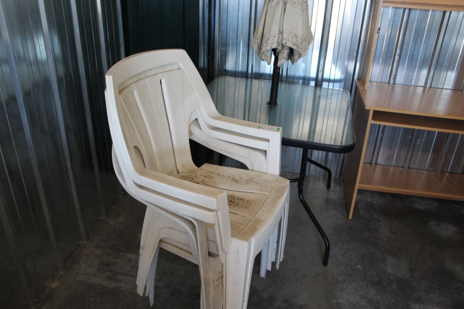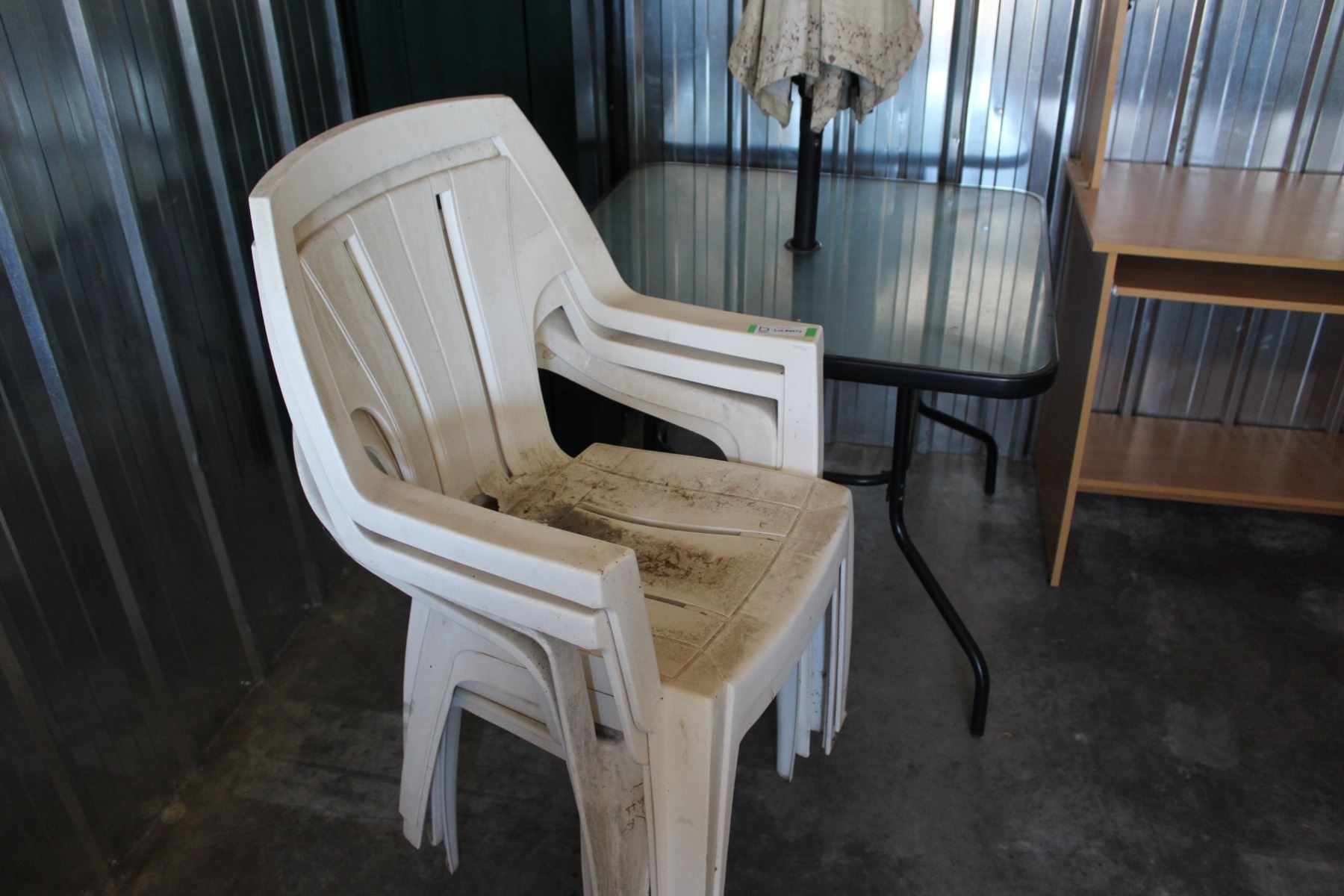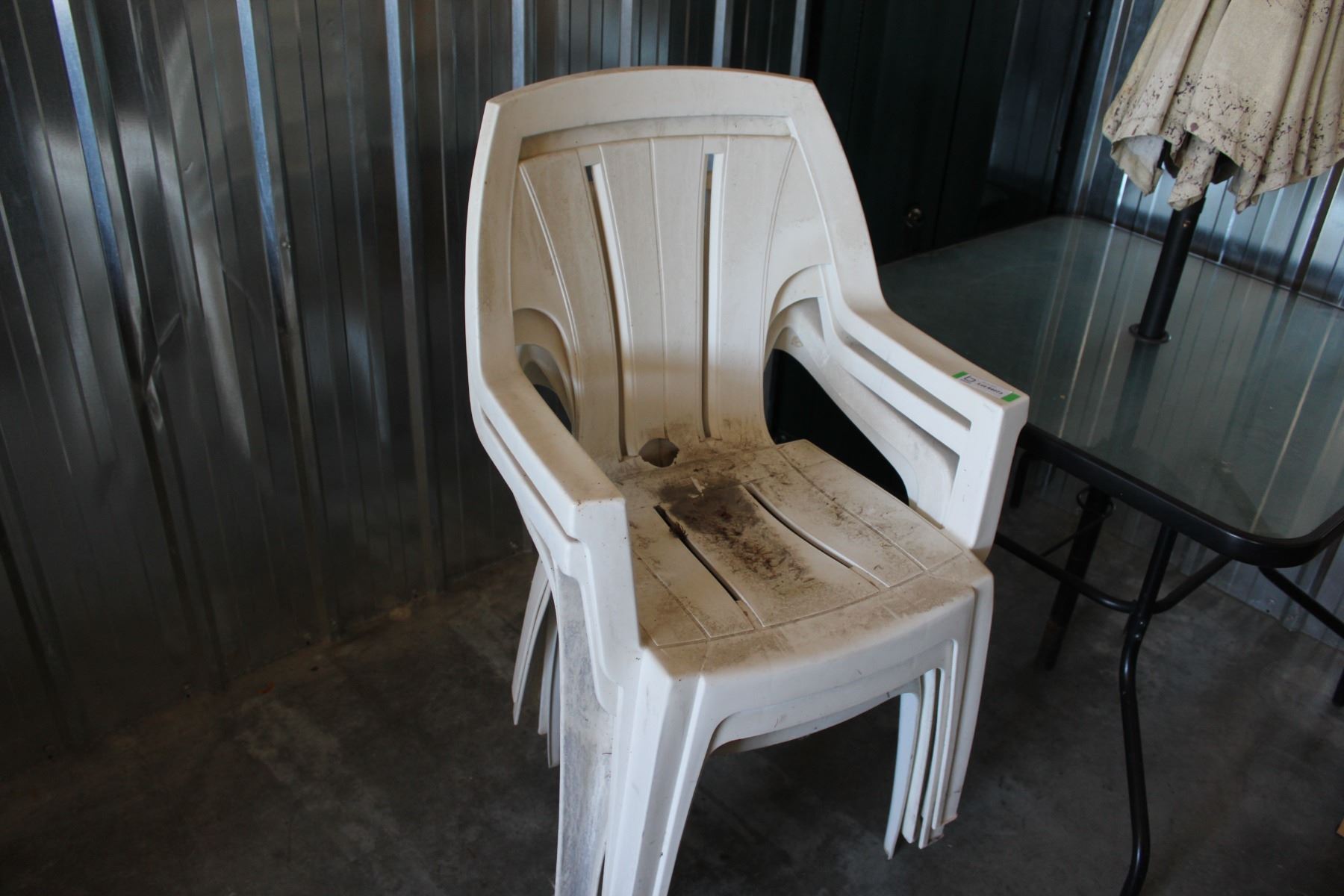 ** (4) Plastic Patio Chairs - Some Damage, Umbrella, Patio Table - 33" x 33"