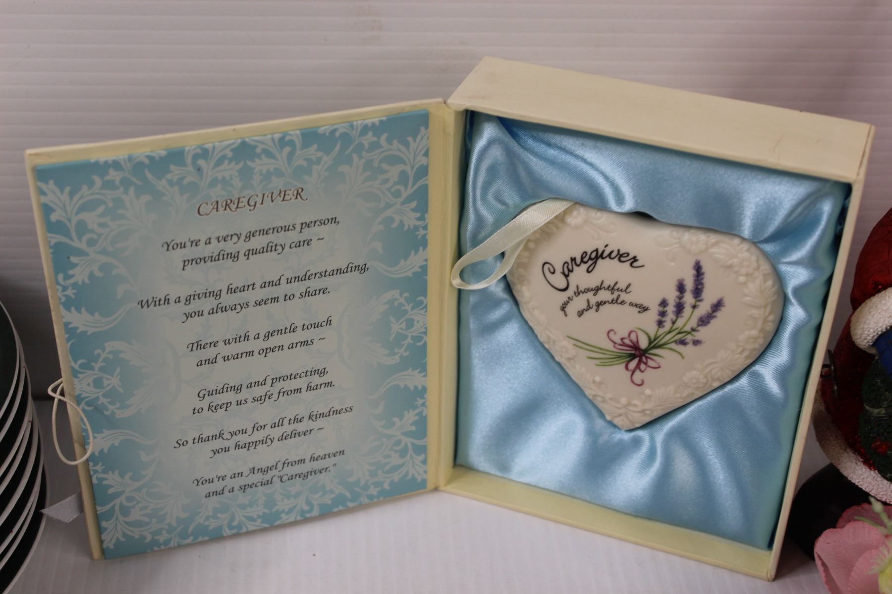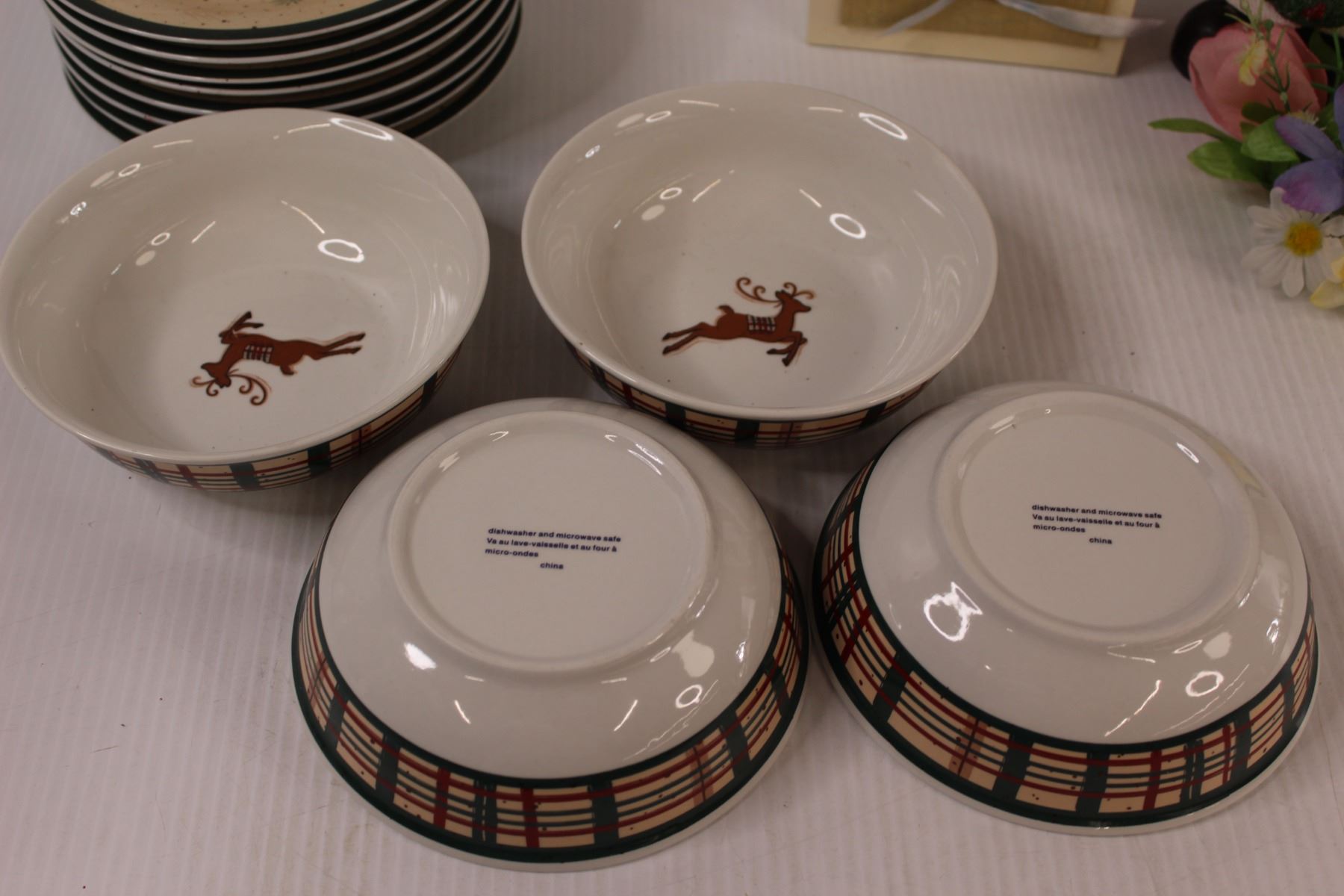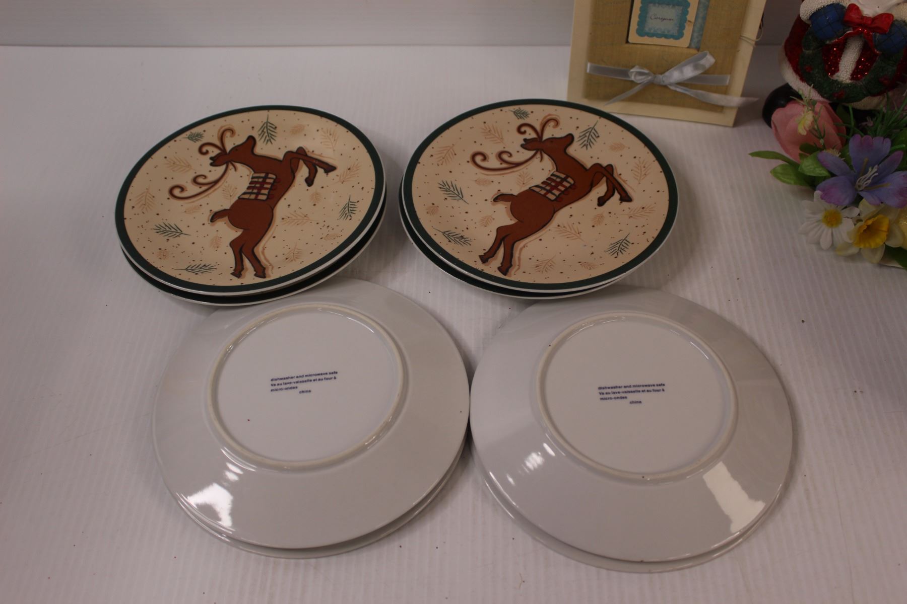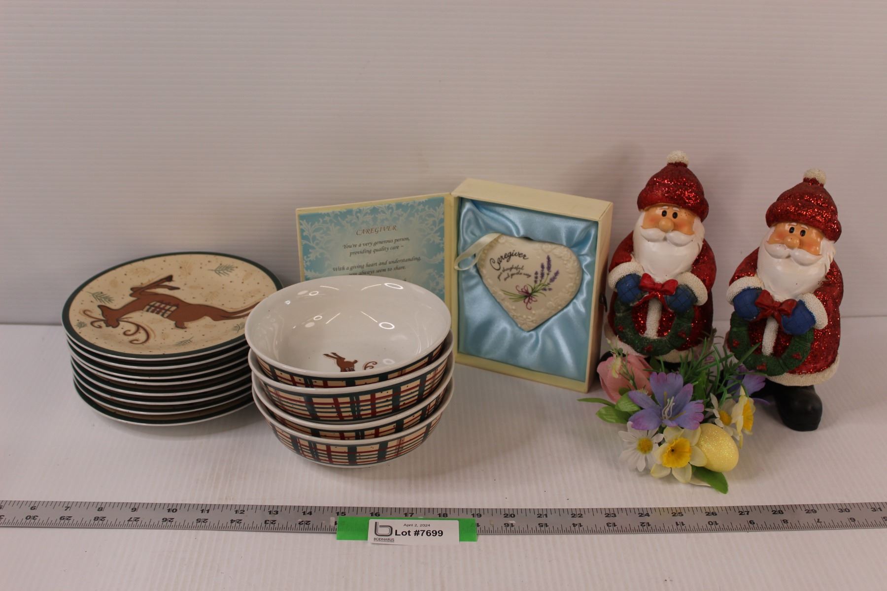 (4) Reindeer Bowls, (7) Reindeer Plates, (2) Santas, Caregiver Heart Pendant in Box, Faux Floral Arrangement