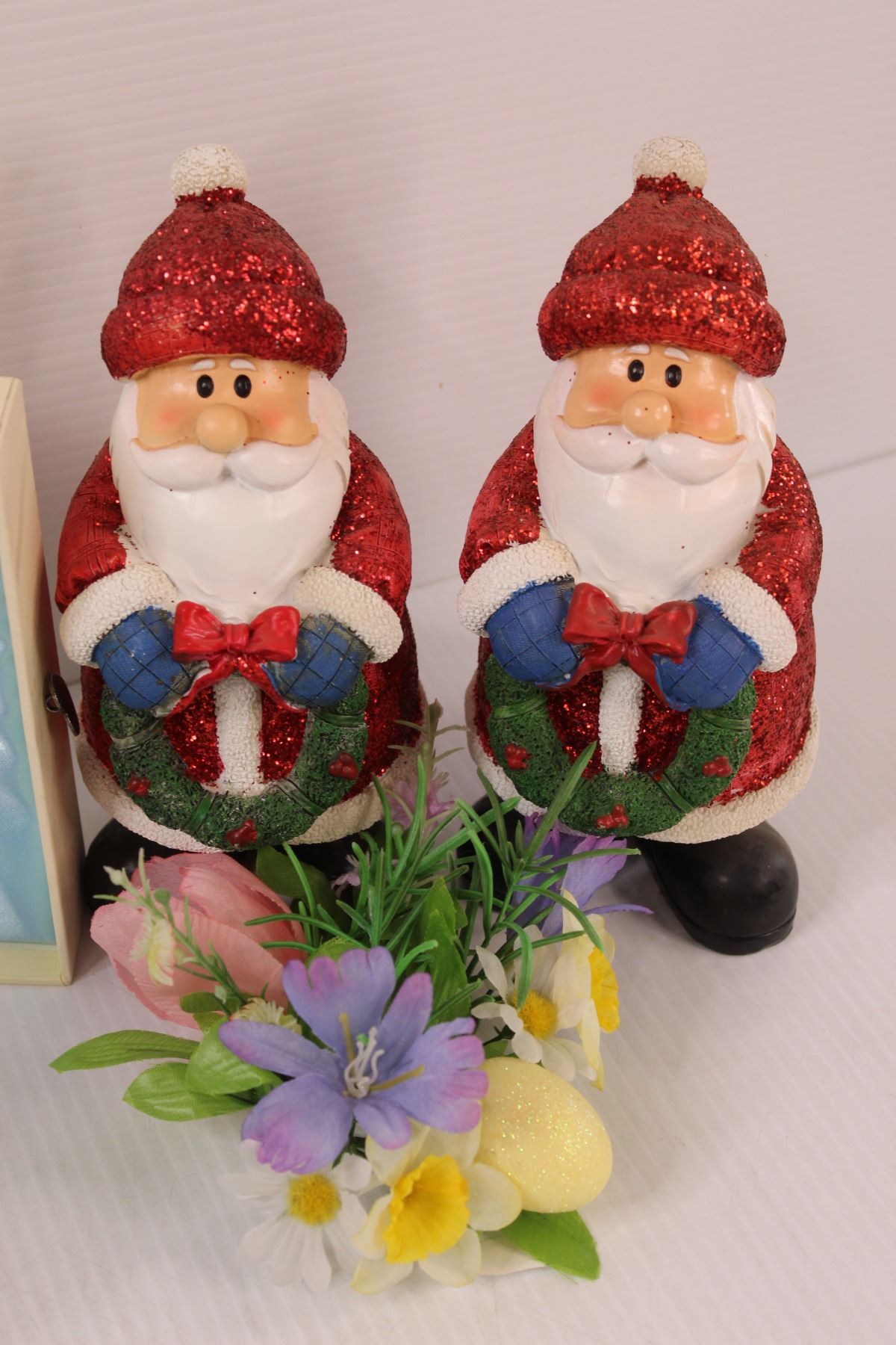 (4) Reindeer Bowls, (7) Reindeer Plates, (2) Santas, Caregiver Heart Pendant in Box, Faux Floral Arr
