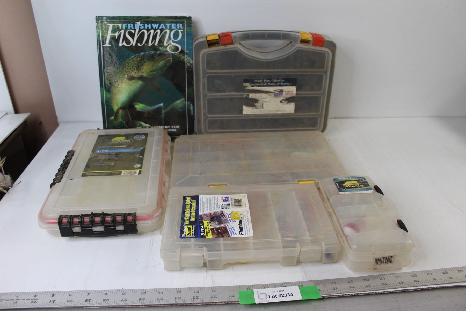 (4) Tackle Boxes, Plastic Parts Organizer, Freshwater Fishing Book