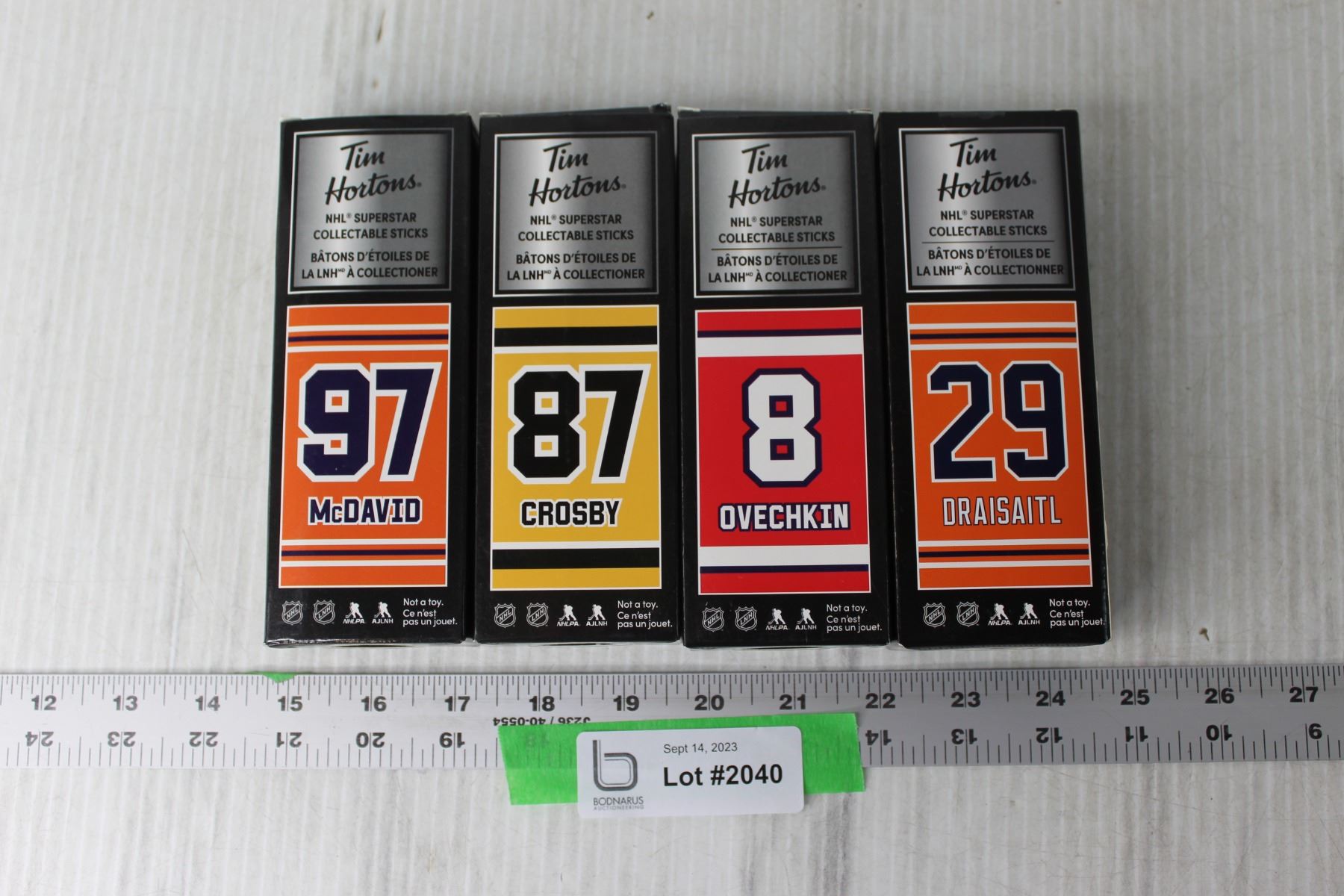 (4) Tim Hortons Mini Hockey Sticks - McDavid, Draisaitl, Crosby, Ovechkin (NIB)