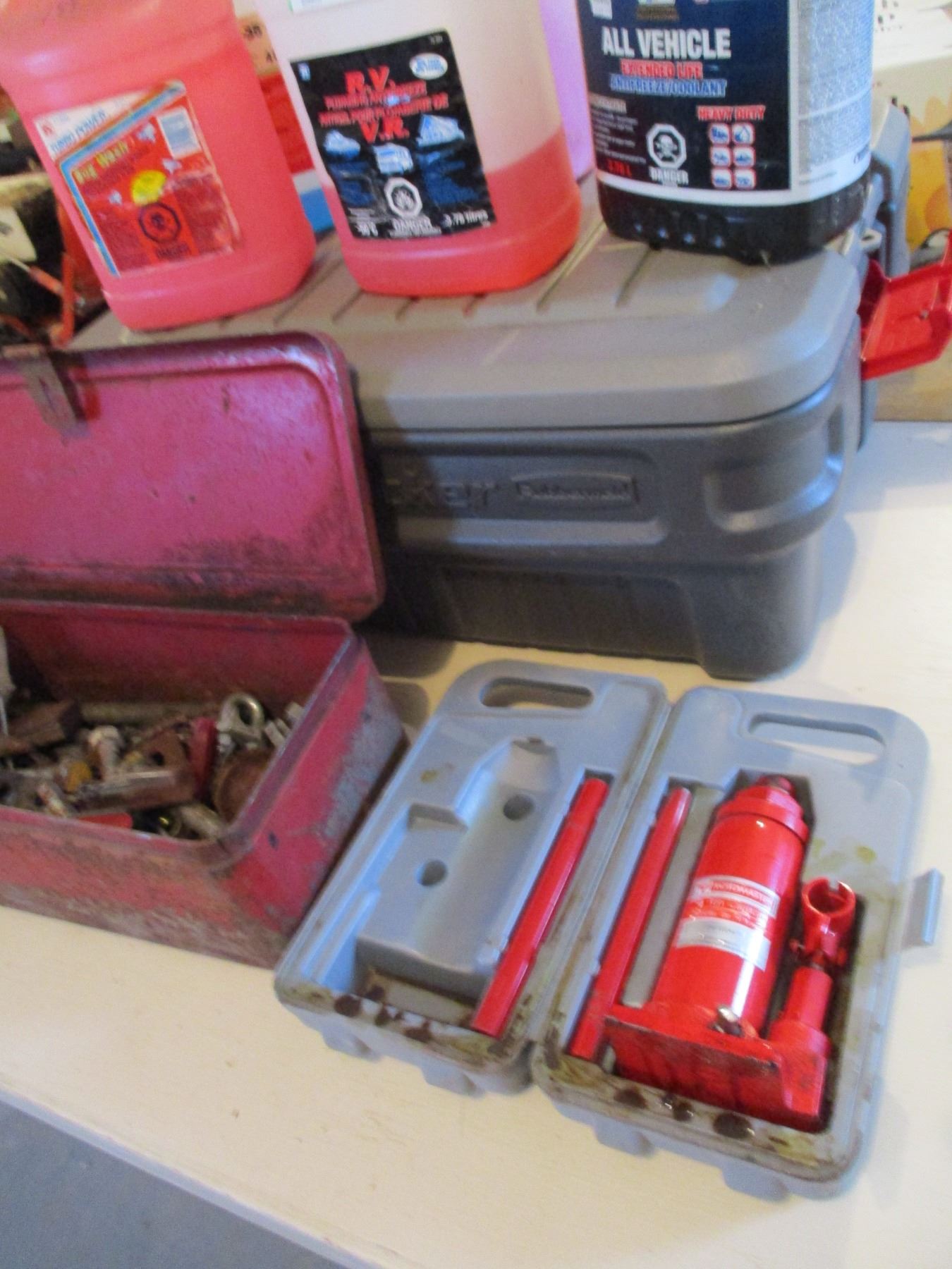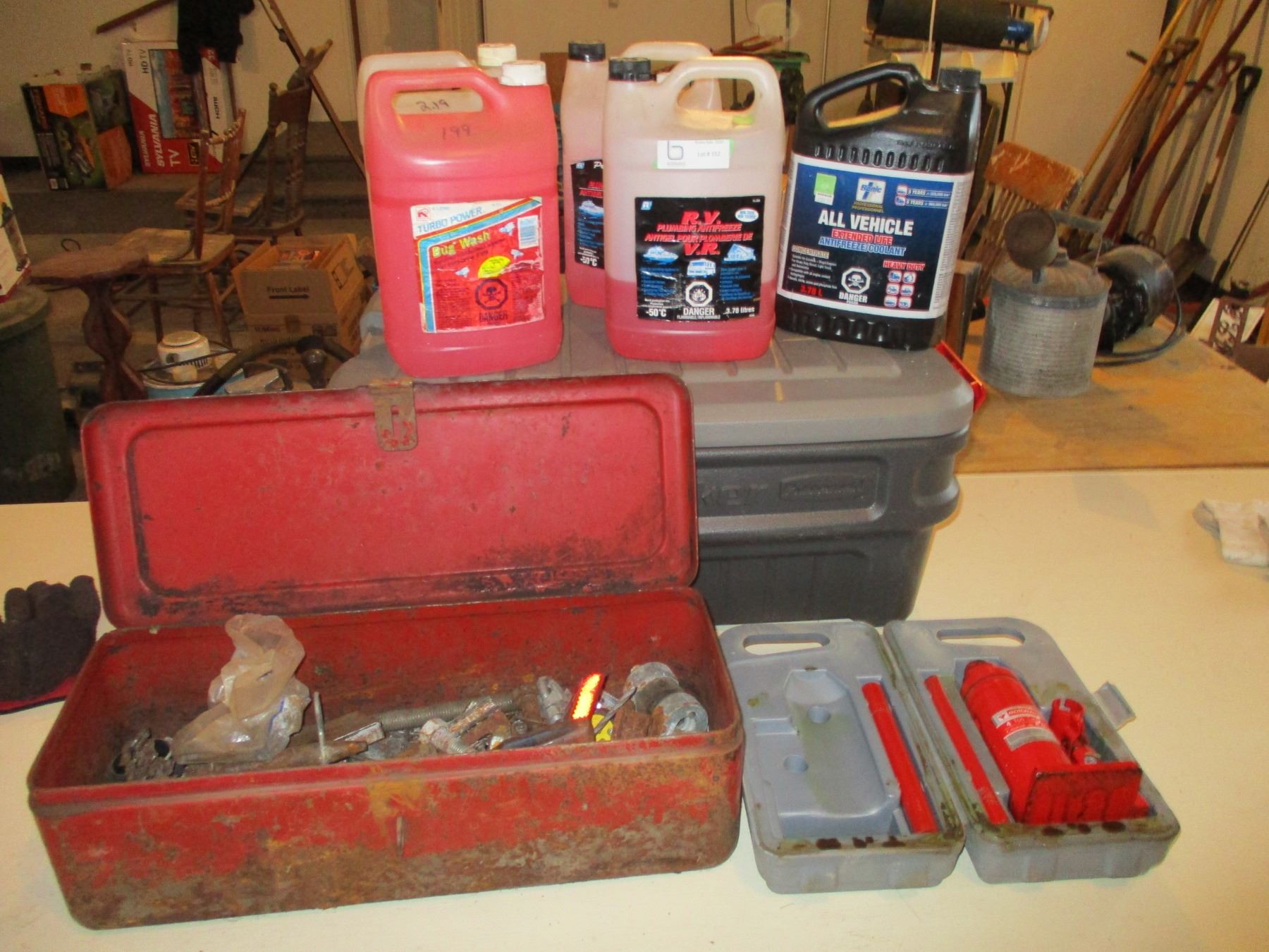 4 Ton Jack in Case and Toolbox and 5 Jugs of Antifreeze