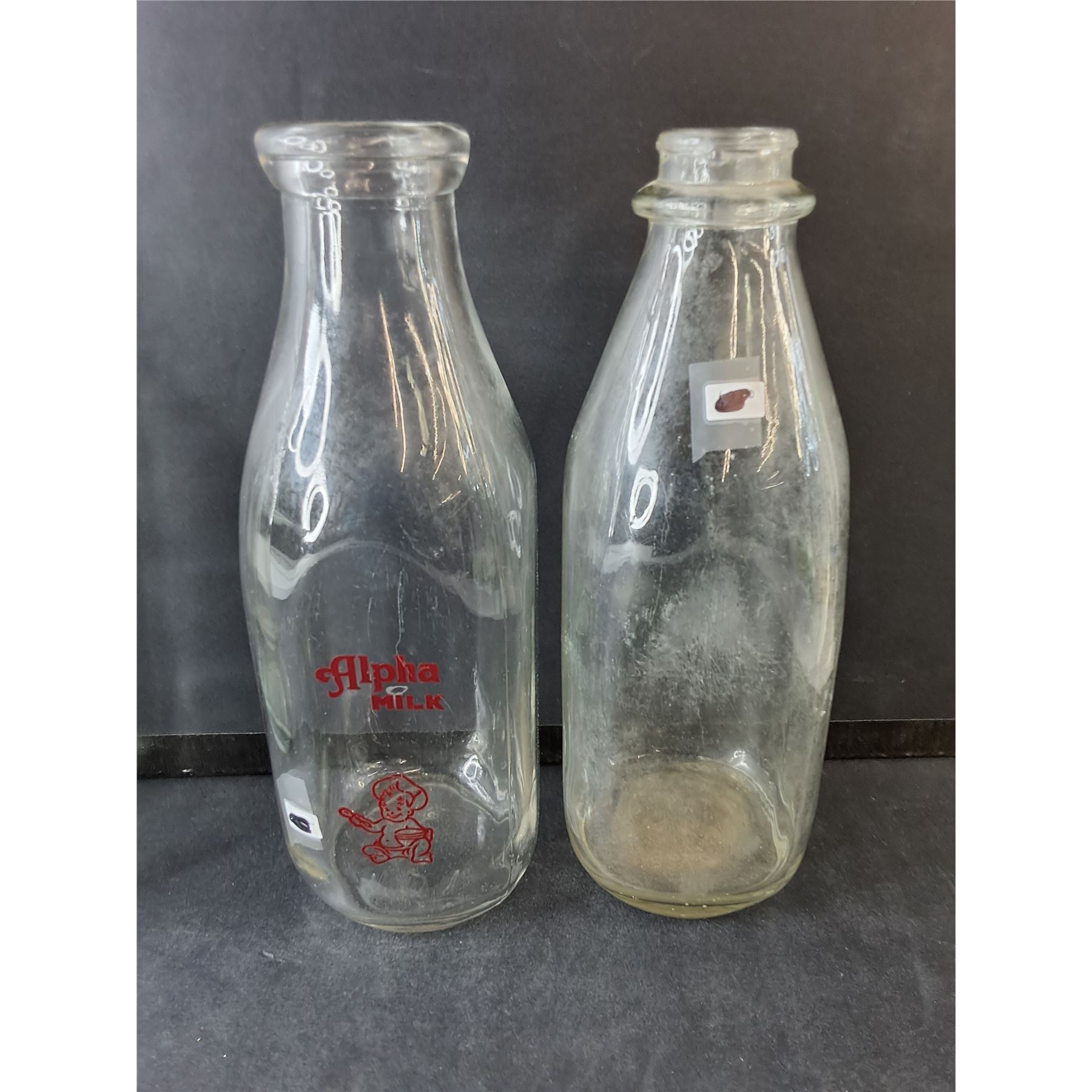 (4) Vintage Milk Jugs- Heewadin Dairy, 'D' Dutchmen, Alpha Milk Up to 10" Tall