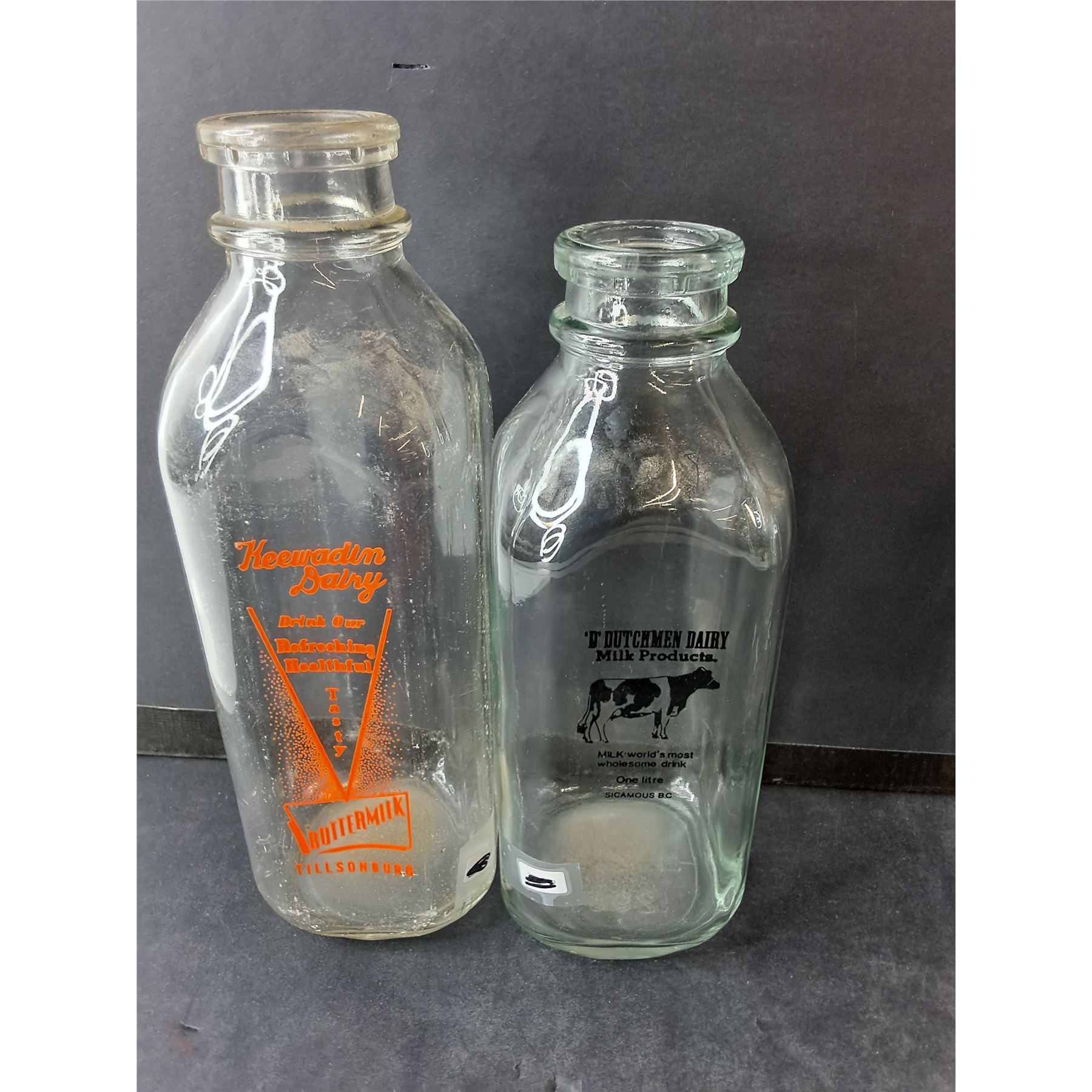 (4) Vintage Milk Jugs- Heewadin Dairy, 'D' Dutchmen, Alpha Milk Up to 10  Tall