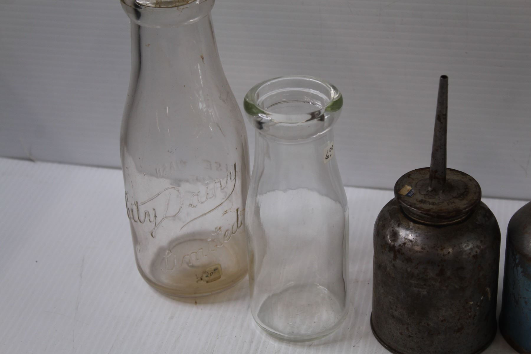 (4) Vintage Oil Cans & (2) Milk Jug Glass Bottles