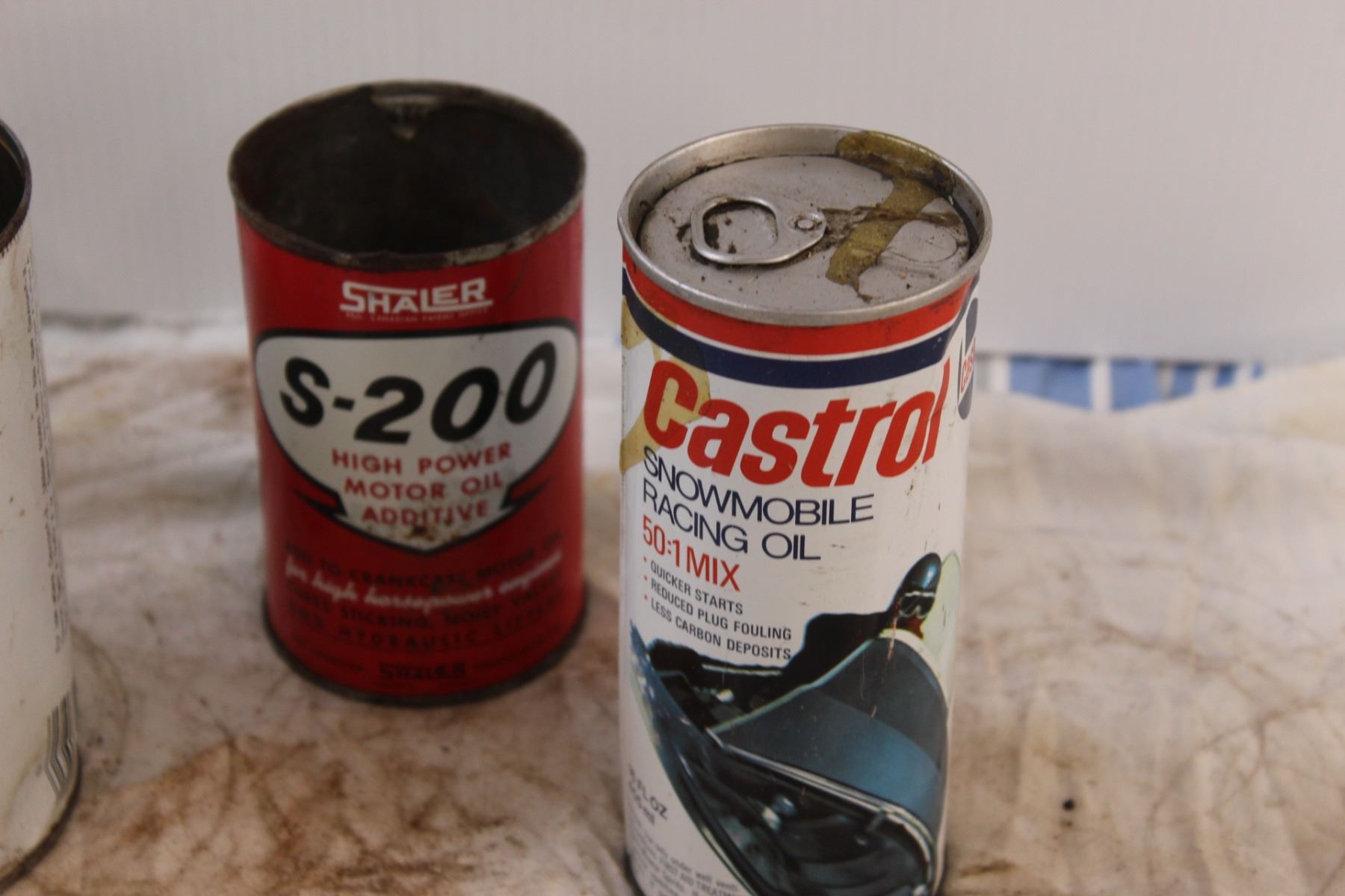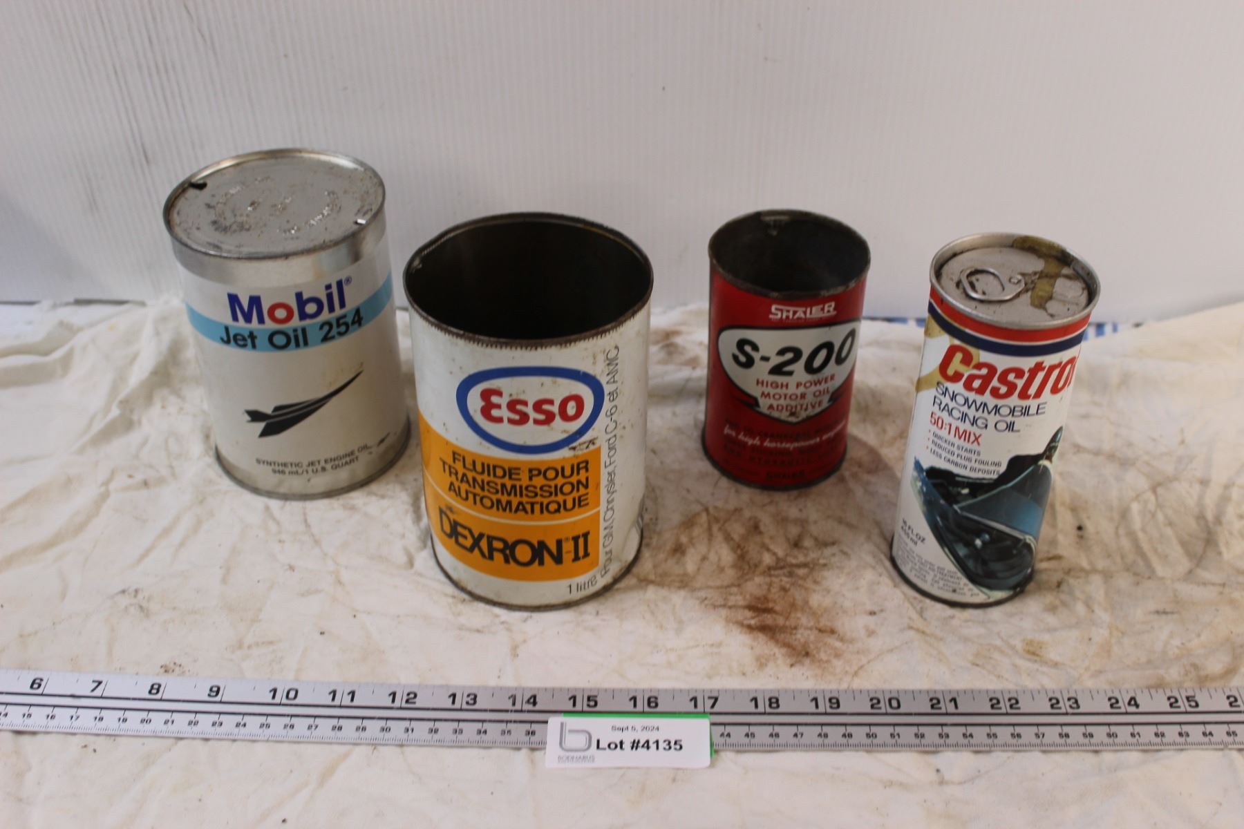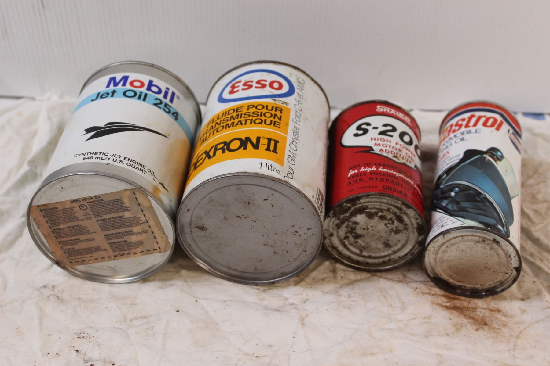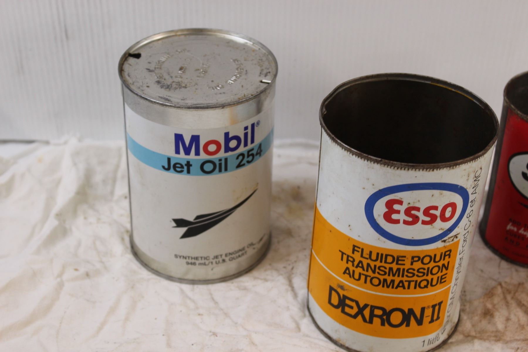 (4) Vintage Oil Cans: Mobil, Esso, Castrol - (3) Empty, (1) Full