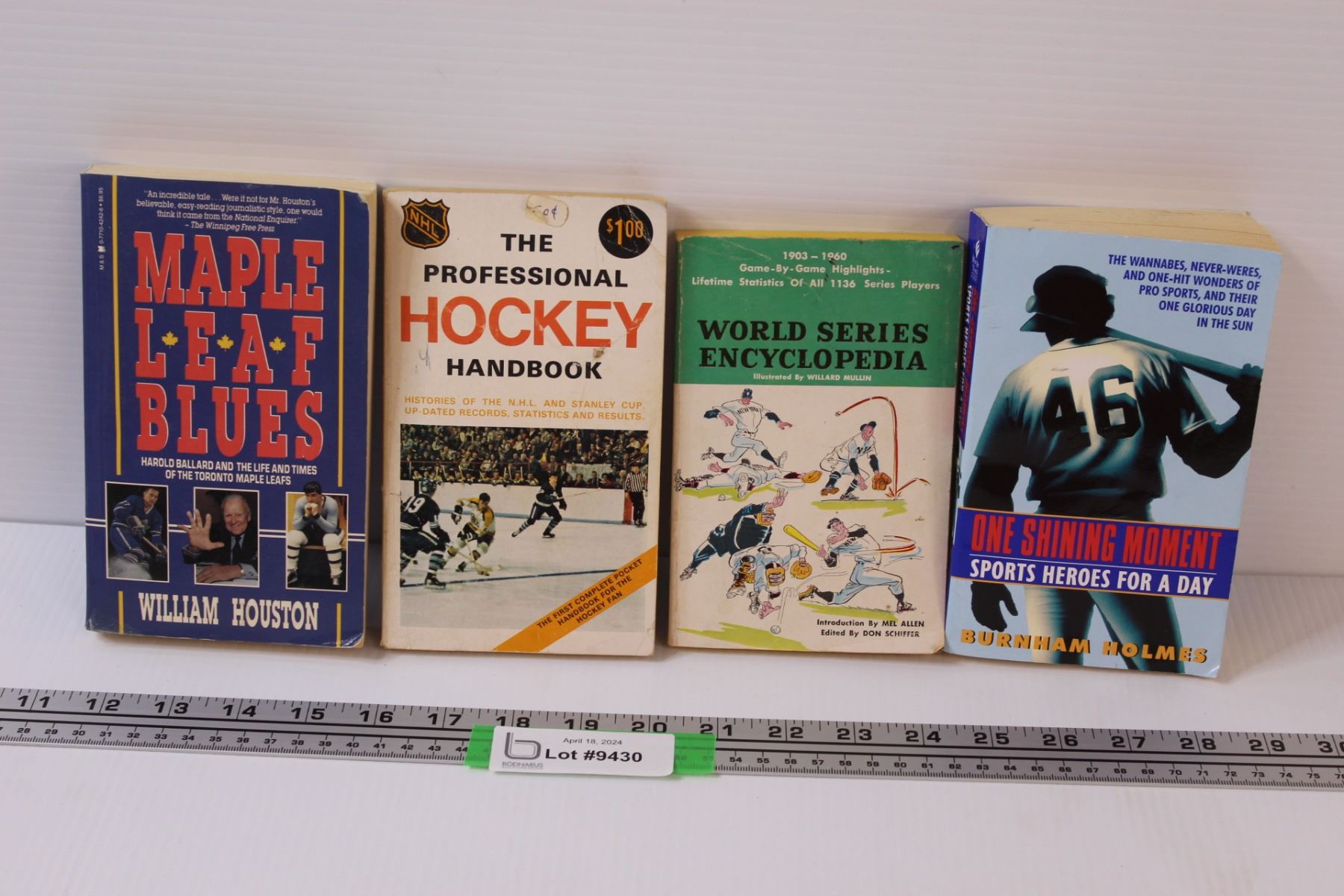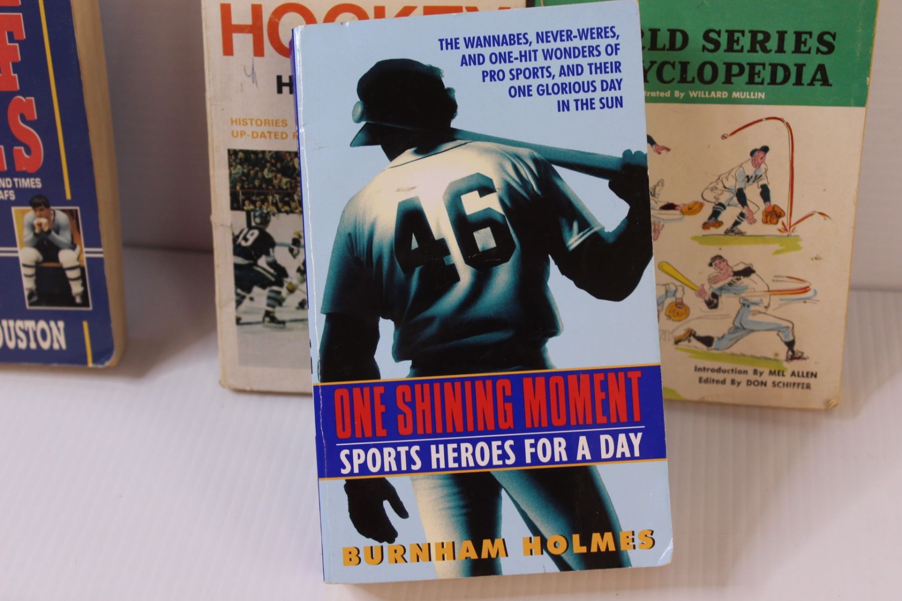 (4) Vintage Sports Paperback Books: Maple Leaf Blues; One Shining Moment; World Series Encyclopedia; Pro Hockey Handbook