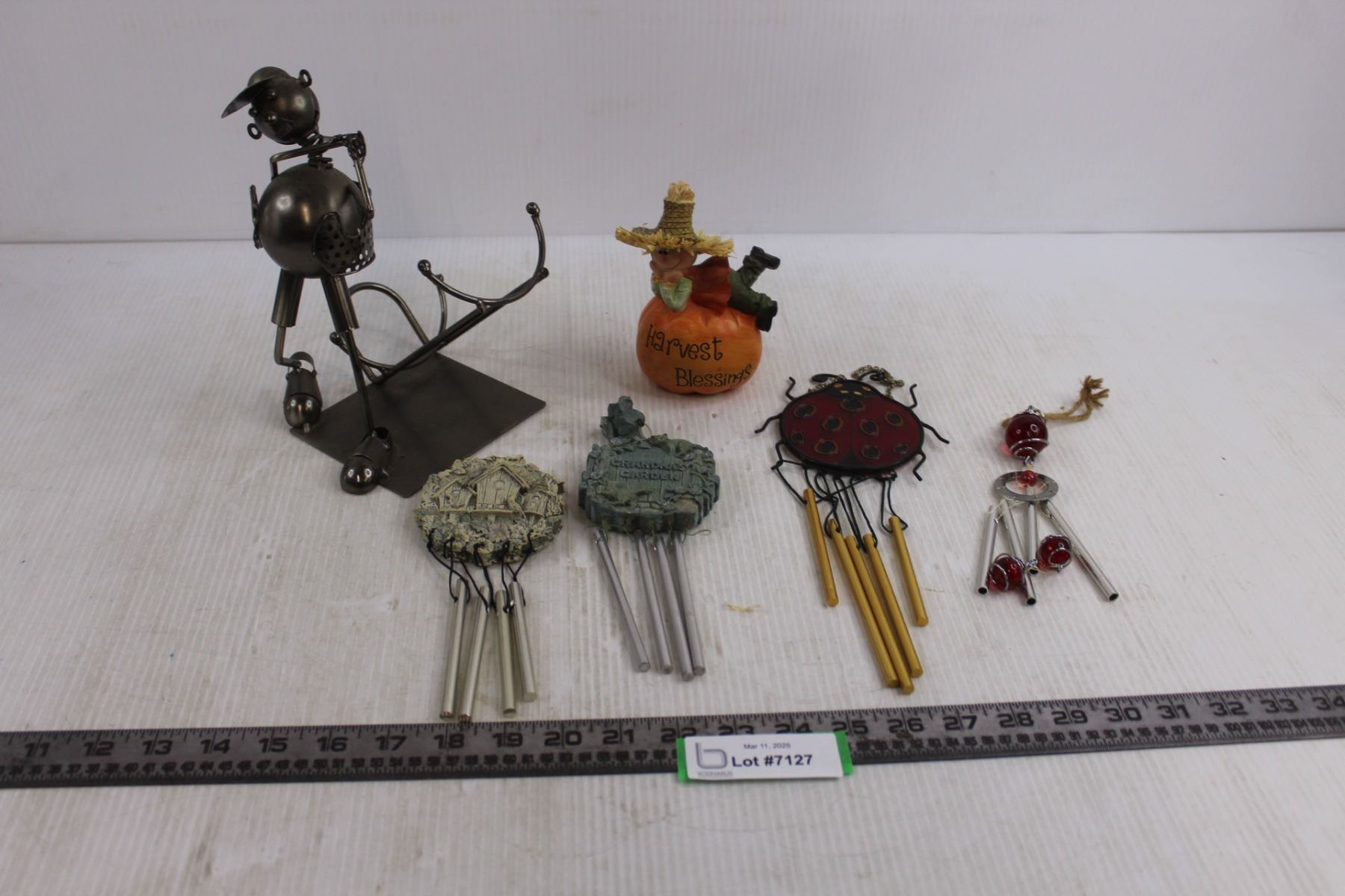 (4) Wind Chimes, Metal Art "Tipsy Golfer" Wine Bottle Caddy, "Harvest Blessings" Table Decor