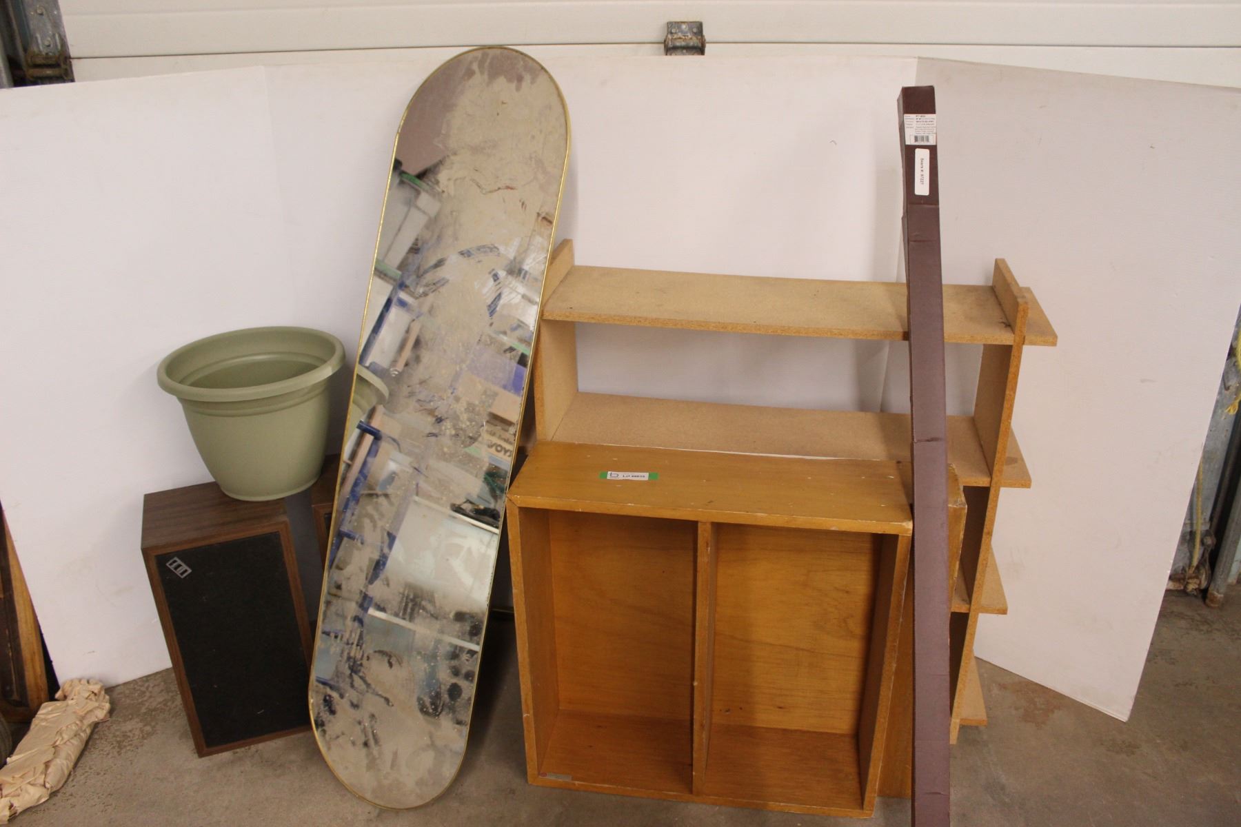 ** 48" - 84" Curtain Rod (NIB) - Long Dirty Oval Mirror - (2) Wooden Shelves - (2) Speakers - Plant Pot