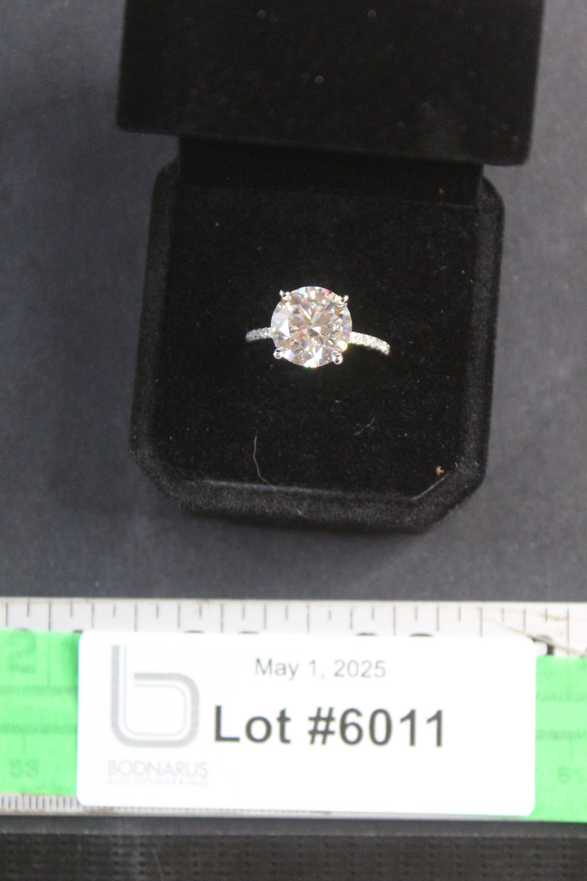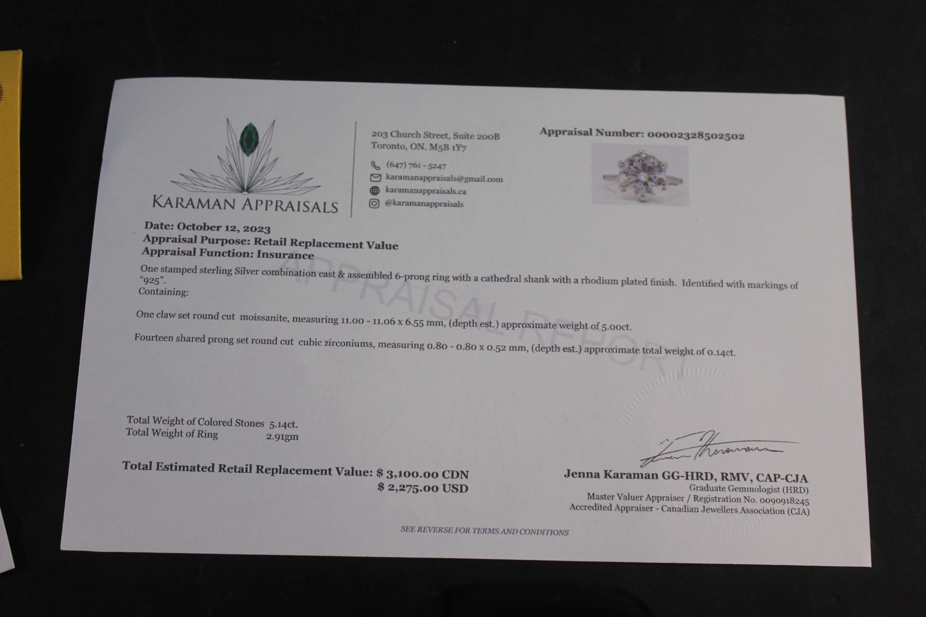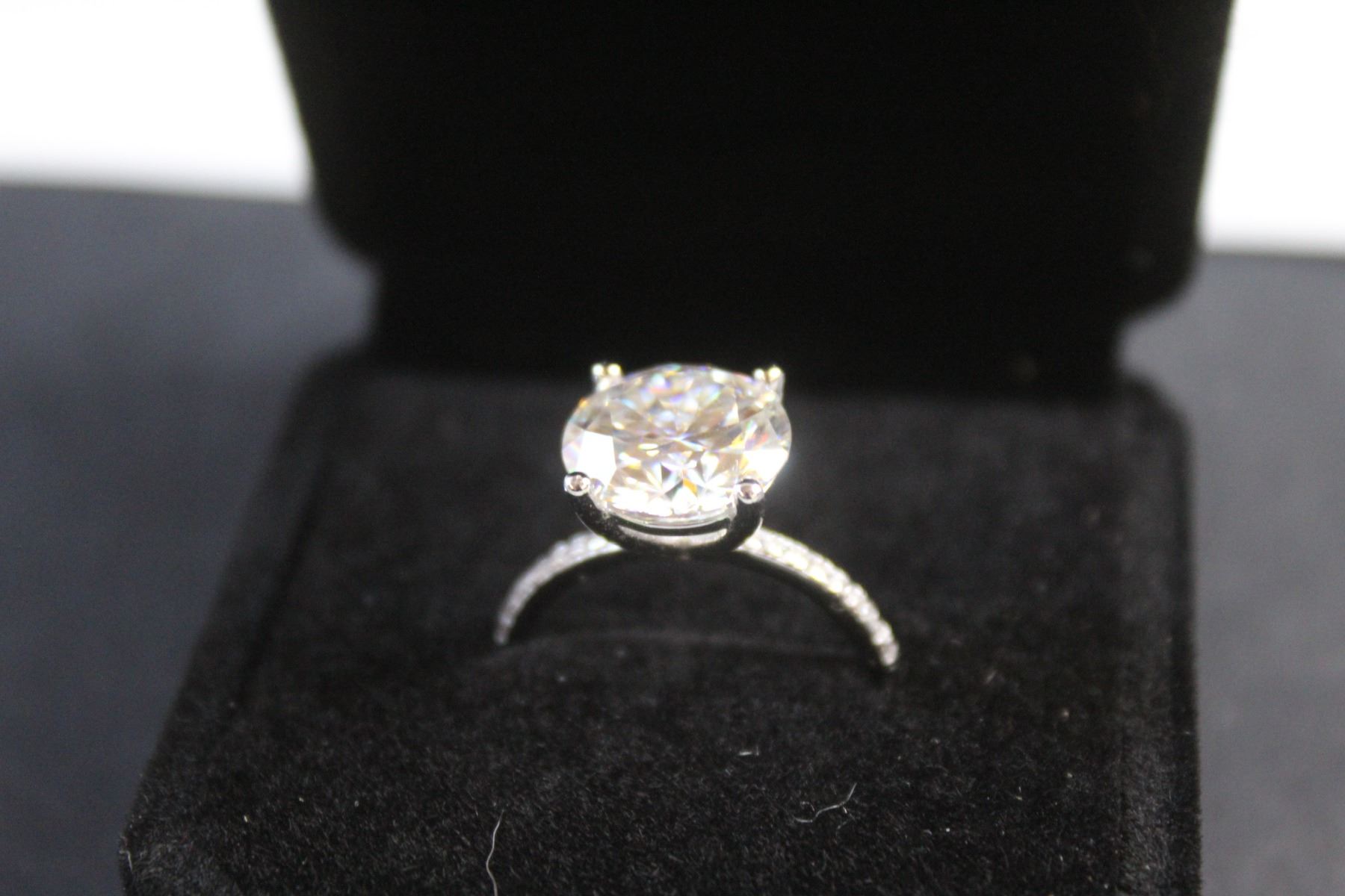 5.00 CT GRA CERTIFIED ROUND BRILLIANT CUT MOISSANITE STONE VVS D COLOR SET IN CENTER AND WITH 14 ROUND BRILLIANT CUT CUBIC ZIRCONIA SET IN SHANKS AND SET IN 925 SILVER RING SIZE 7.5 RETAIL VALUE $3100