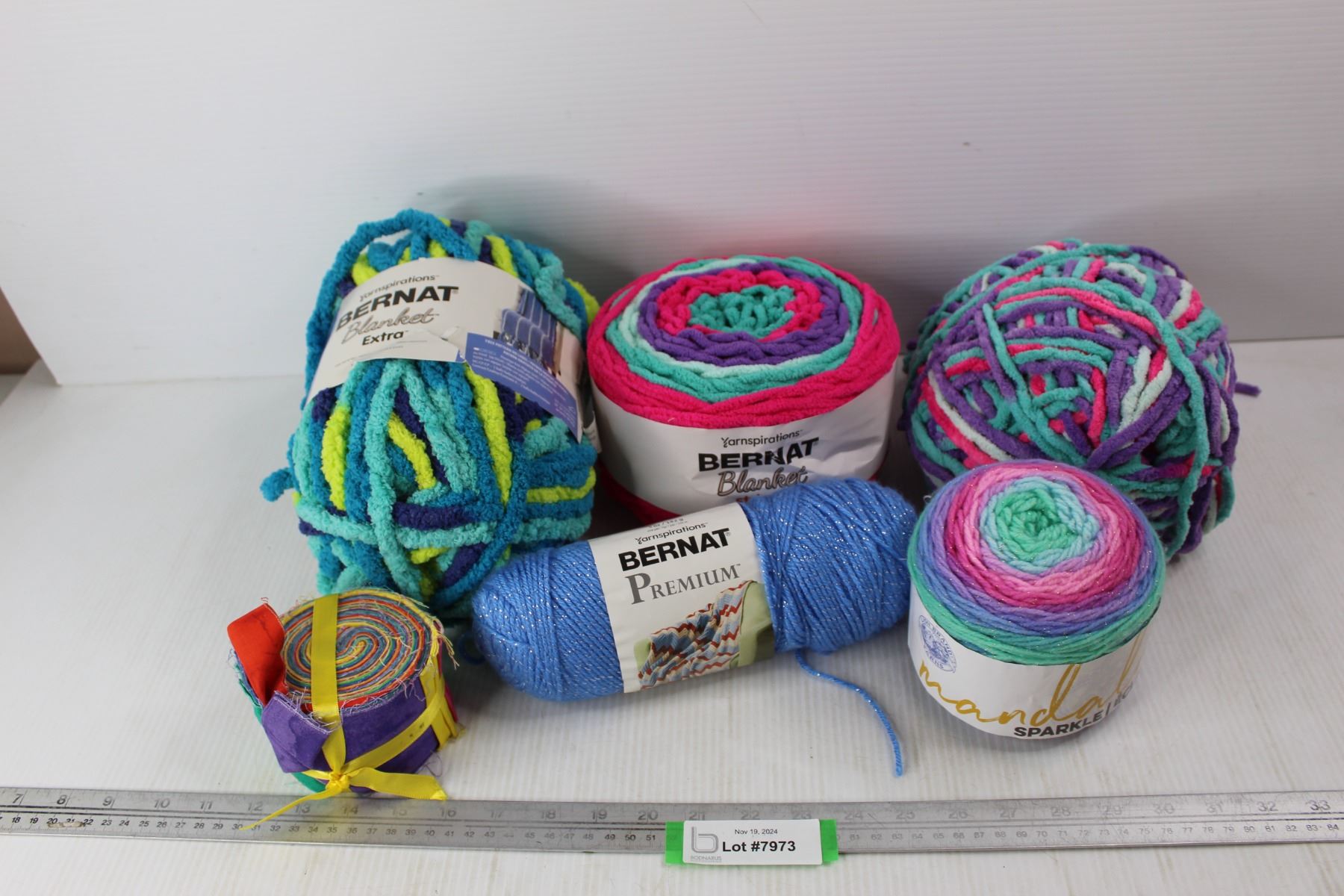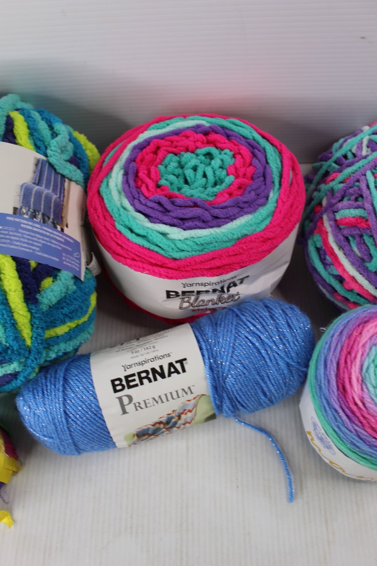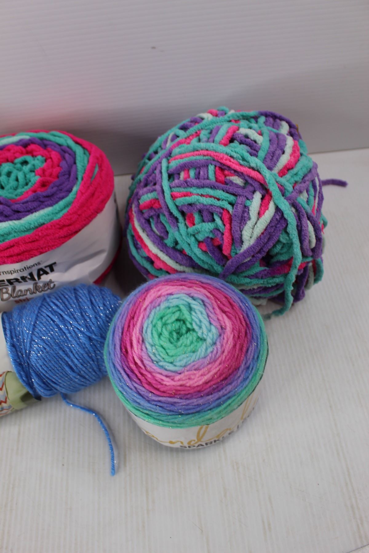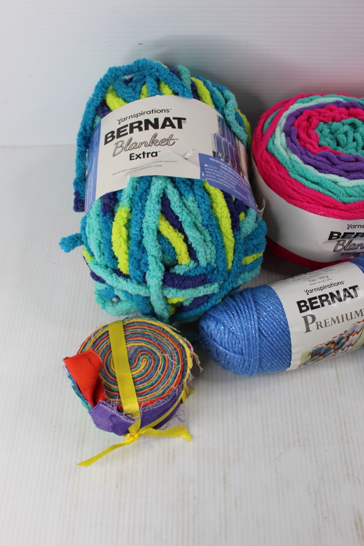 (5) Balls Of Yarn, (1) Roll Of Fabric Scraps