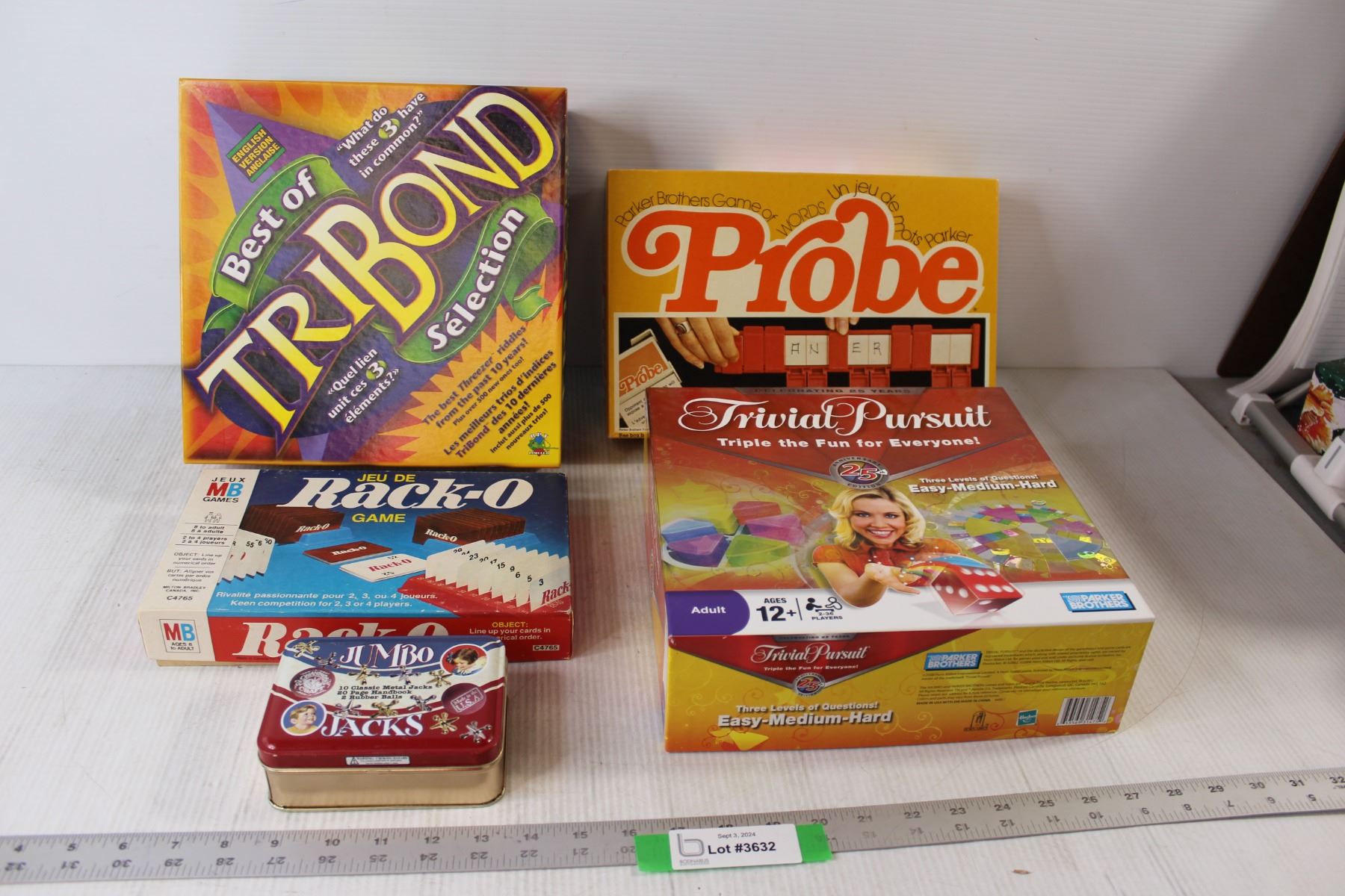 (5) Board Games: Probe, Best Of TriBond, Rack-O, Trivia Pursuit, Jumbo Jacks - All As Is