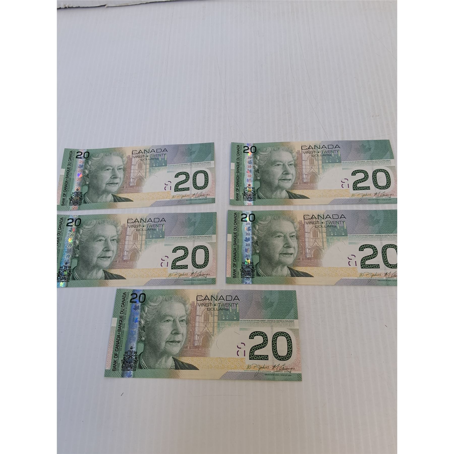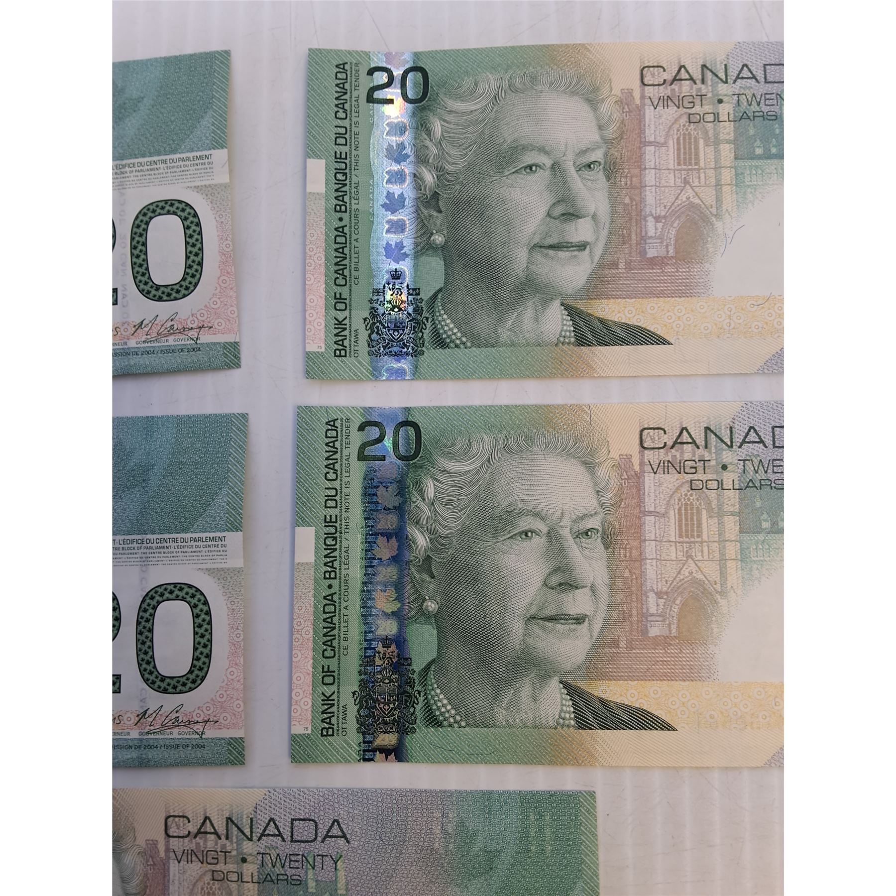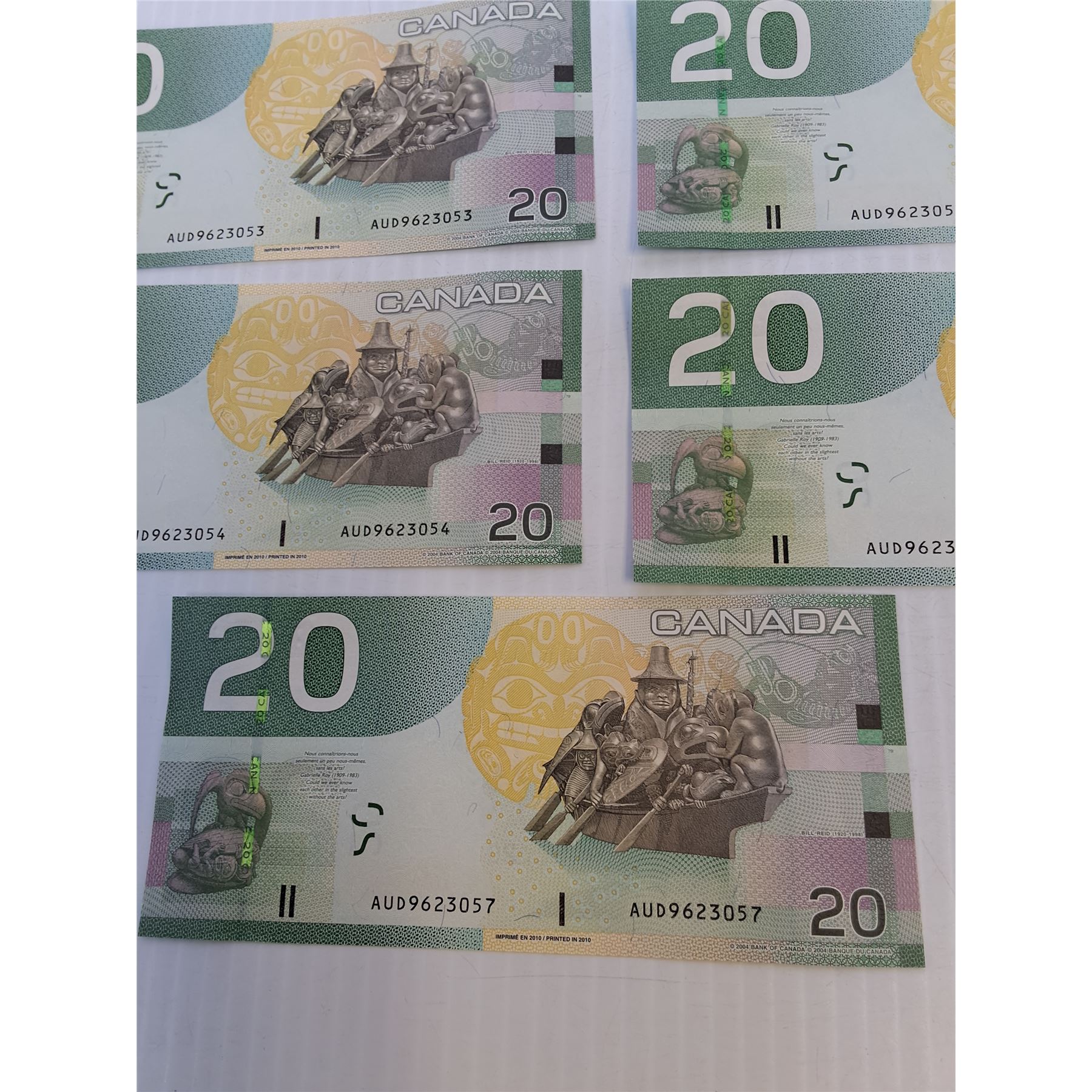 ^(5) Canadian Twenty Dollar Bills (Sequential Order) - Issued 2004, Printed 2010 - Uncirculated