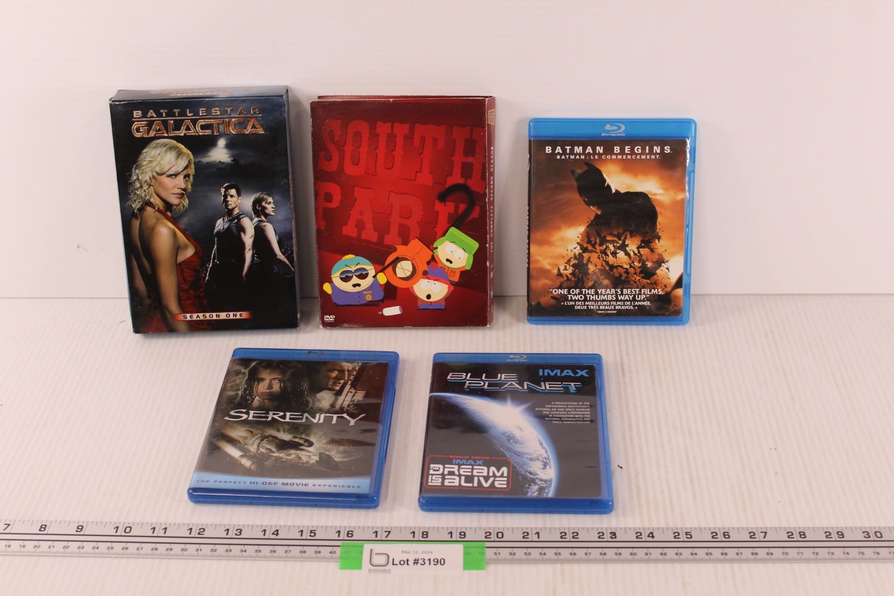 (5) DVDS: Battlestar Galactica Season One, South Park 2, Batman Begins, Blue Planet, Serenity