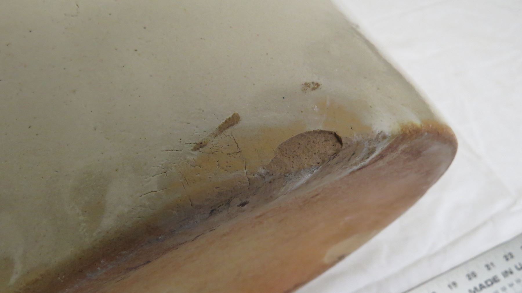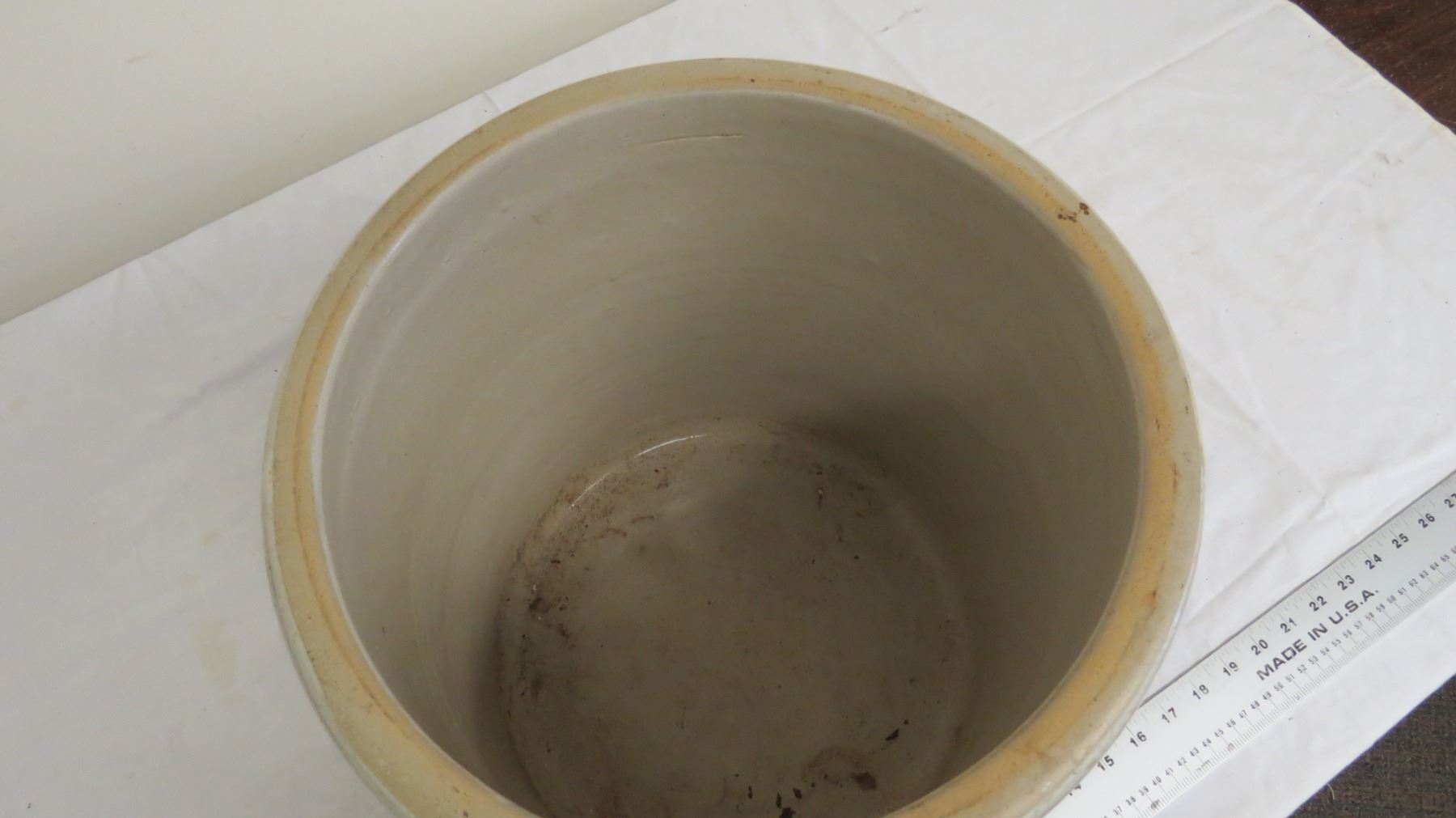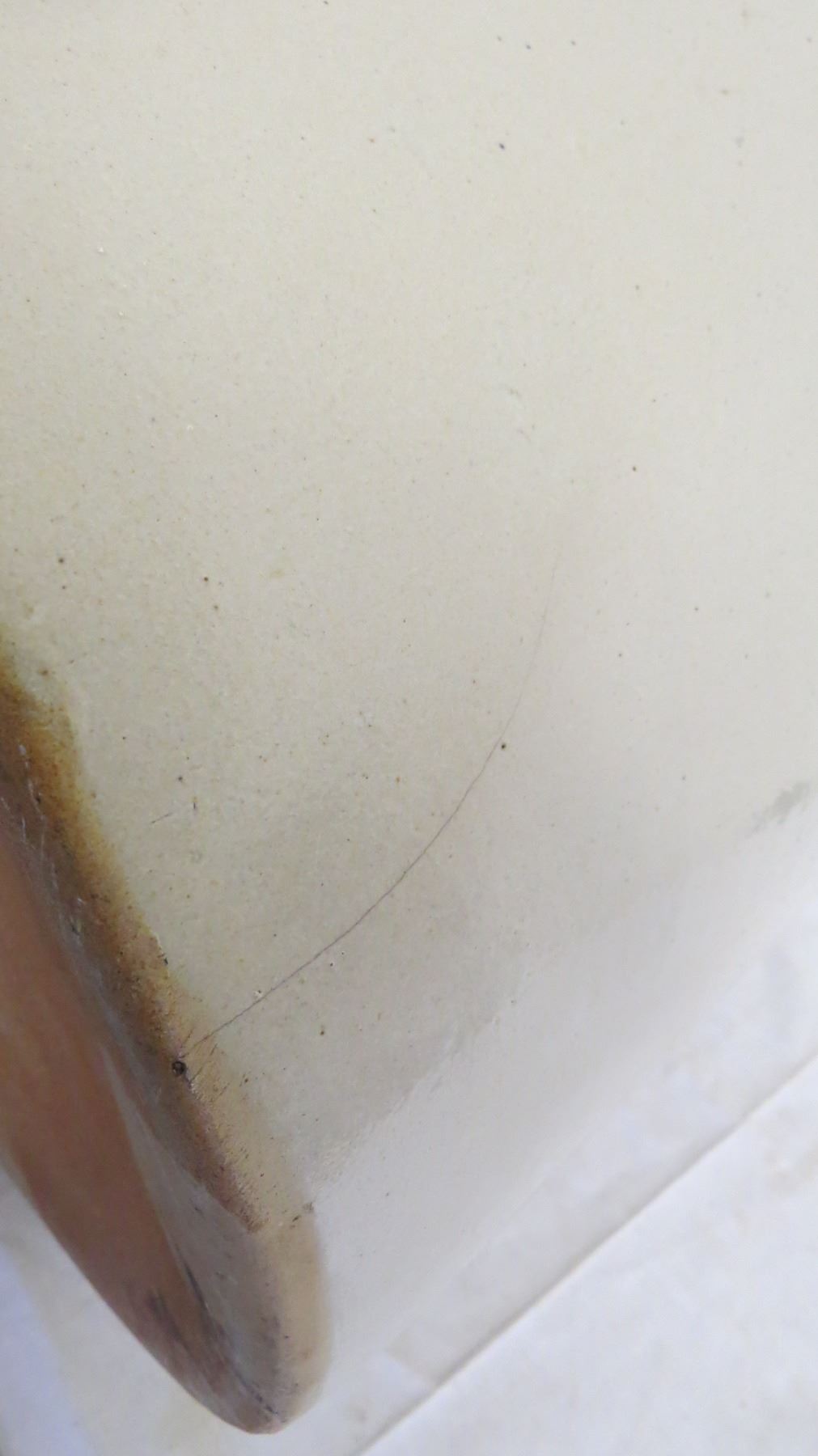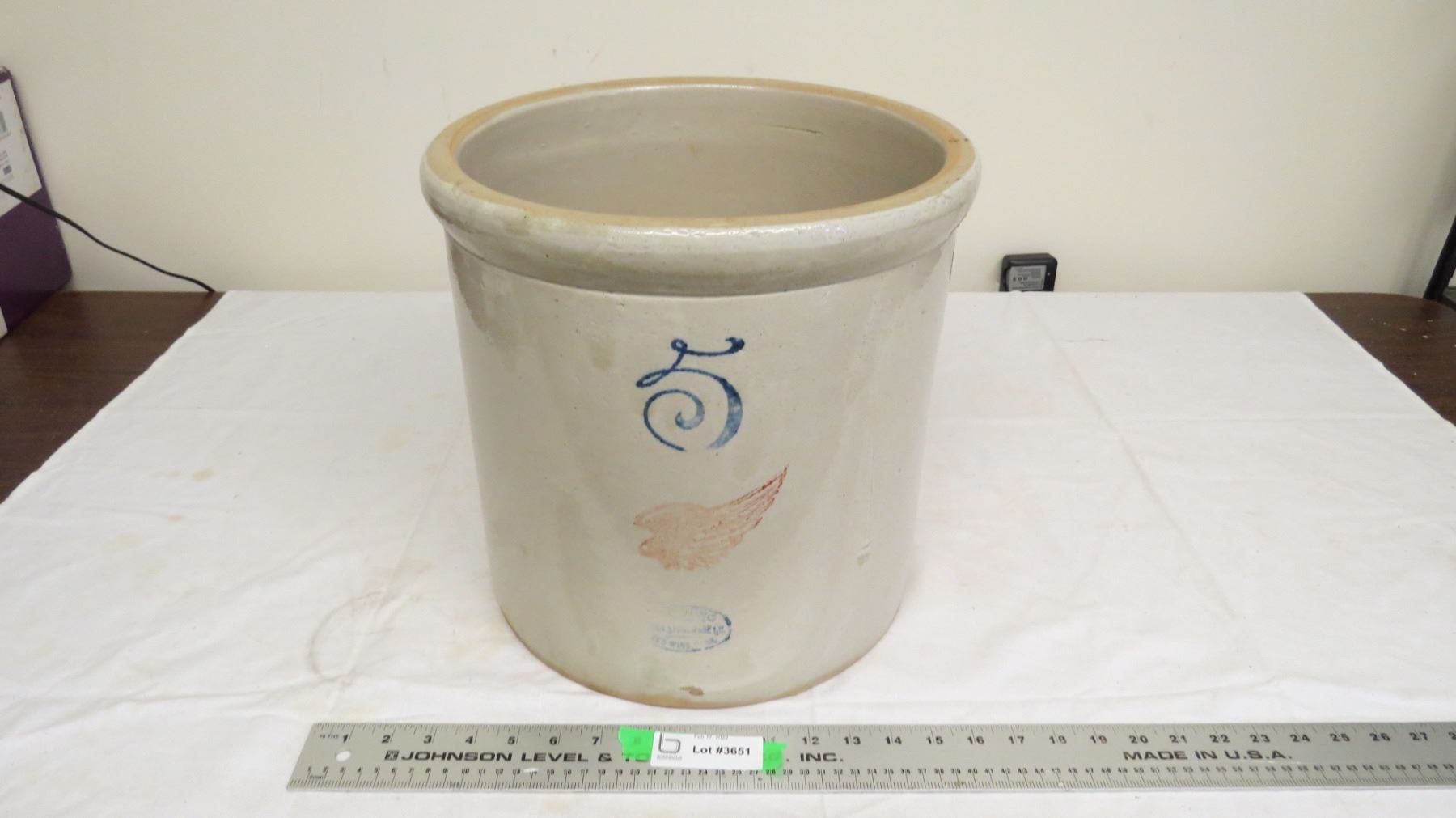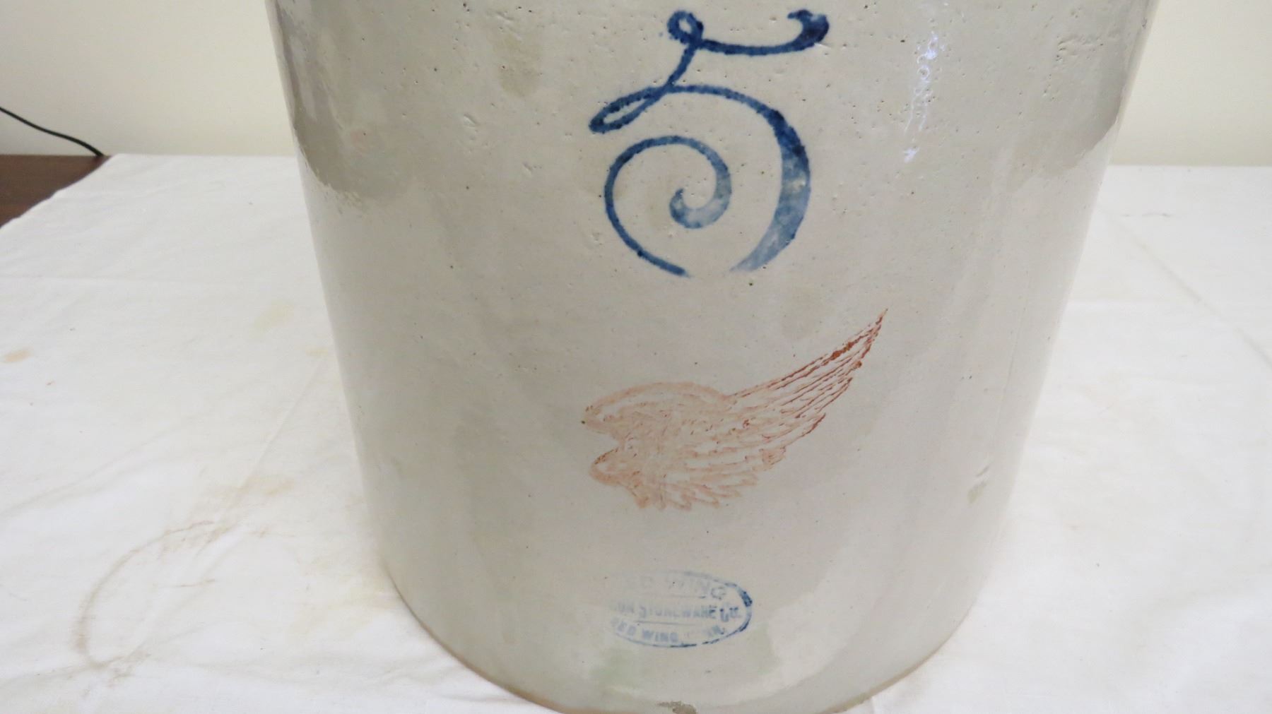 5 Gal Redwing stoneware crock - small chip + hairline crack on bottom