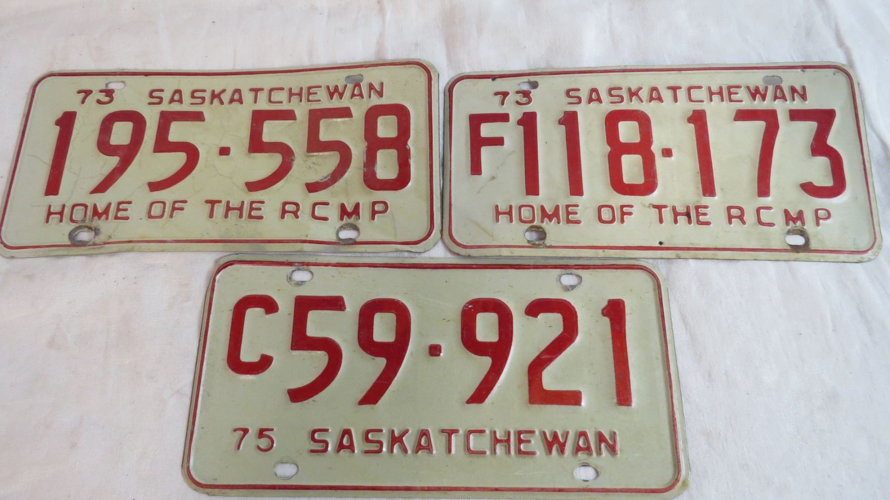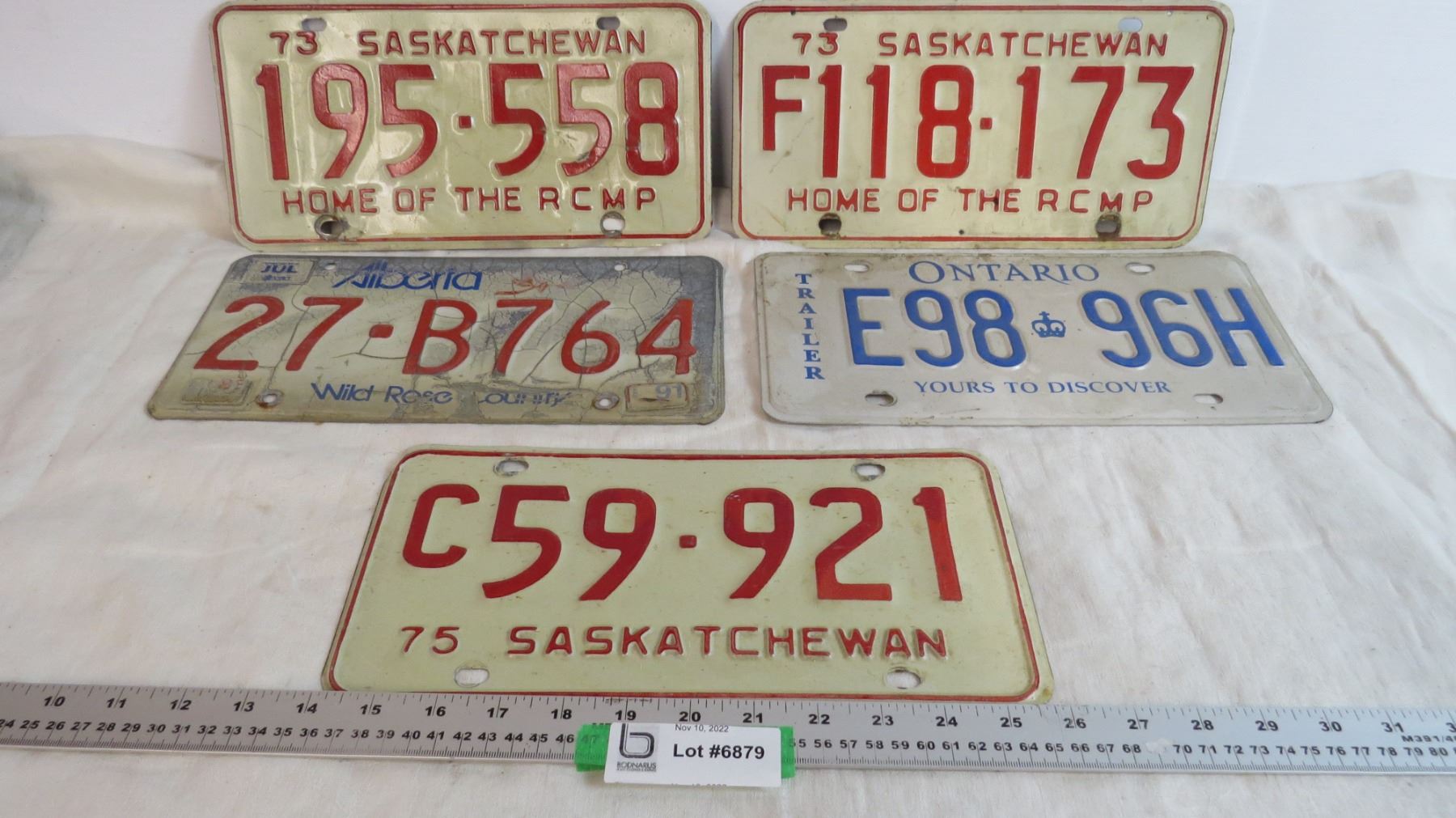 (5) License Plates - Saskatchewan, Ontario, Alberta