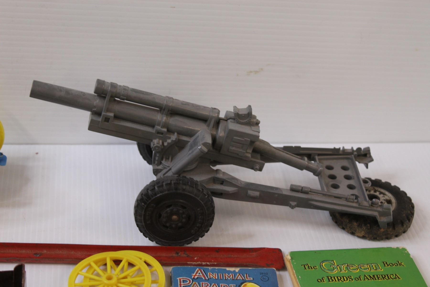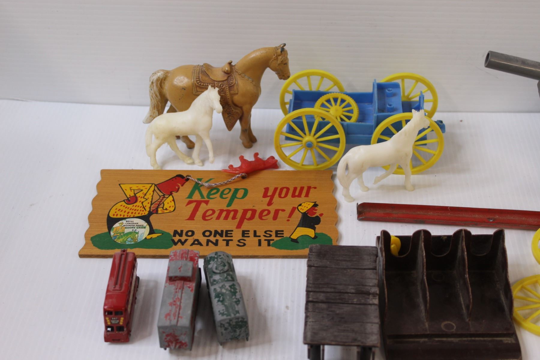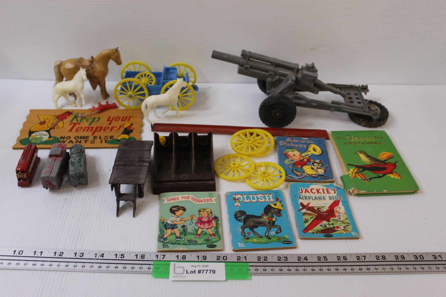(5) Mini Vintage Kids Books, Cannon toy, Die Cast Bus & Train, Plastic Wagon & Horses, Misc.