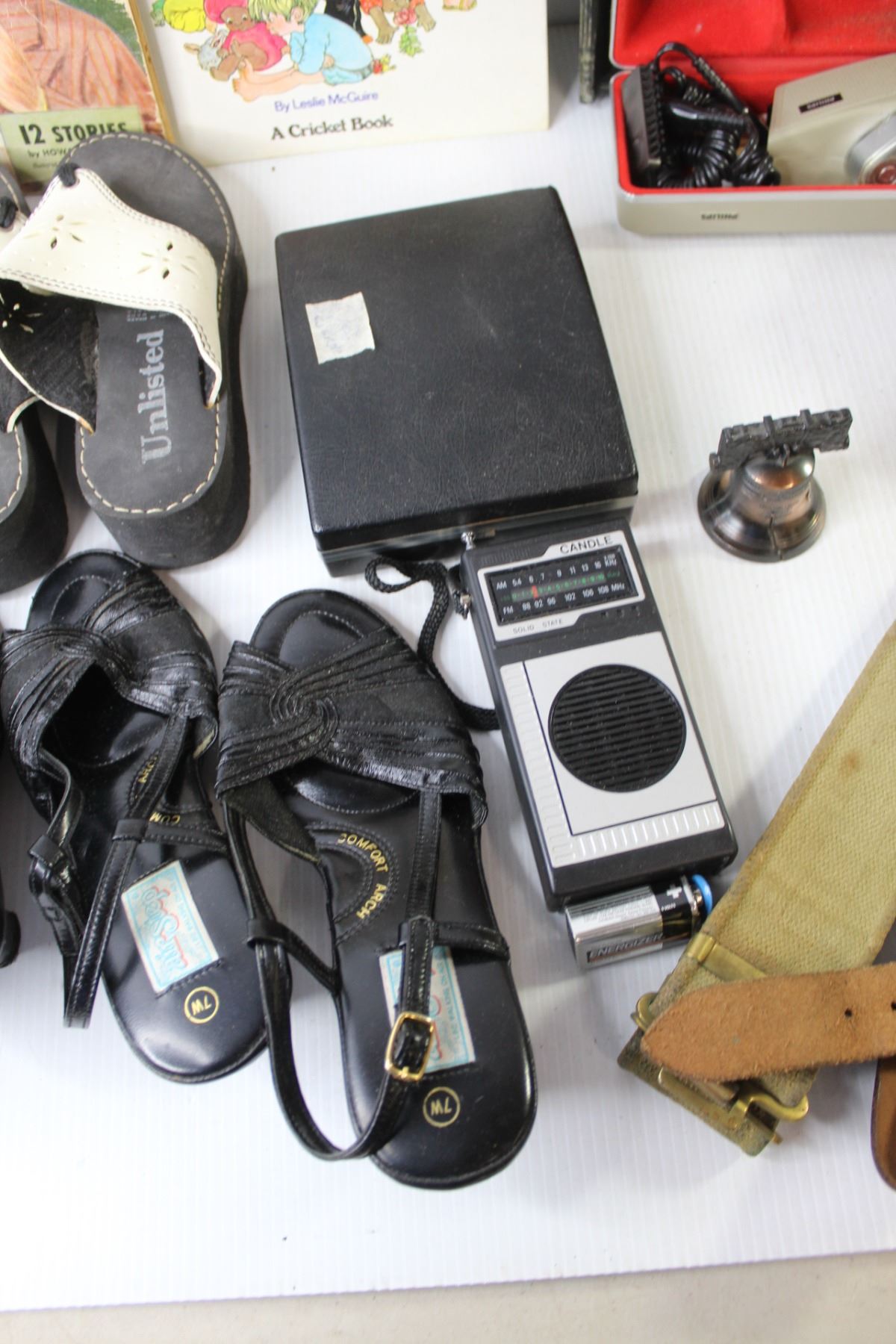 (5) Pairs of Shoes (Women's Size 7W), (2) Vintage Men's Electric Shavers, Candle Radio, Liberty Bell Ornament, Extra Fabric, Serving Tray, (2) Books (Uncle Wiggly, Human Body Book), Belts, Misc.