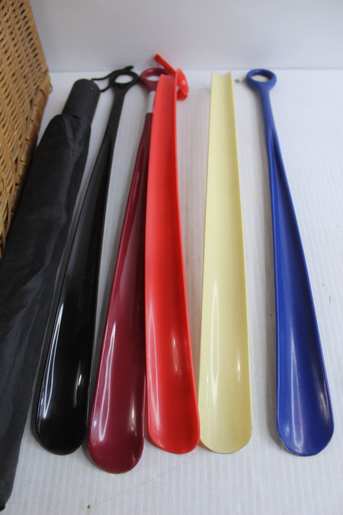 (5) Shoe Horns, (2) Umbrellas, Basket