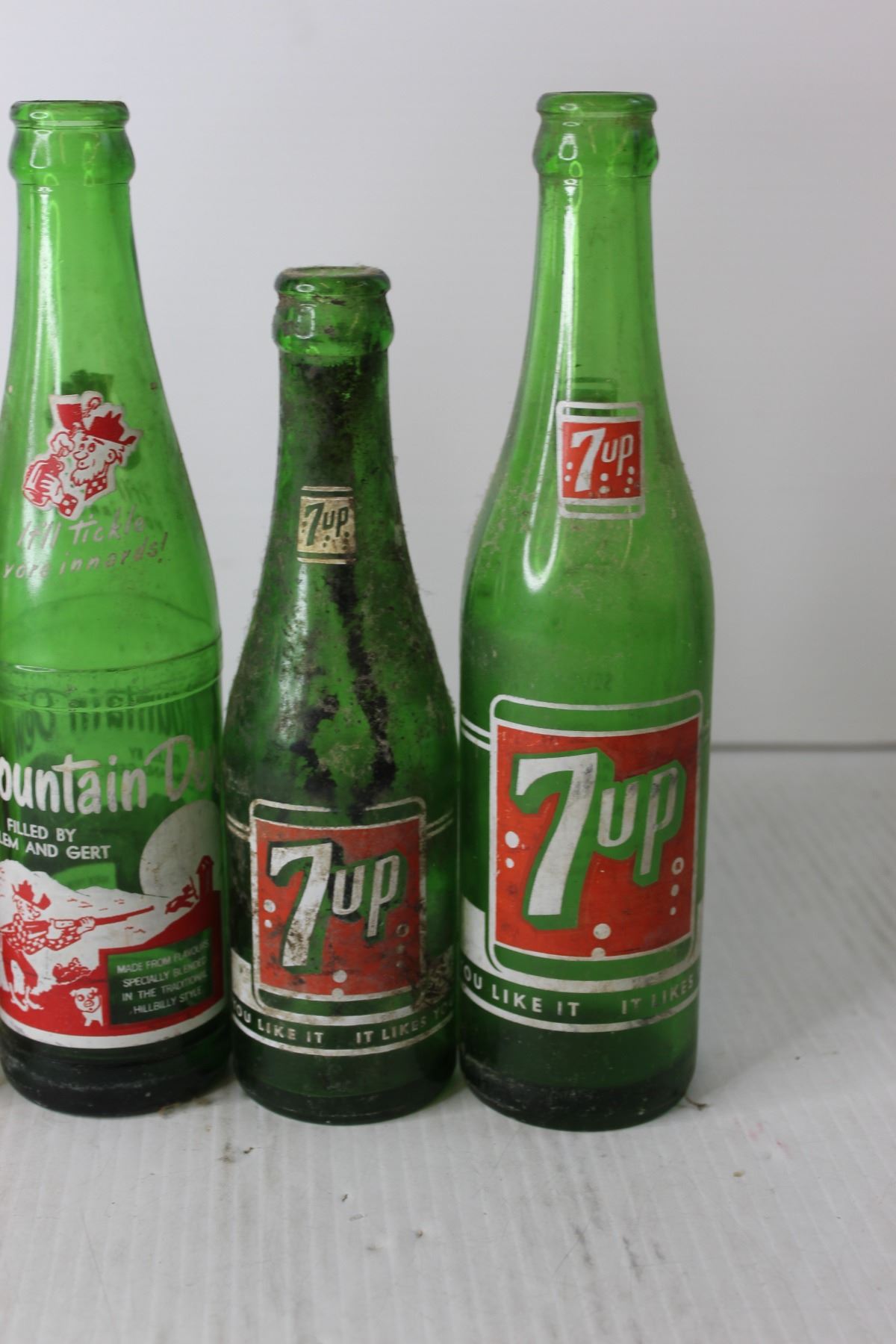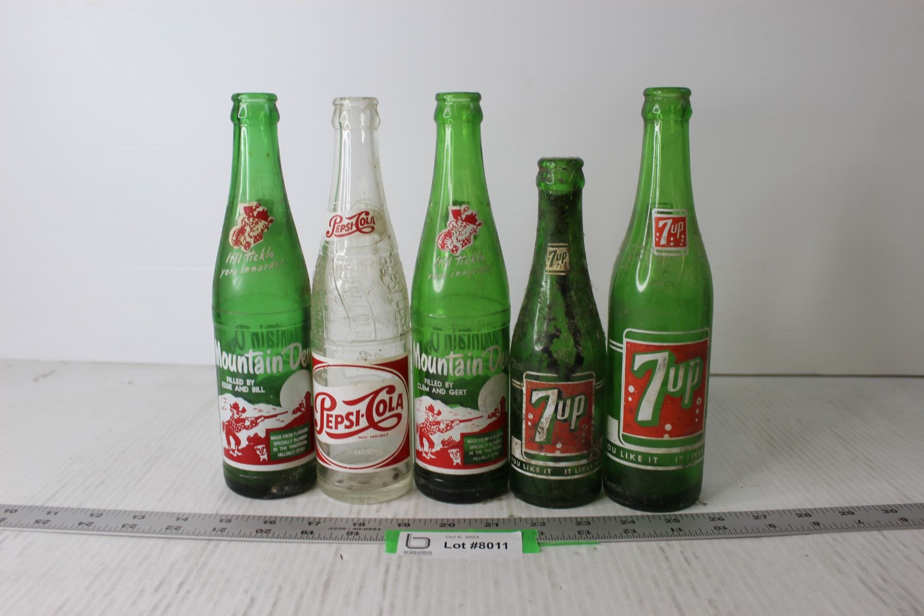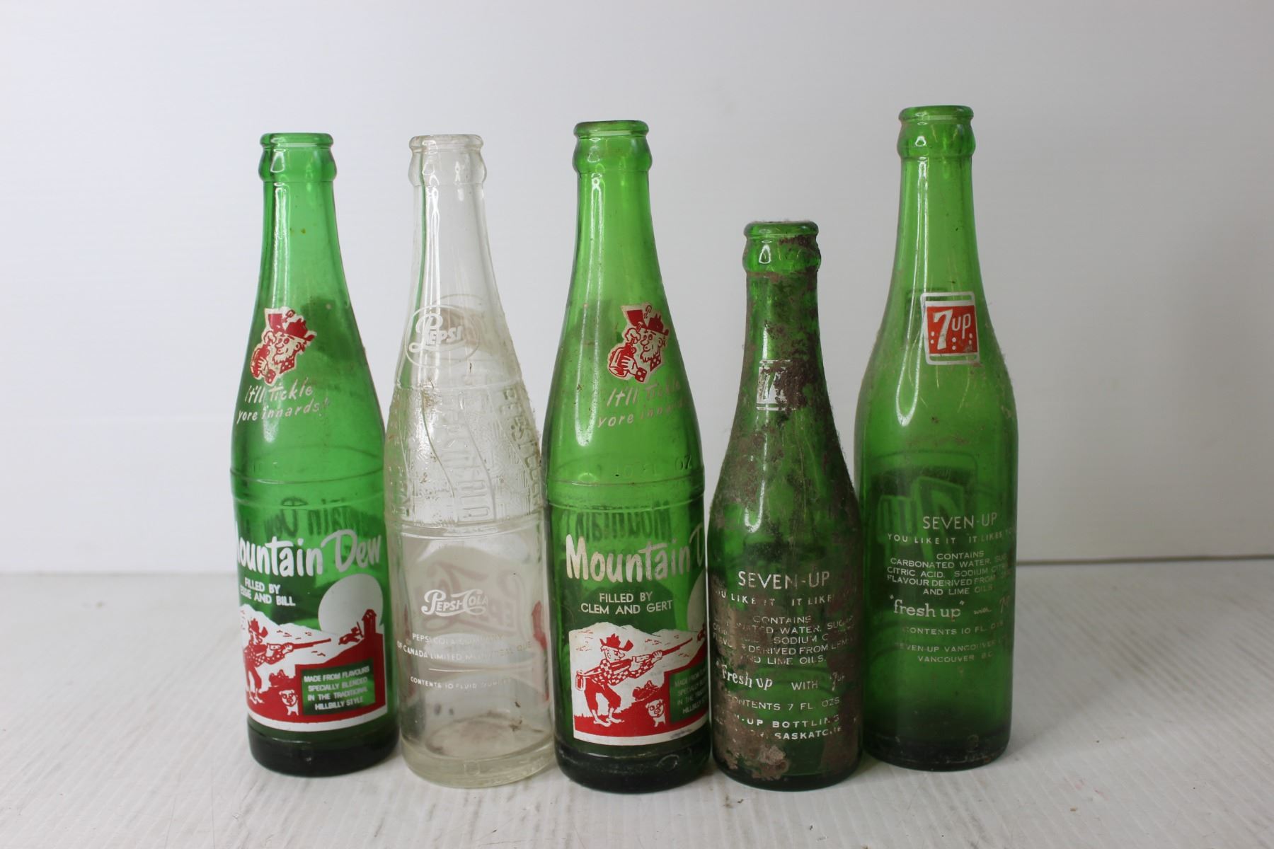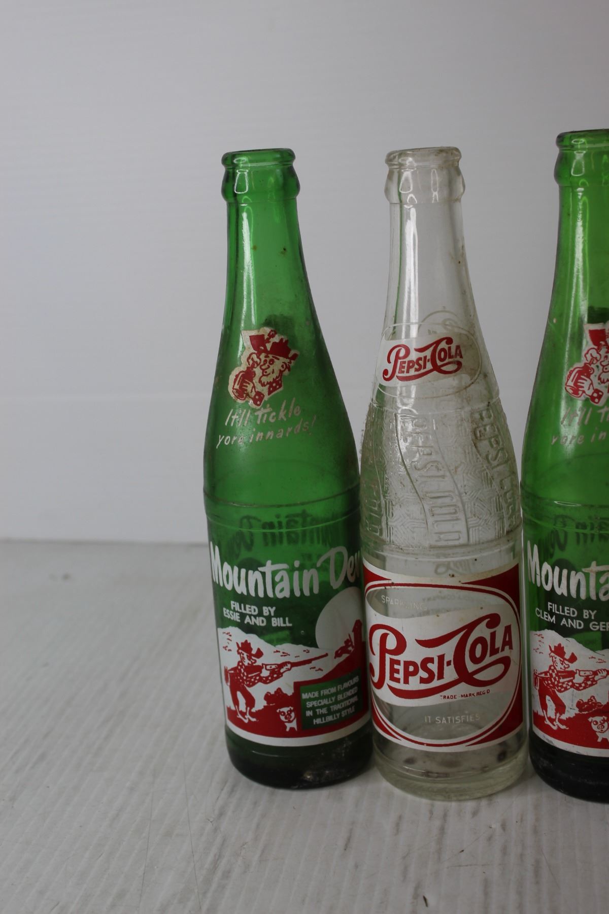 (5) Vintage Glass Bottles - Mountain Dew and Coca Cola