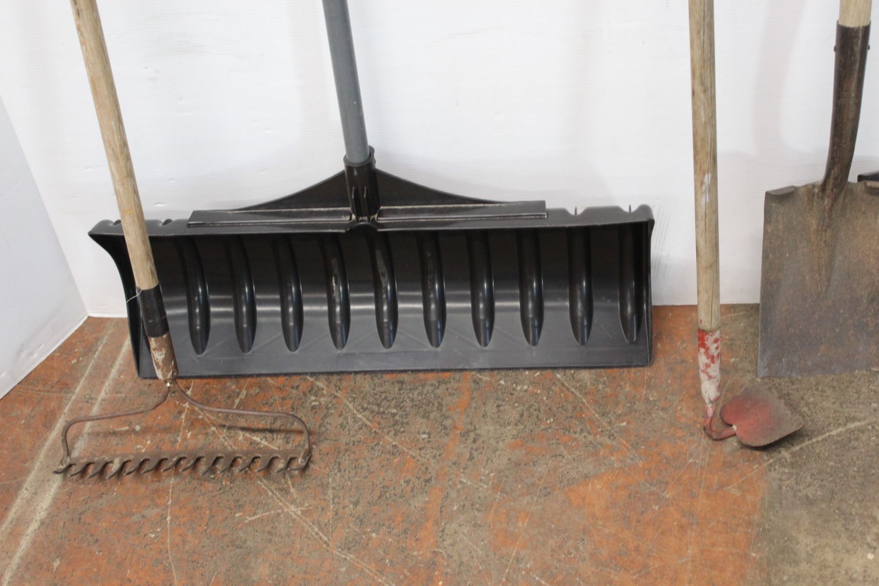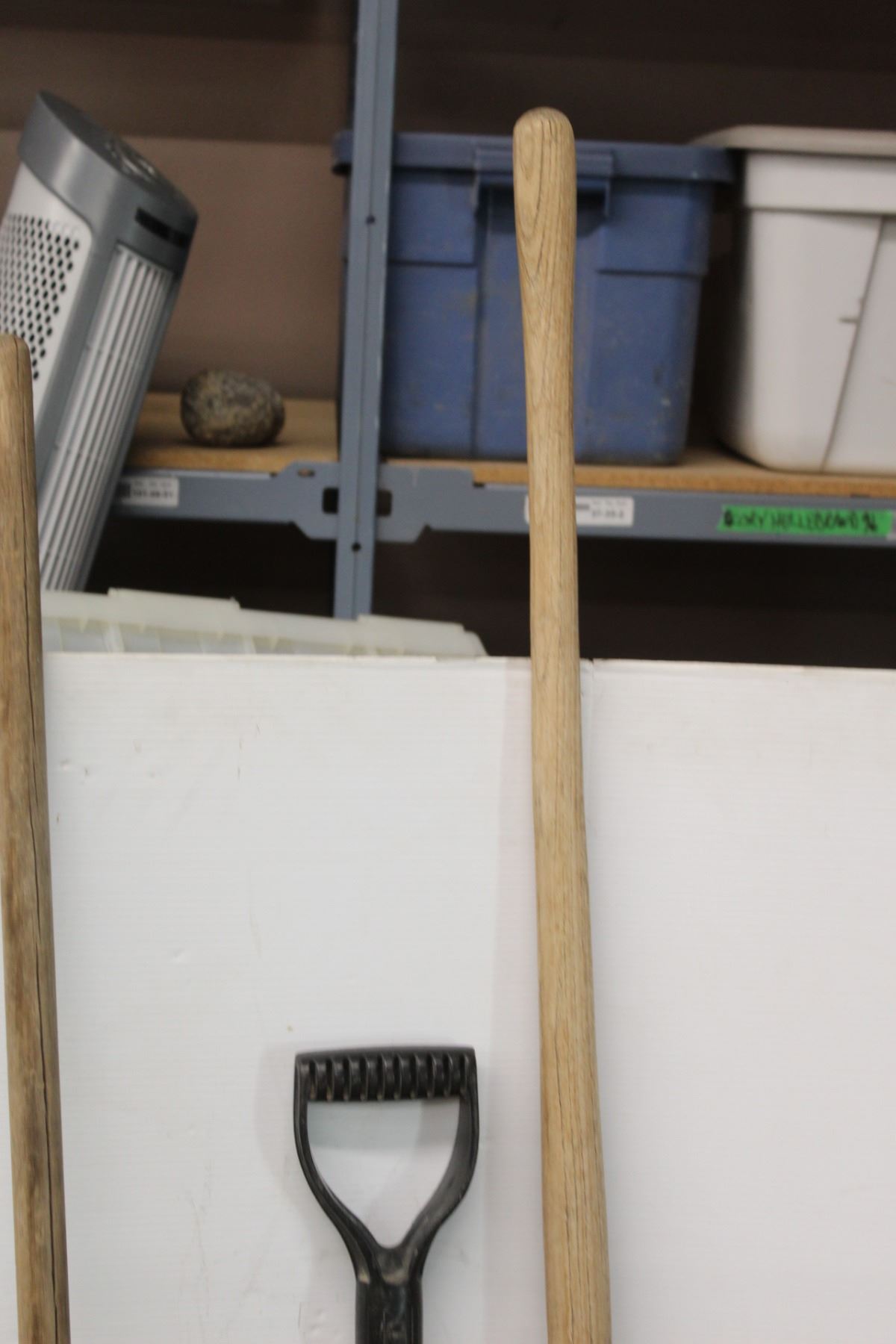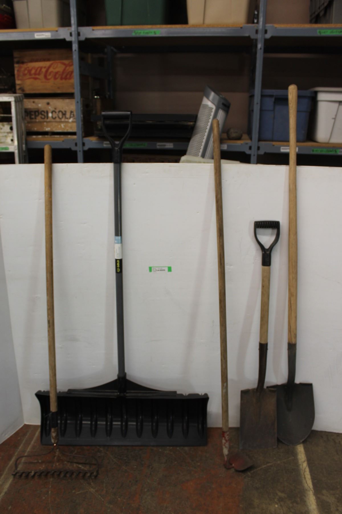 * (5) Yard Tools: Snow Shovel, Rake, Hoe, Square Mouth Spade, Spade