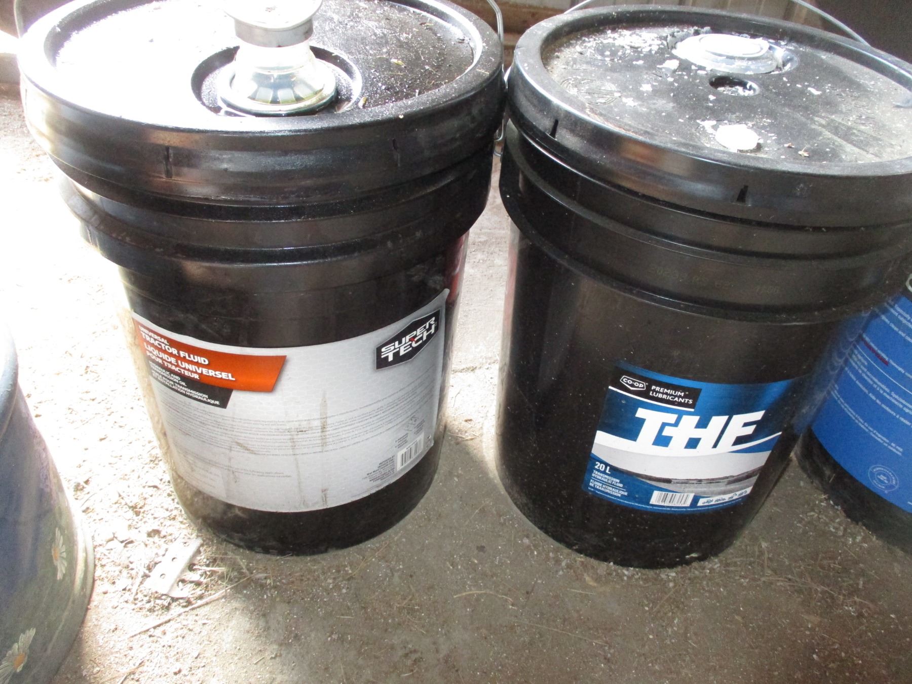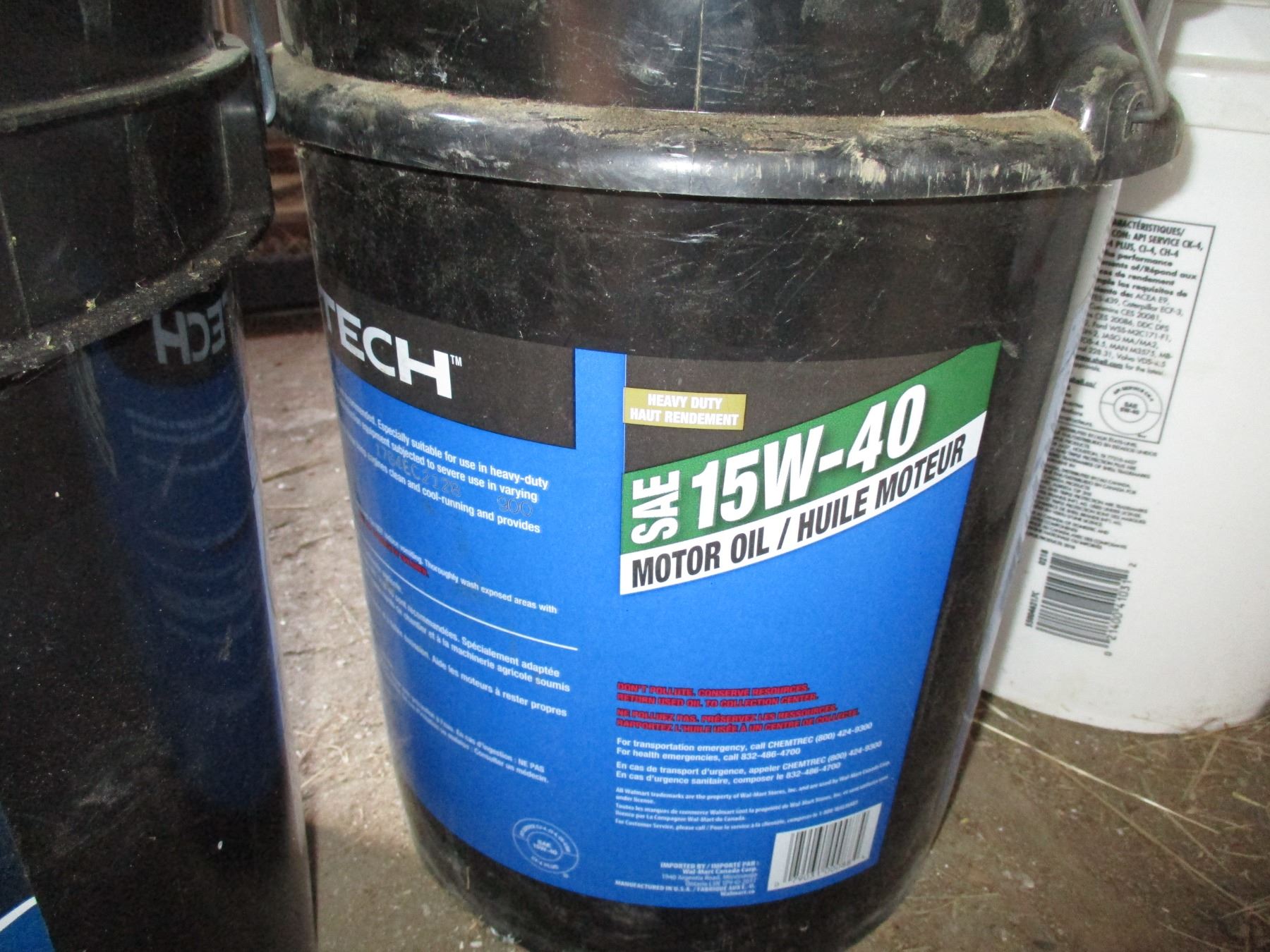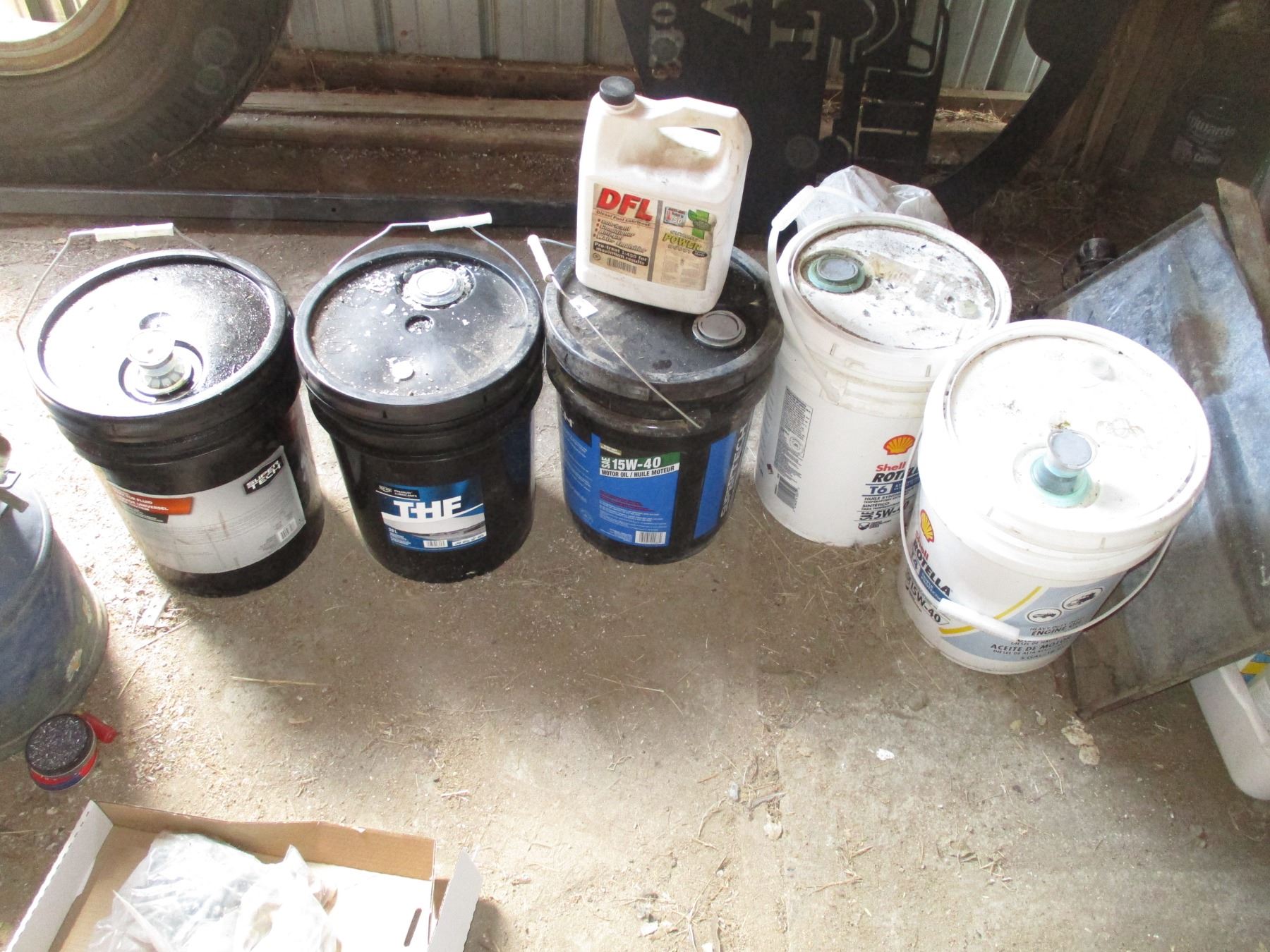 (5) pail contents 15W30, 15W40, some fuel + funnel