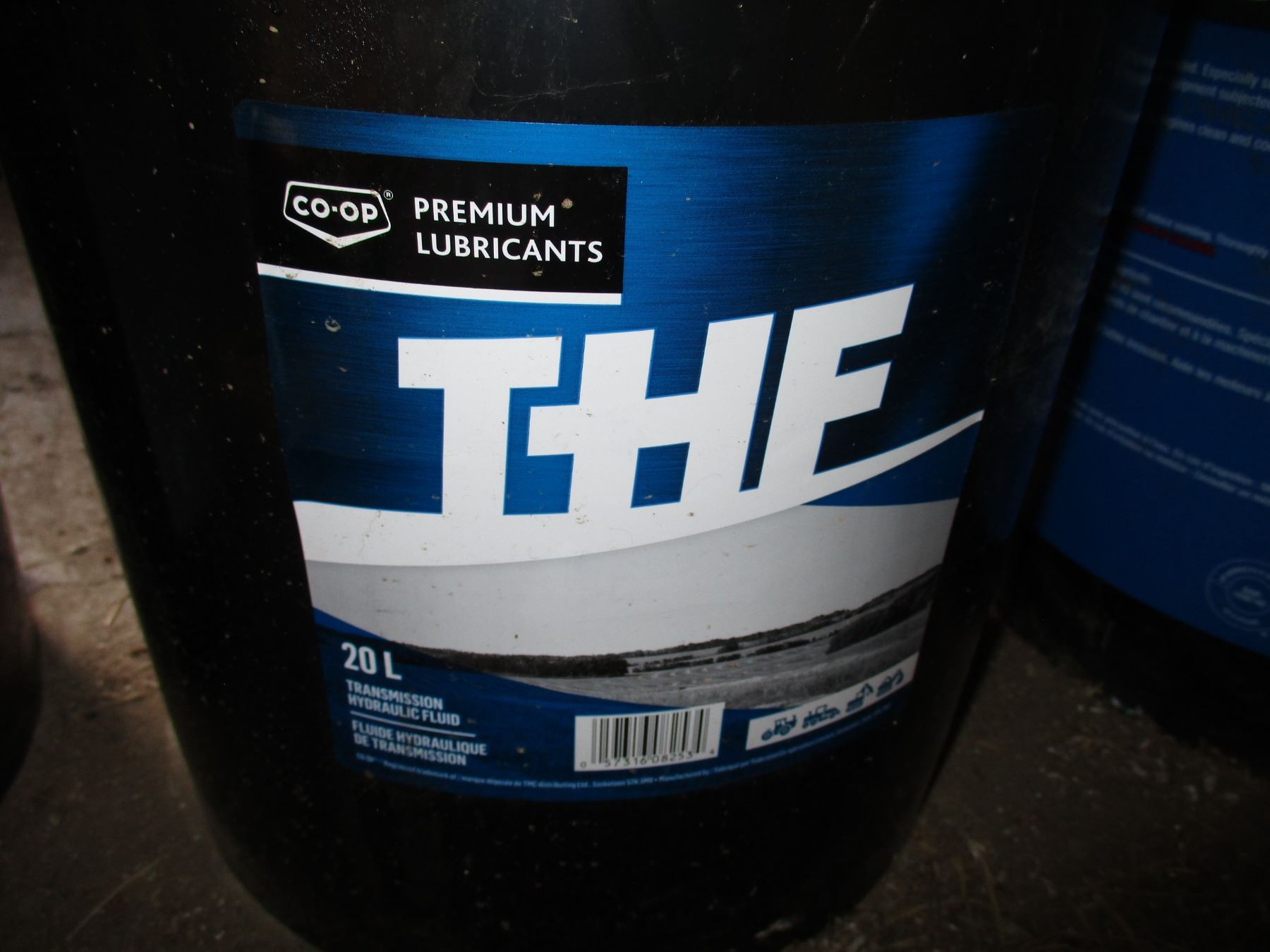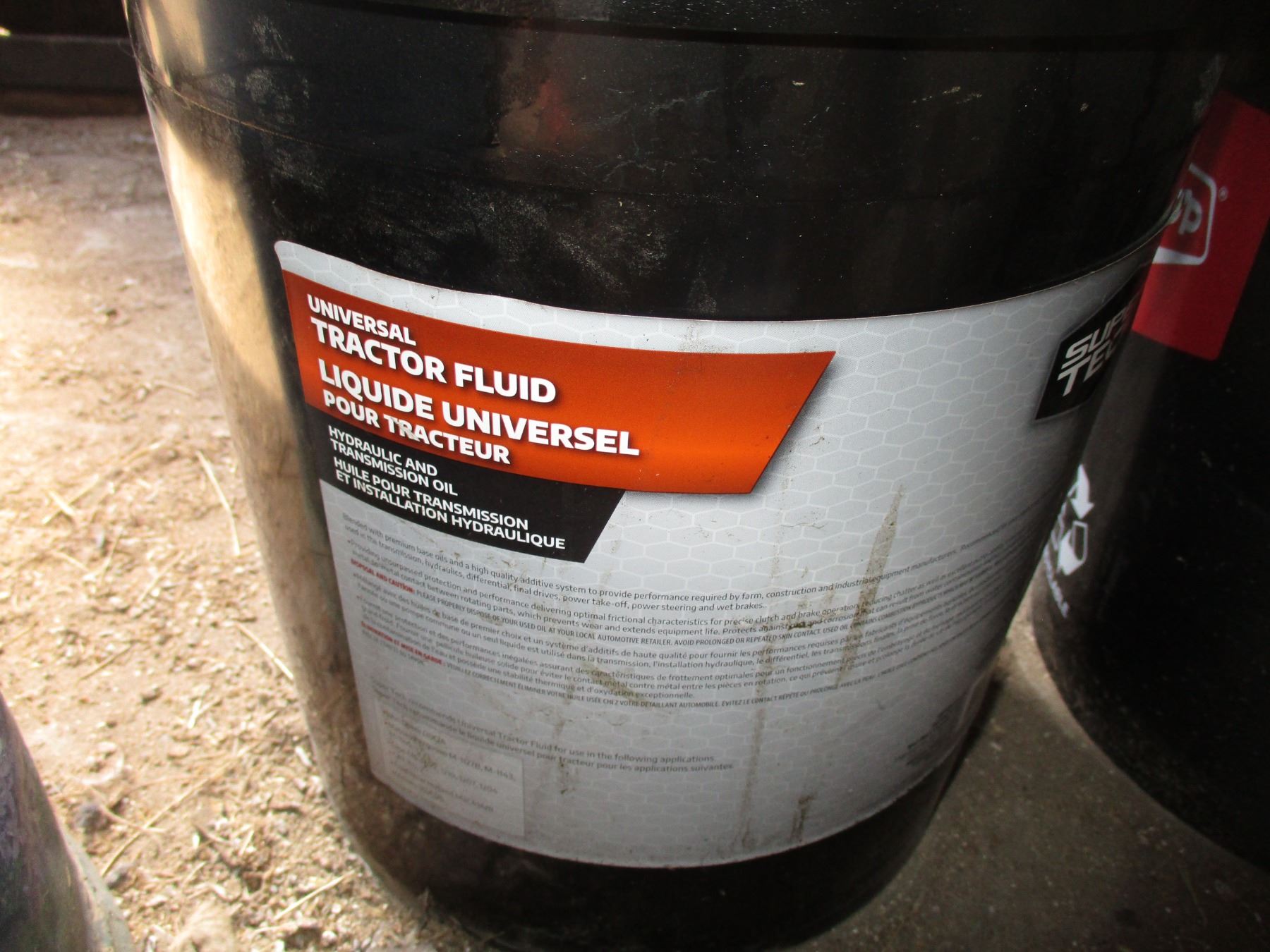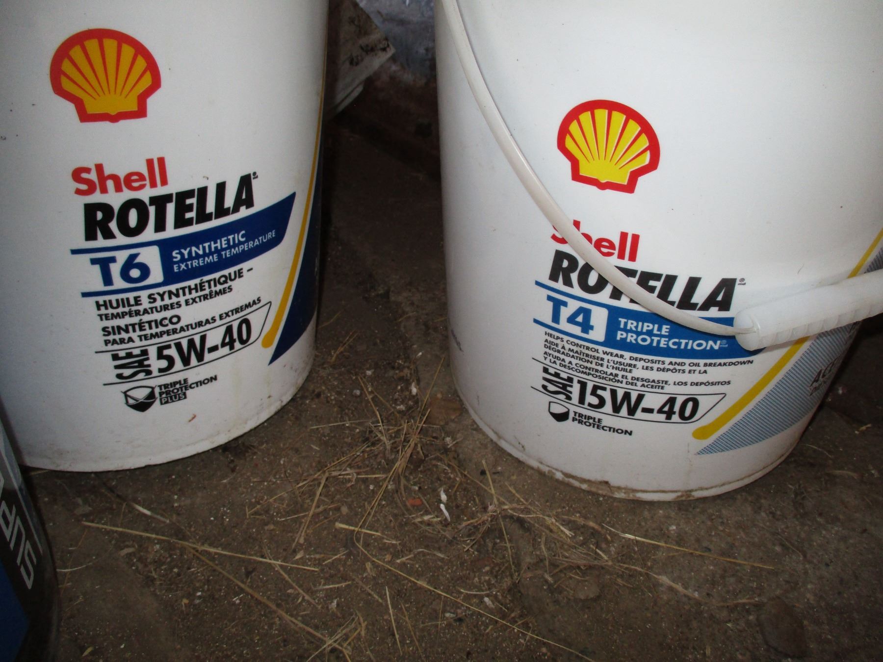 (5) pail contents 15W30, 15W40, some fuel + funnel