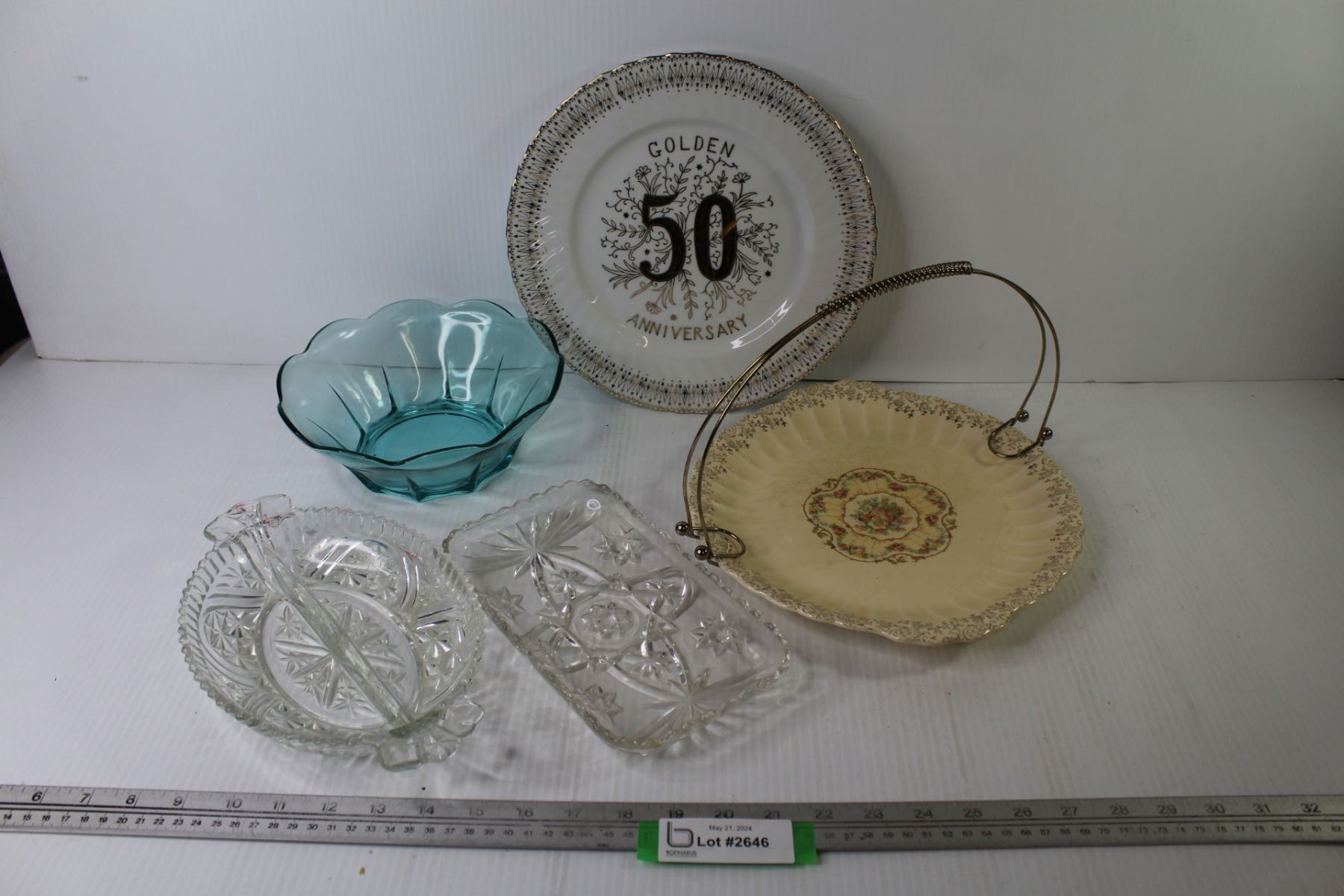 50th Anniversary Plate - Vintage Plate w/Wire Handle - Crystal Dishes - Blue Glass Bowl