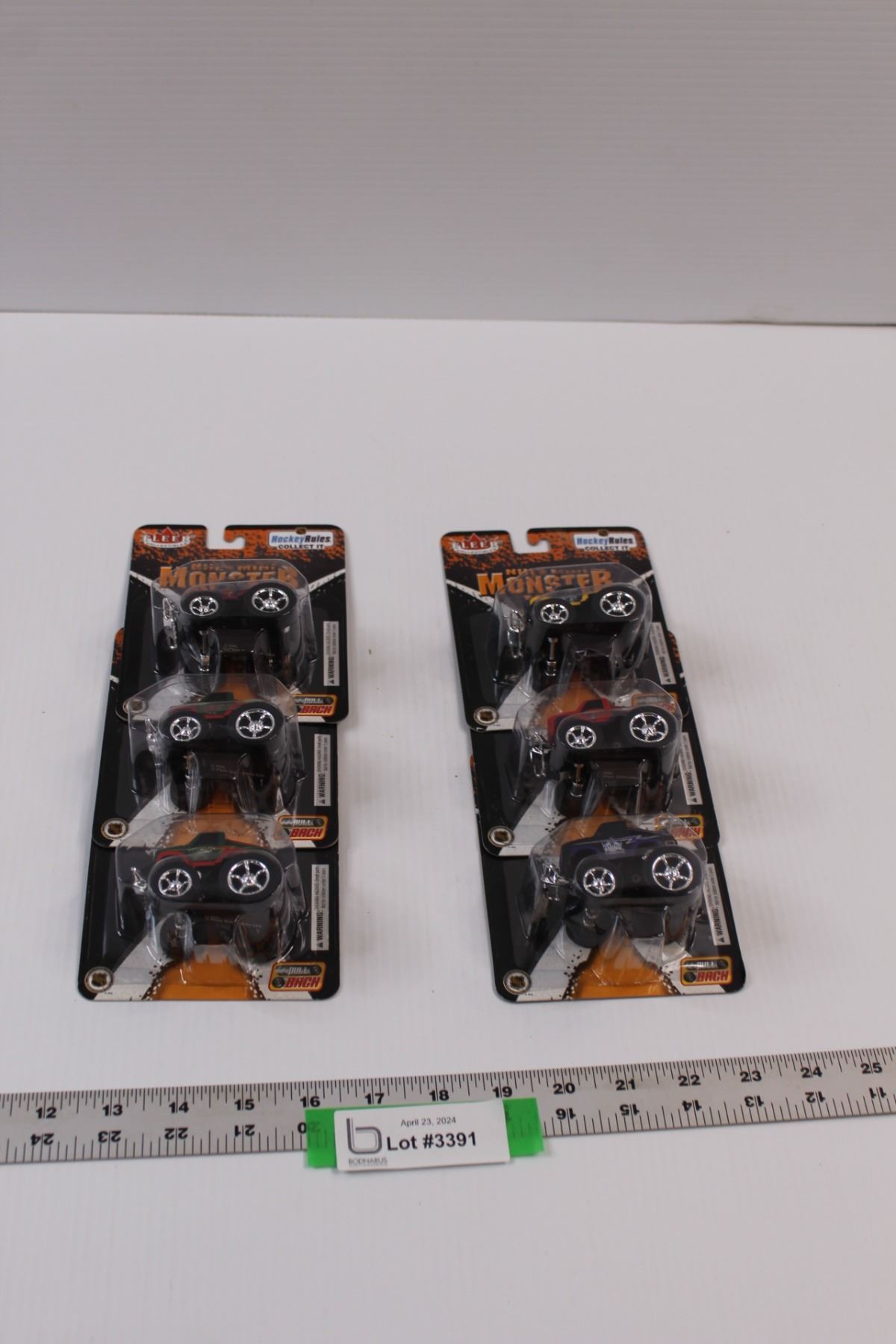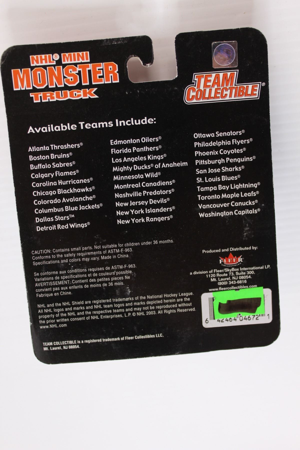 (6) 2003 Fleer Collectables NHL Licensed Hockey Rules NHL MINI Monster Truck Pull Backs - Nashville, Atlanta, Florida, L.A & Minnesota (New in Packages)