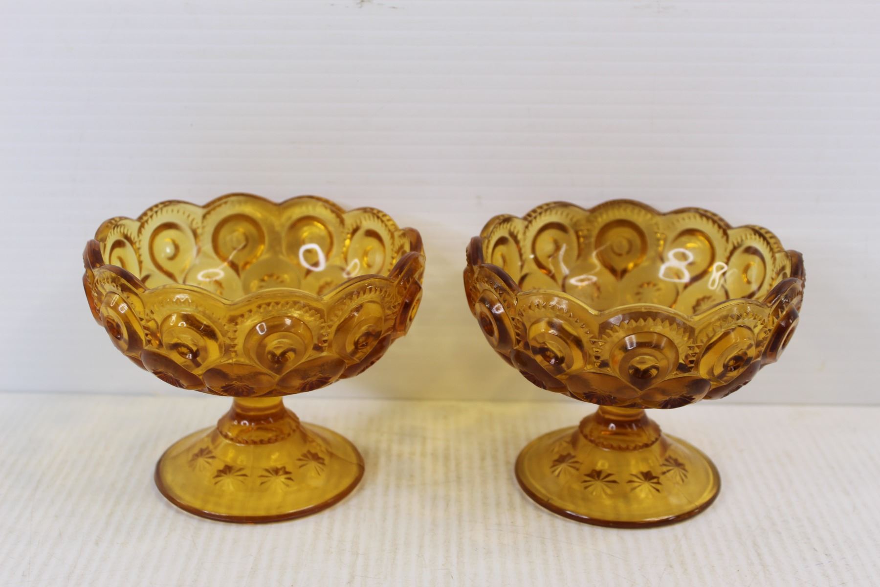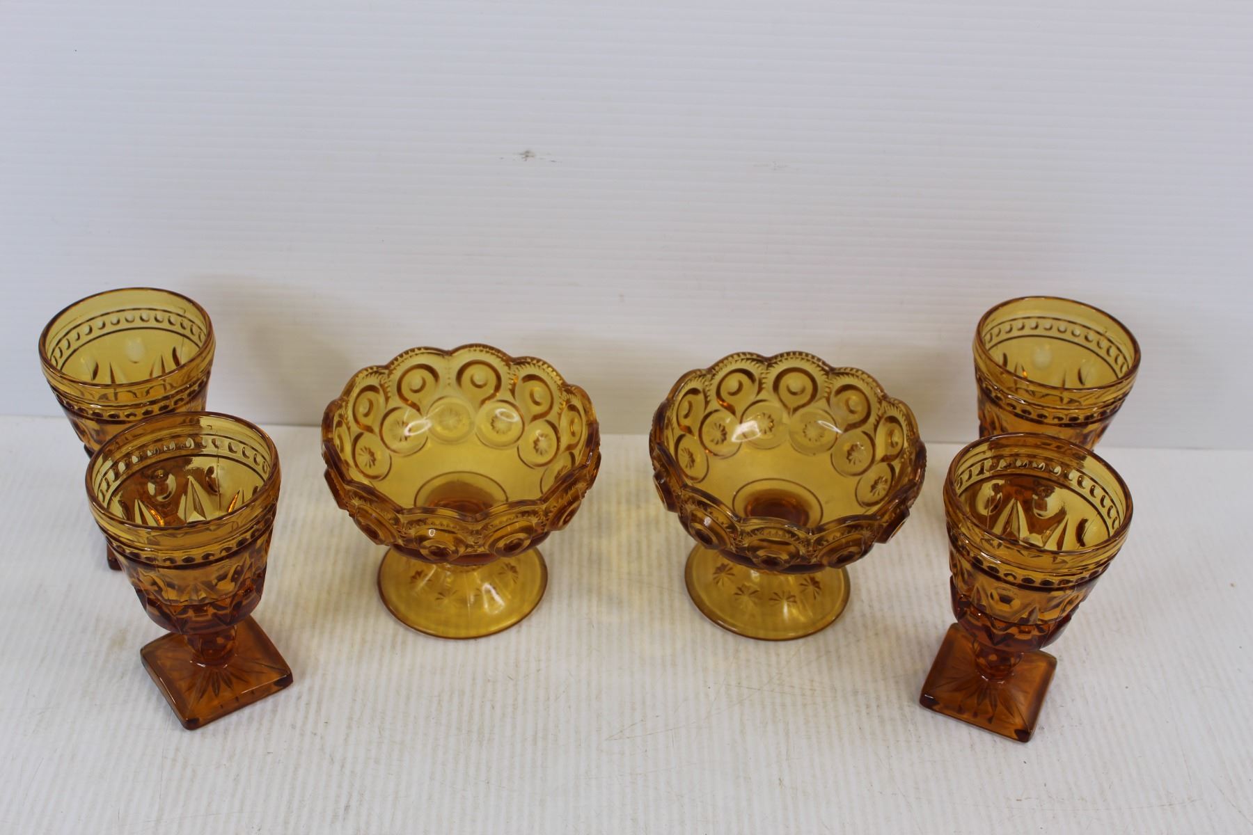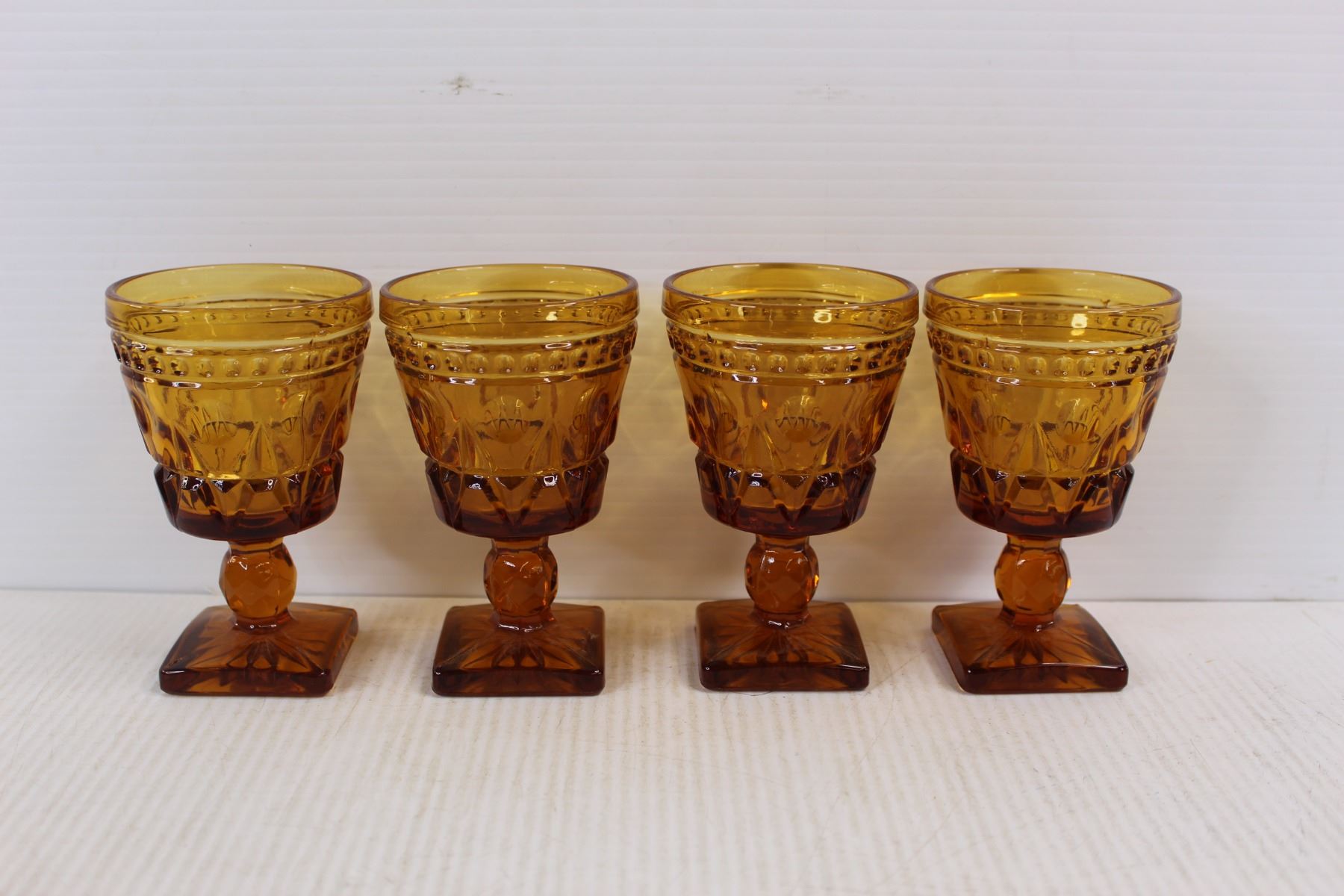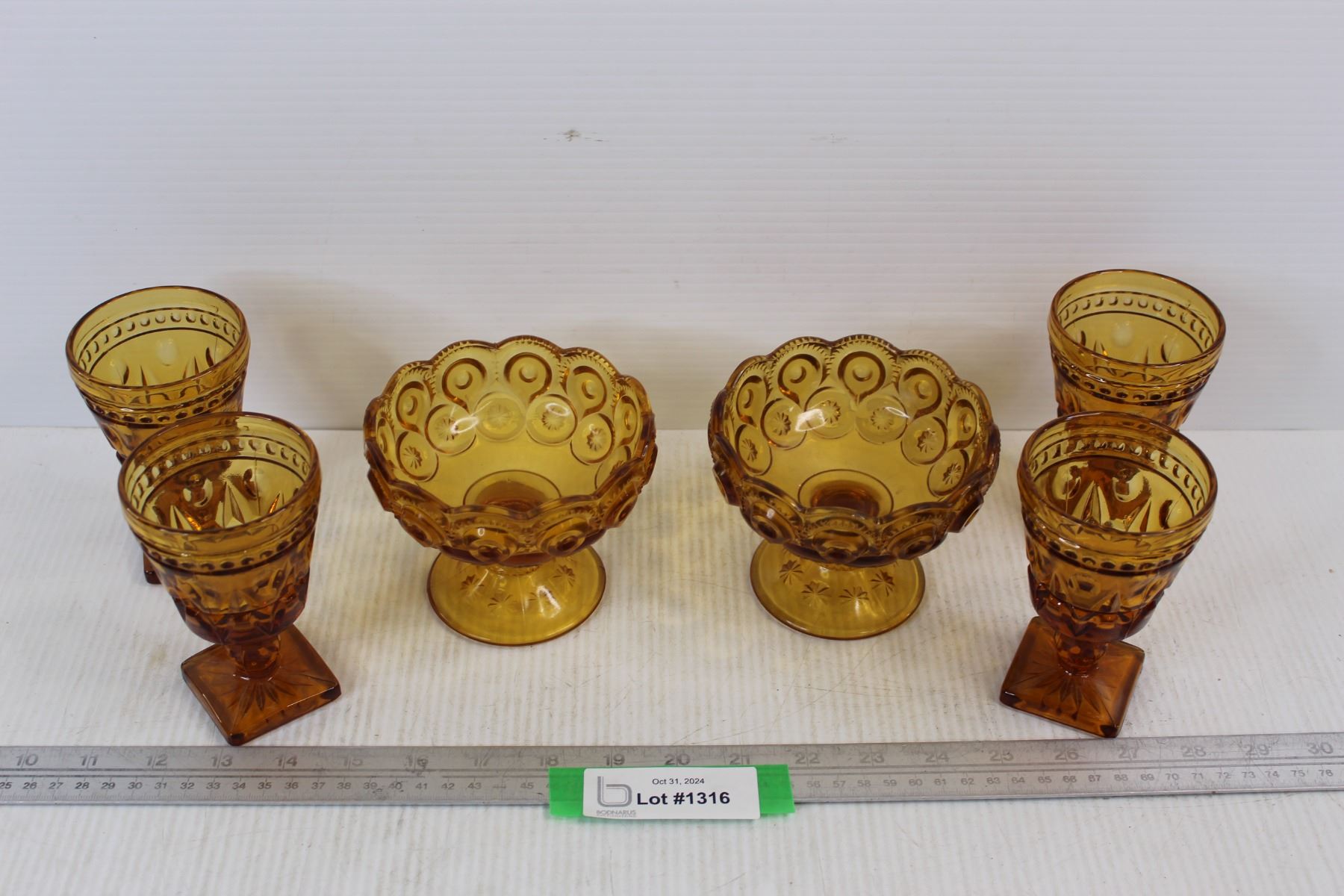 (6) Amber Glass Items - (4) Pedestal Wine Glasses, (2) Compotes