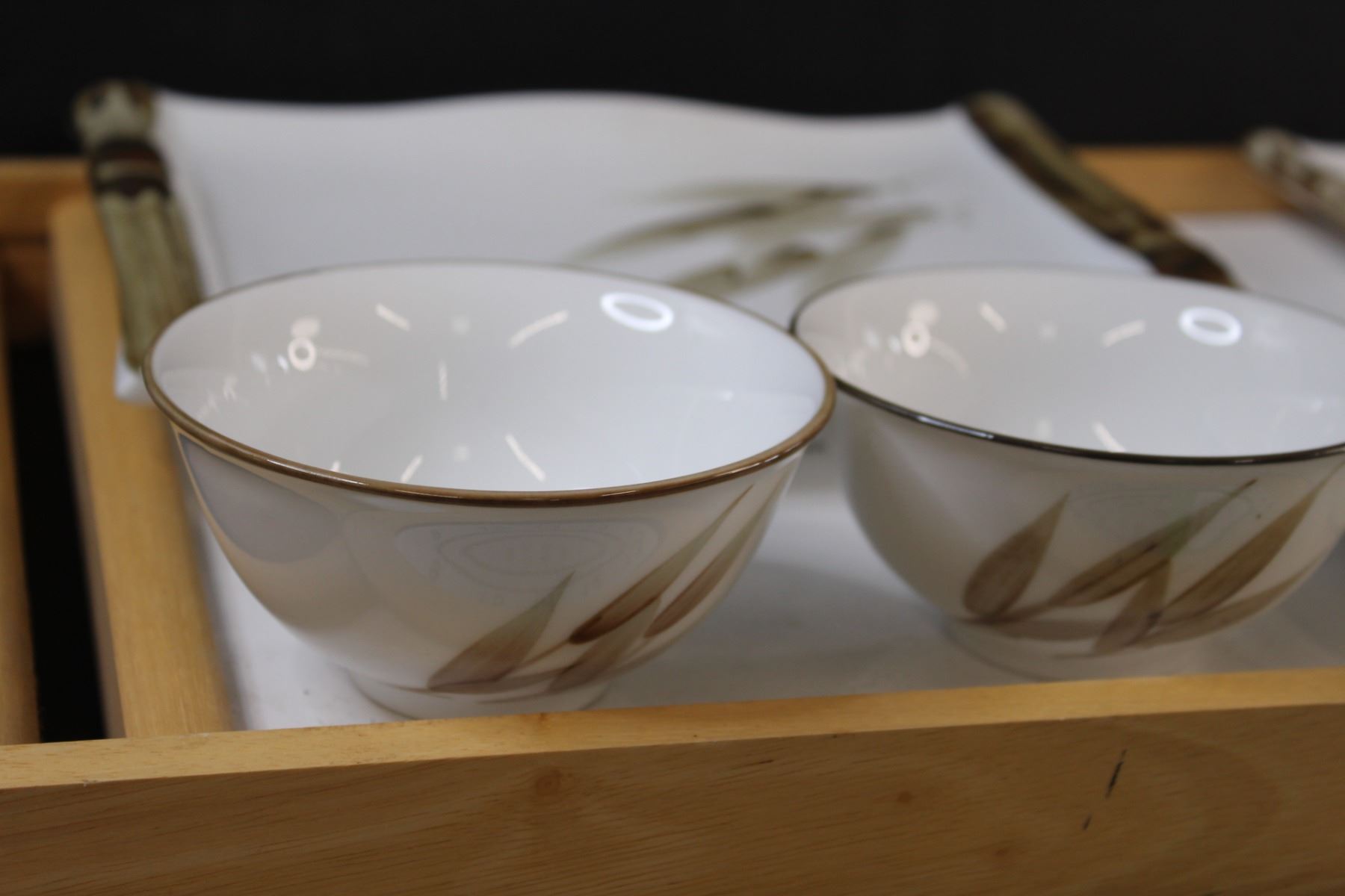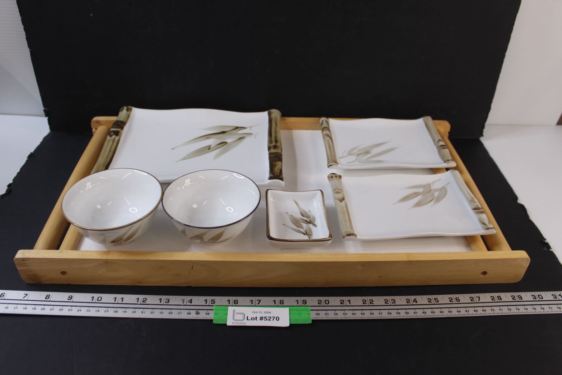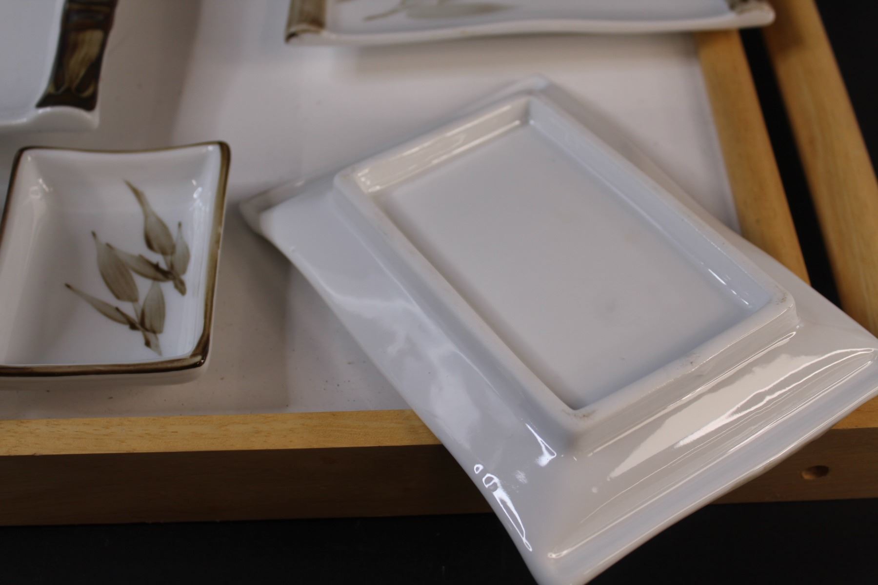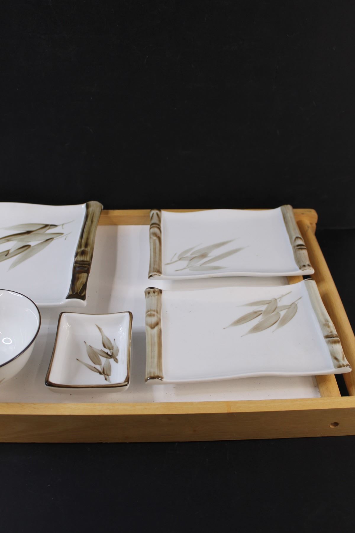 (6) Asian Themed Dishes (4) Plates (2) Bowls & Wood Serving Tray