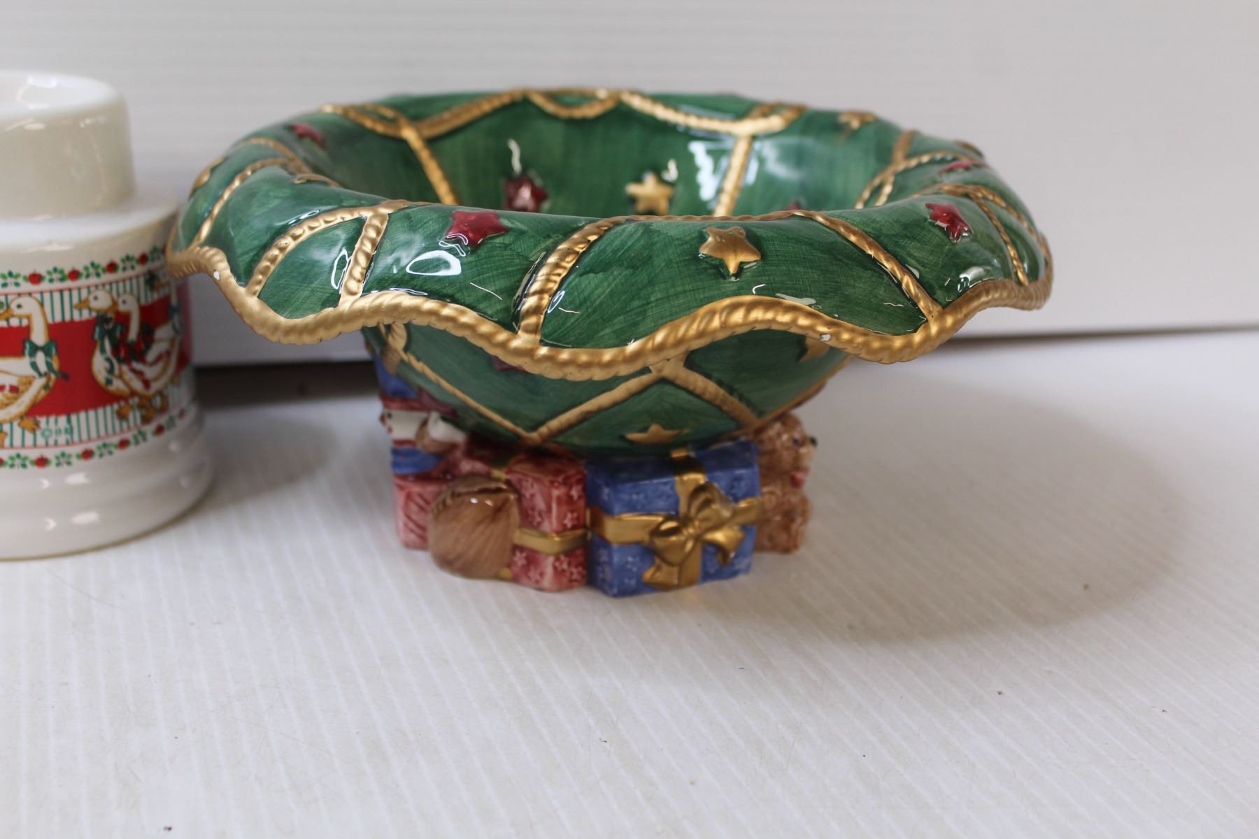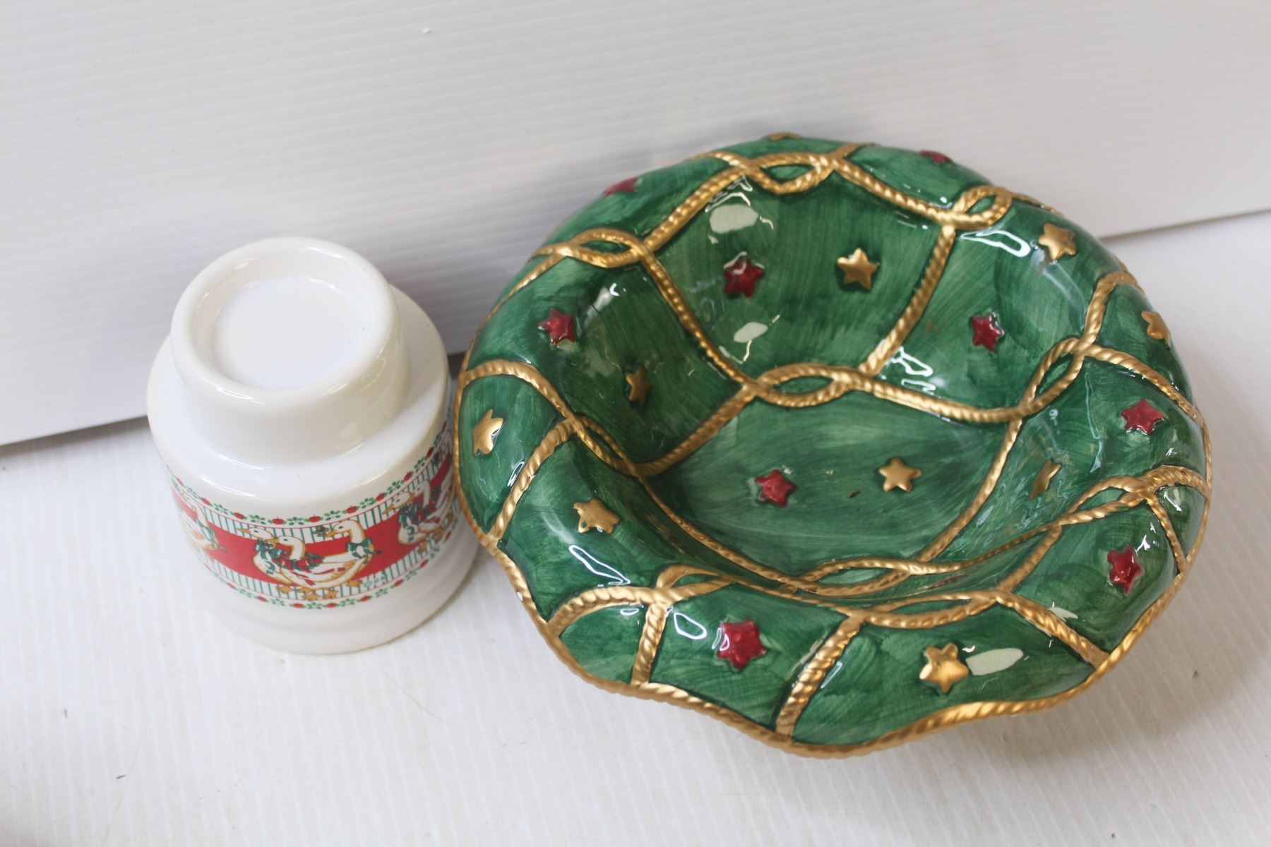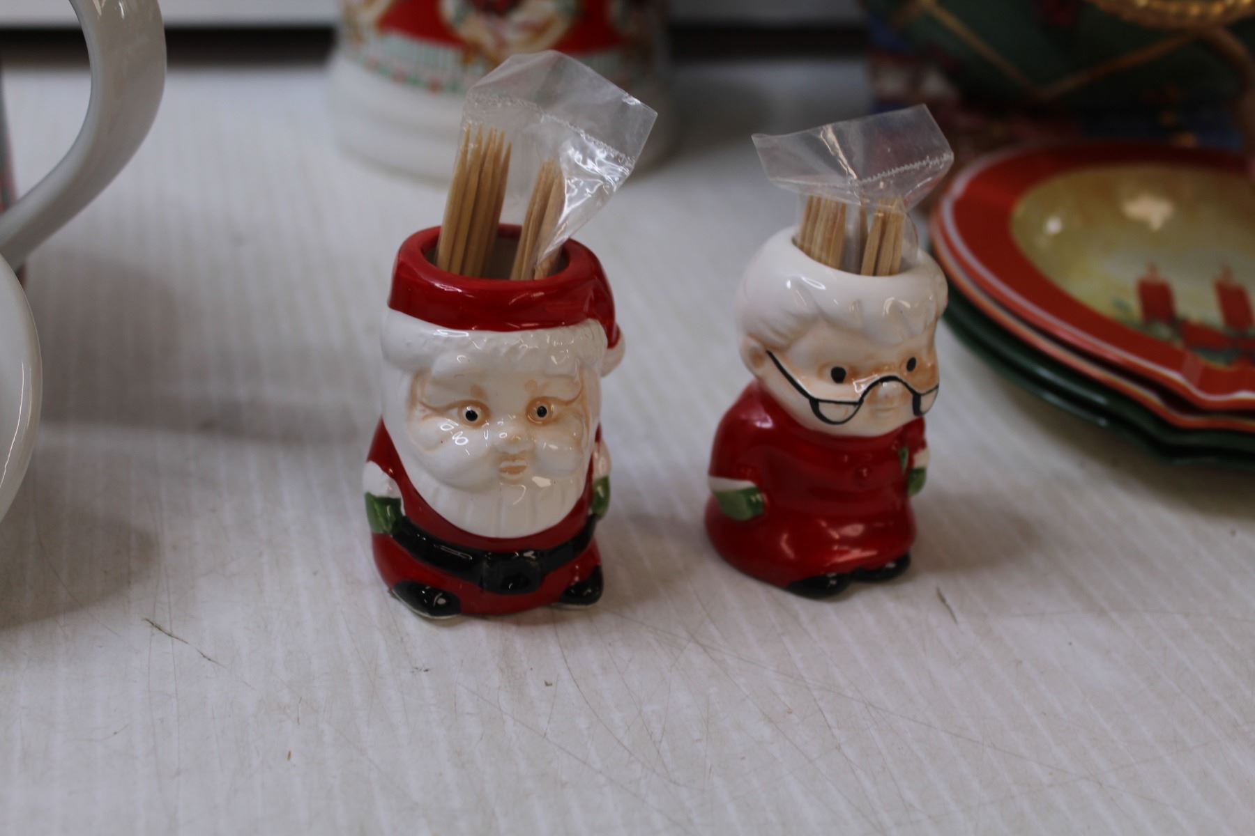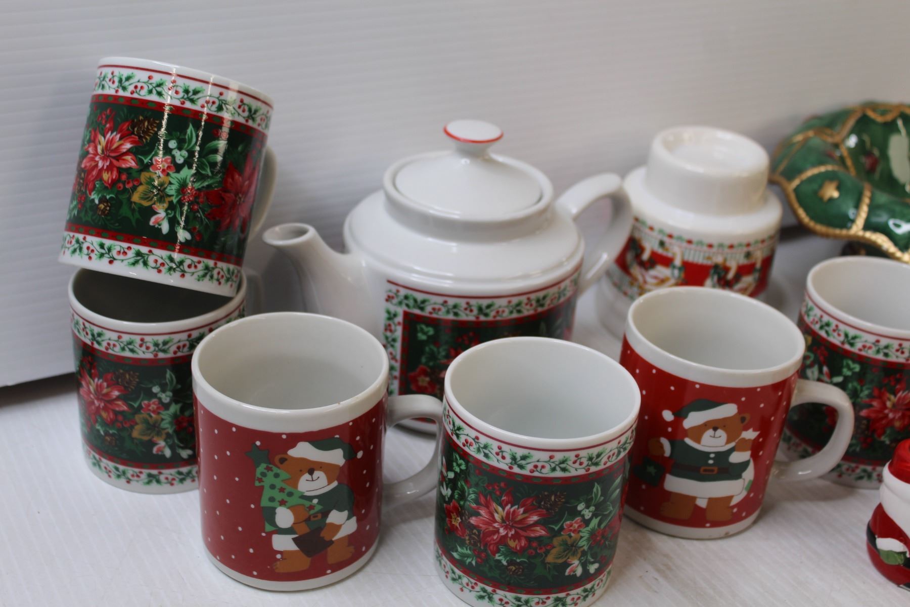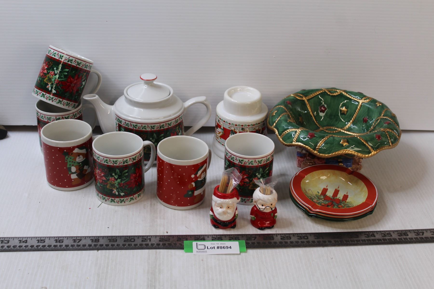 (6) Christmas Mugs, Christmas Tea Pot, Mr & Mrs Claus Toothpick Holders, Tea Light Holder, (4) Ashtrays, Christmas Centre Display Bowl